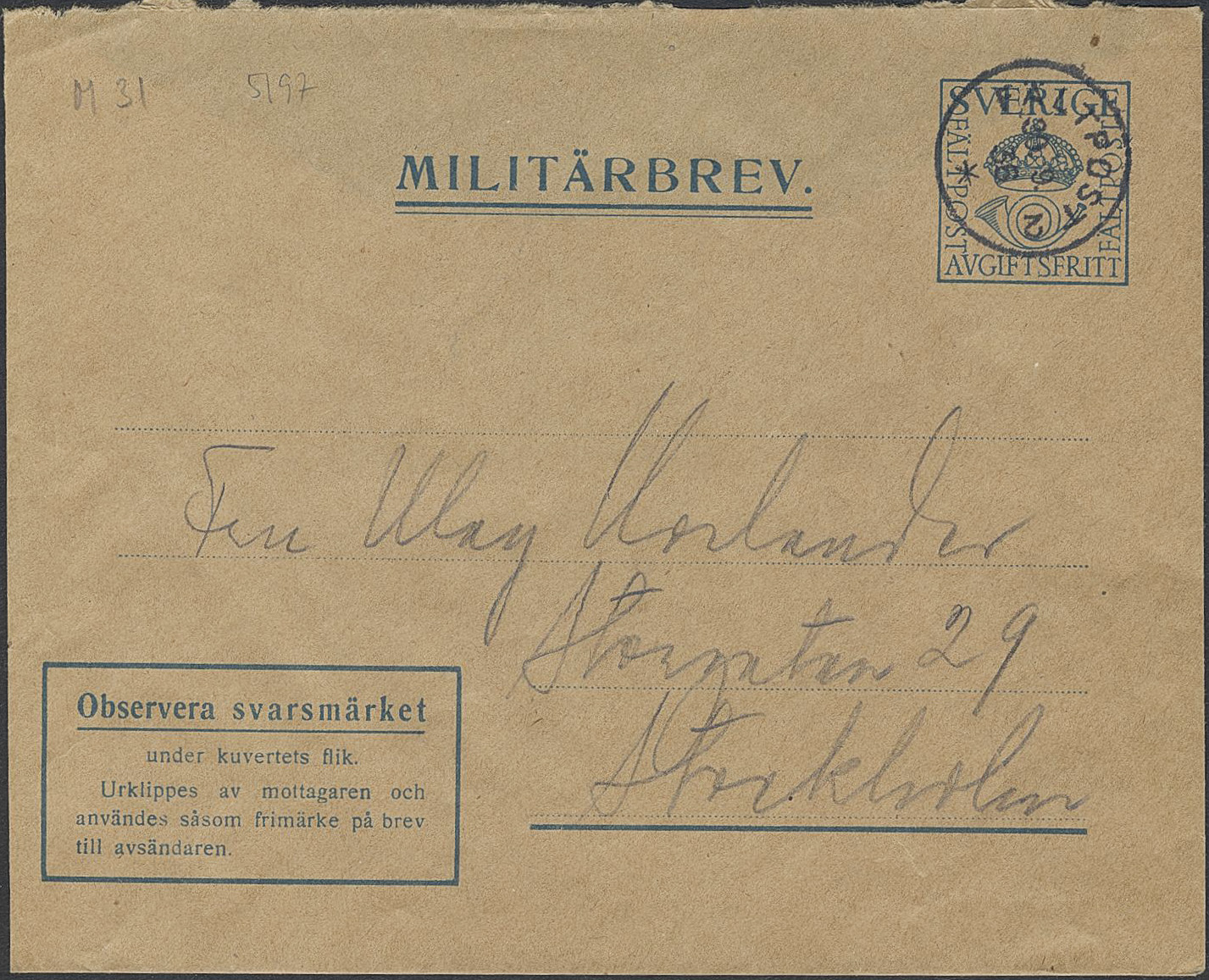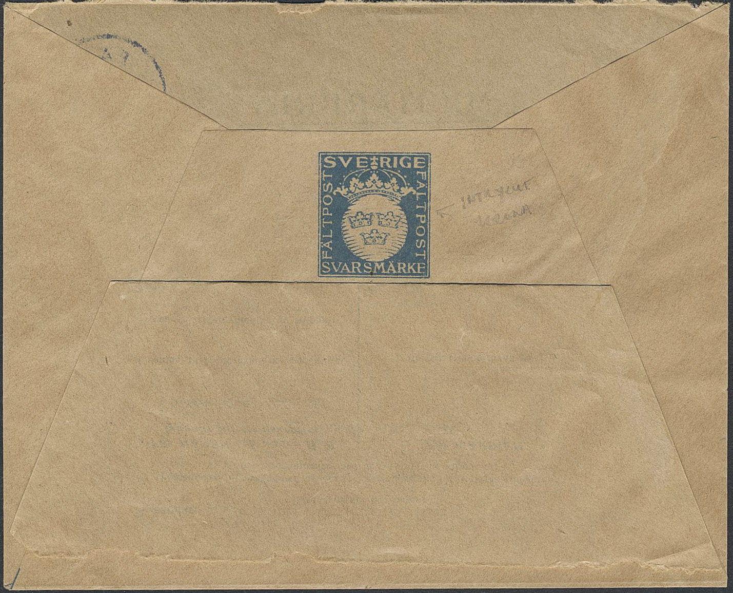 Sweden. Military postal stationary Facit M2v6, Military cover with reply-stamp with retouch II 'Gash in Crown', sent from FÄLTPOST 30.9.36 to Stockholm. Very scarce, allegedly only one recorded.