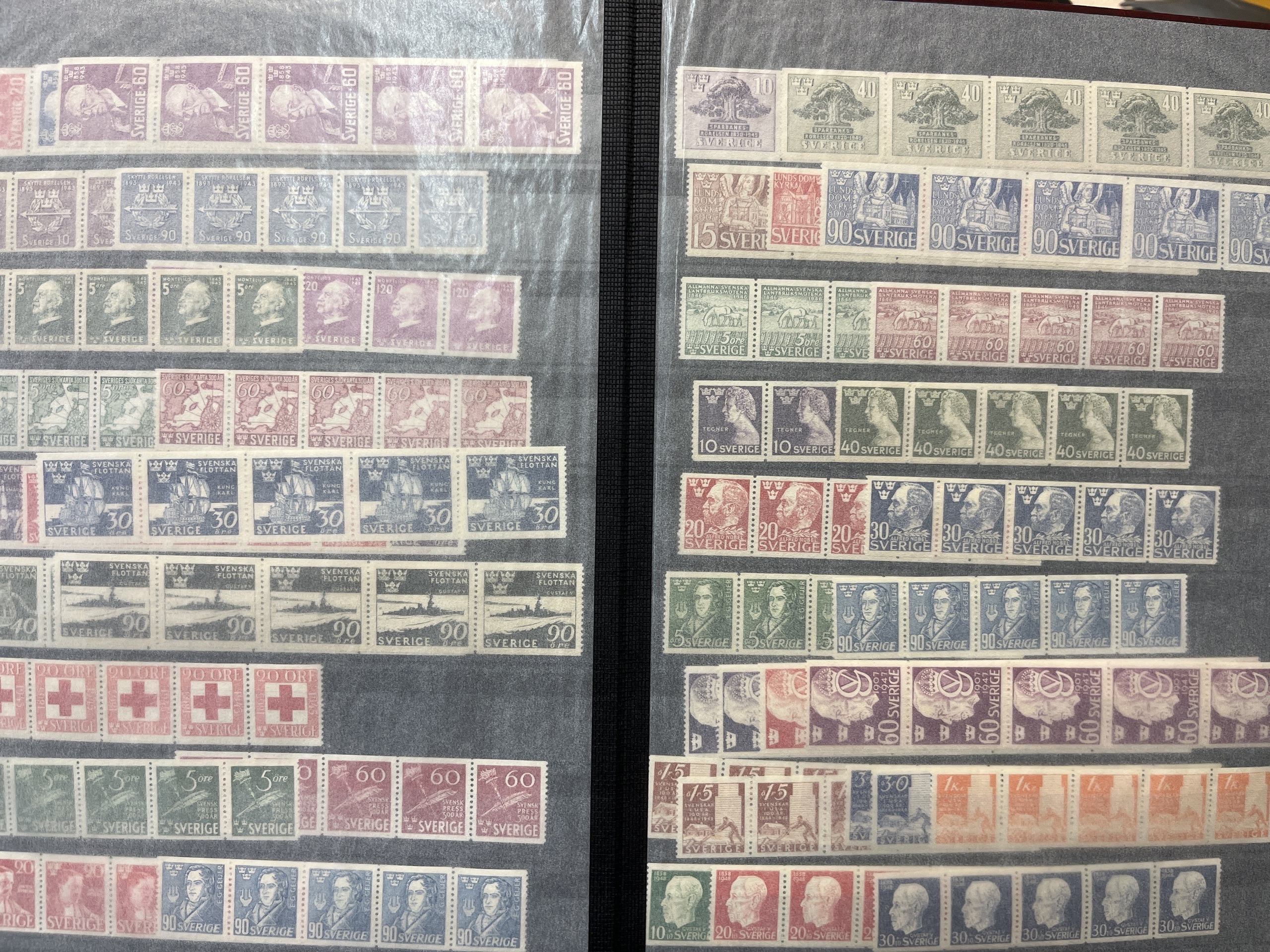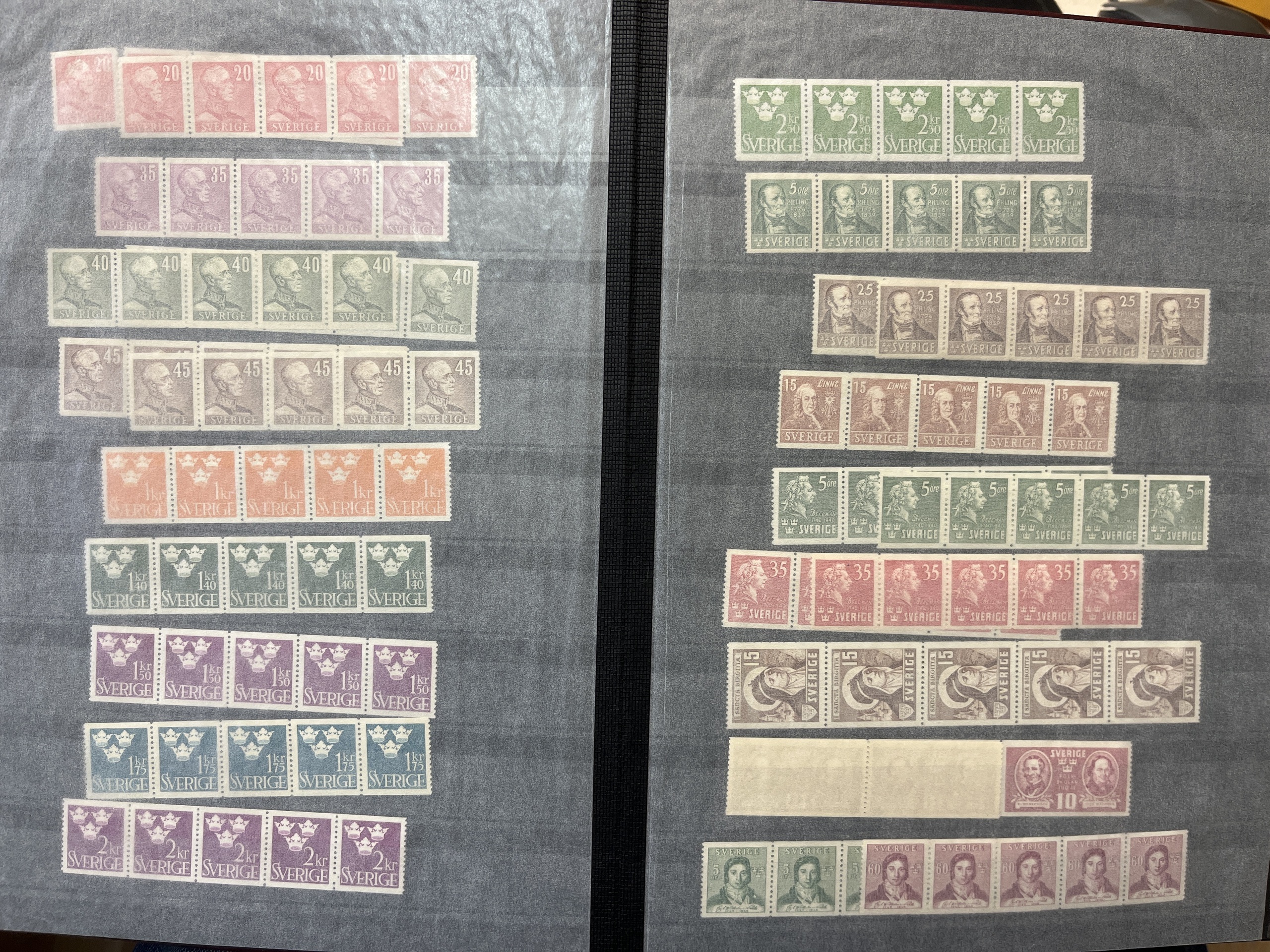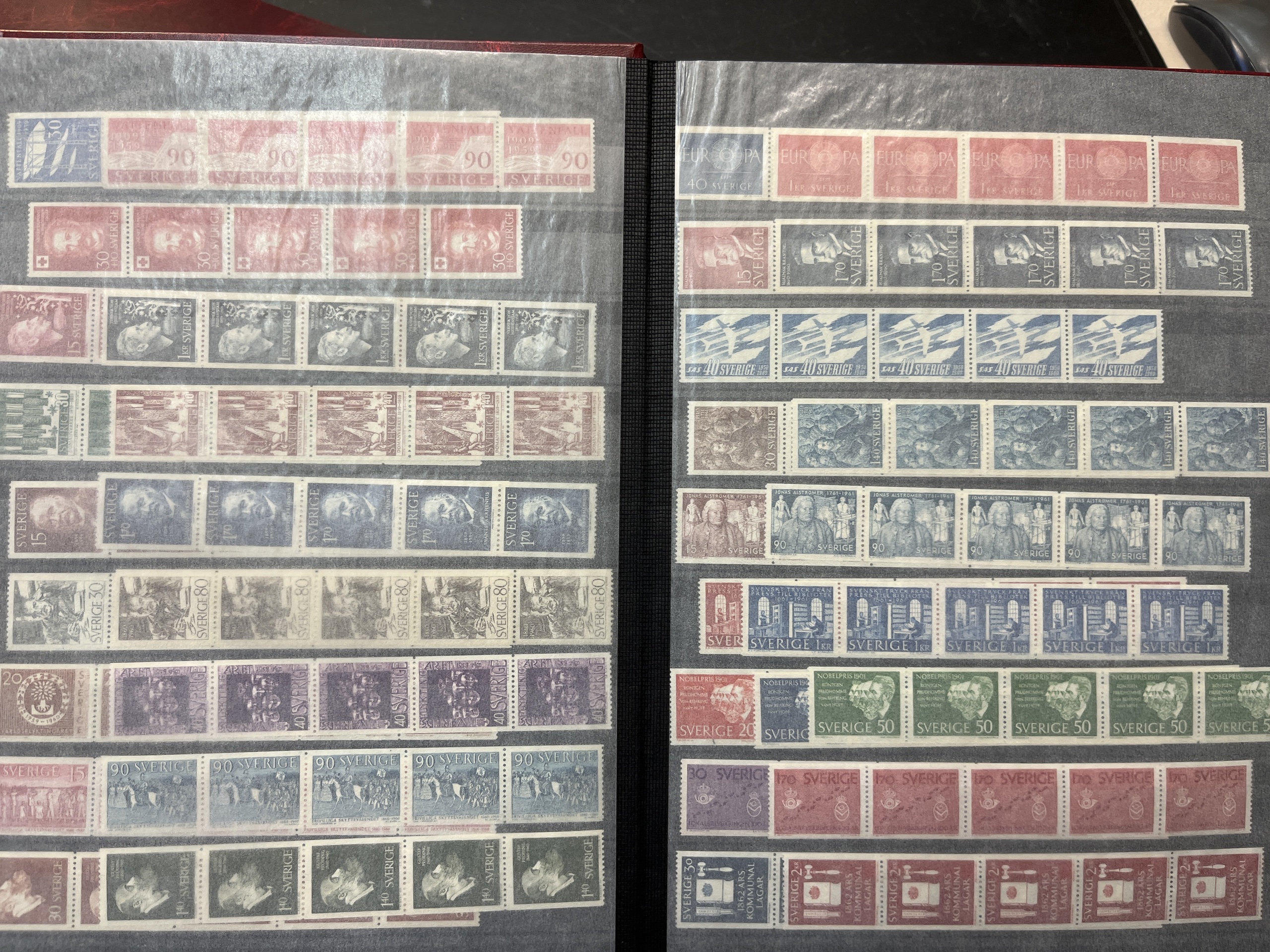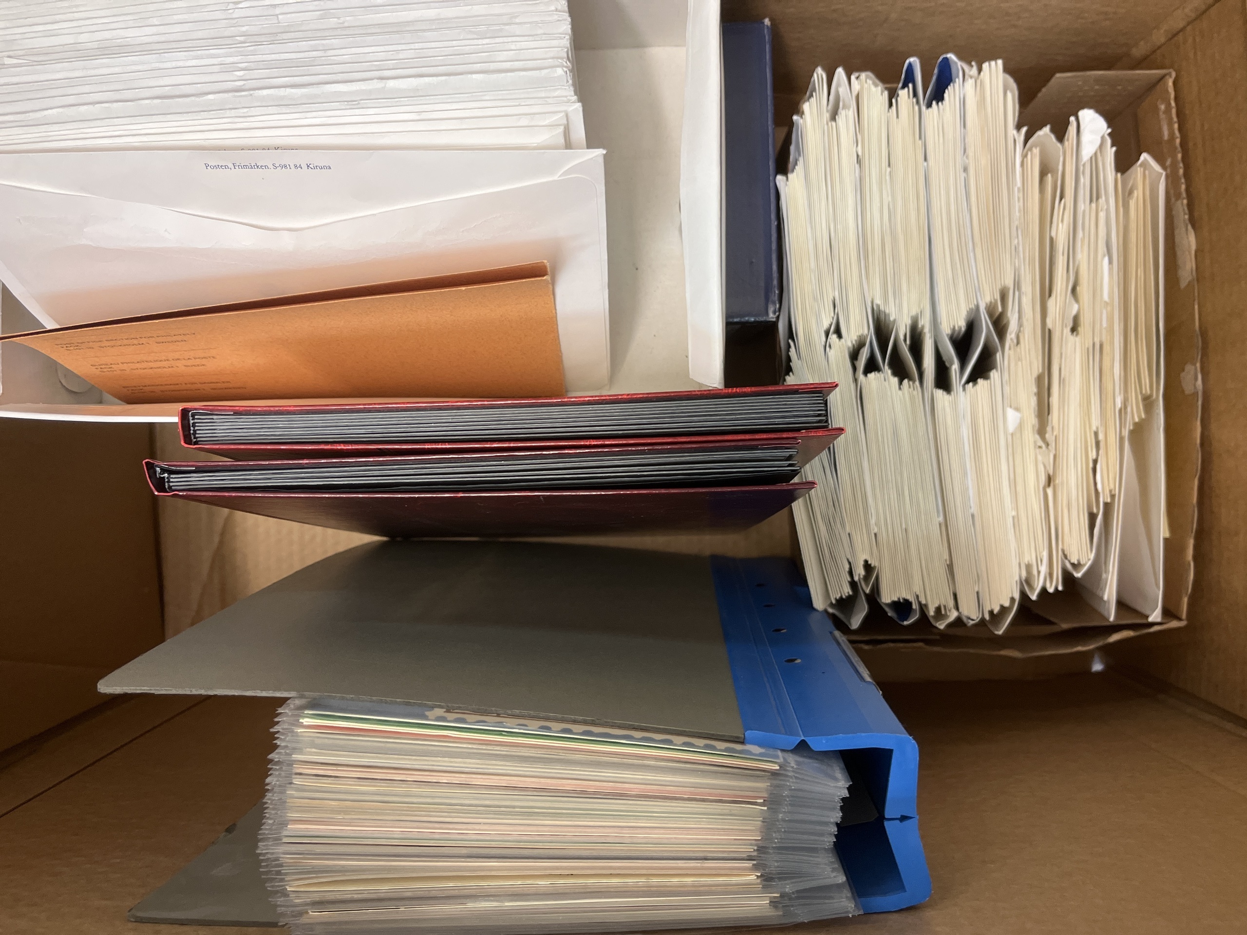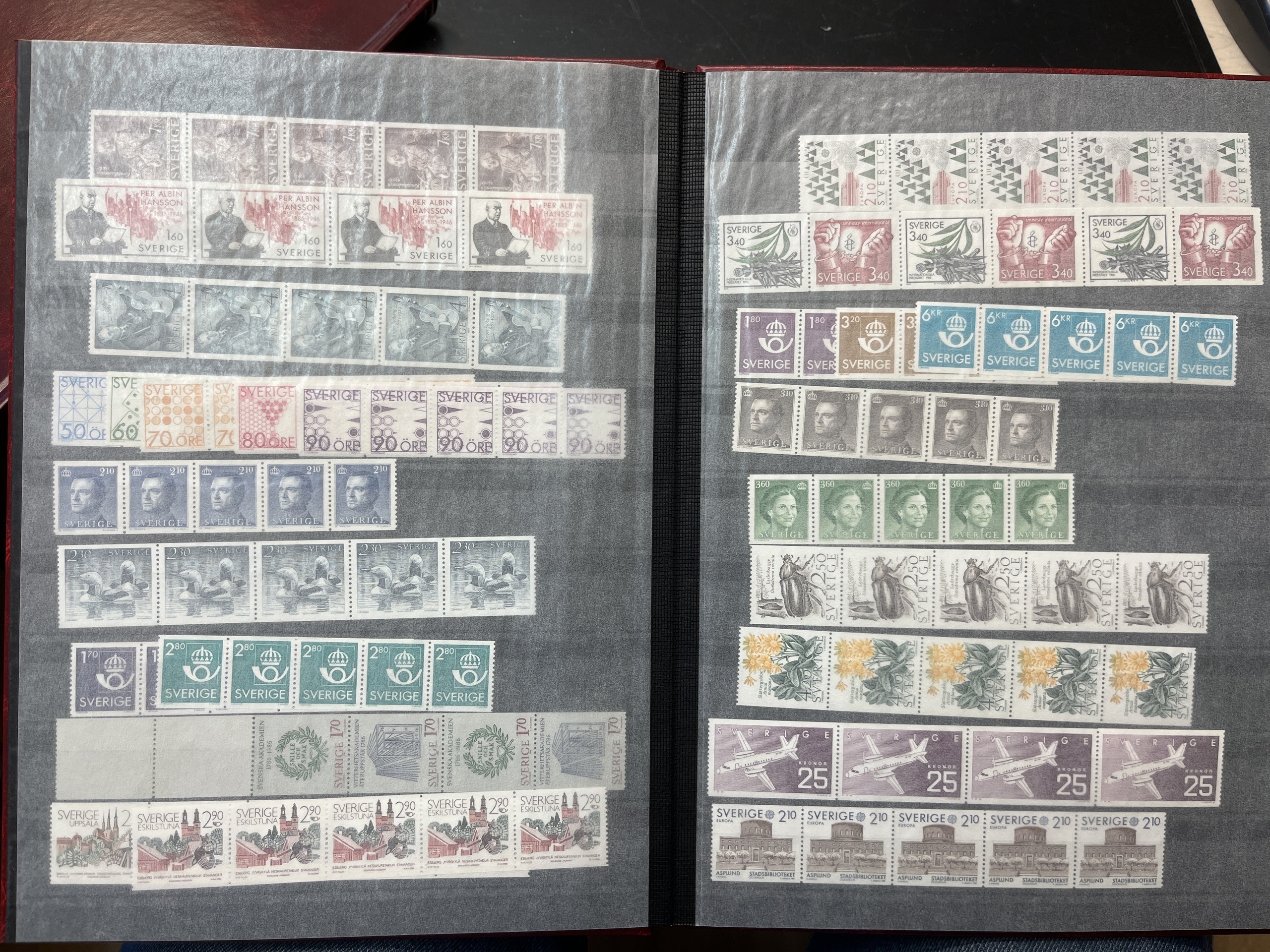 Sweden. ★★. Two stockbooks with strips of five plus album and box with PT-cards, also FDCs 1963–1992. Approx. 12 kg.