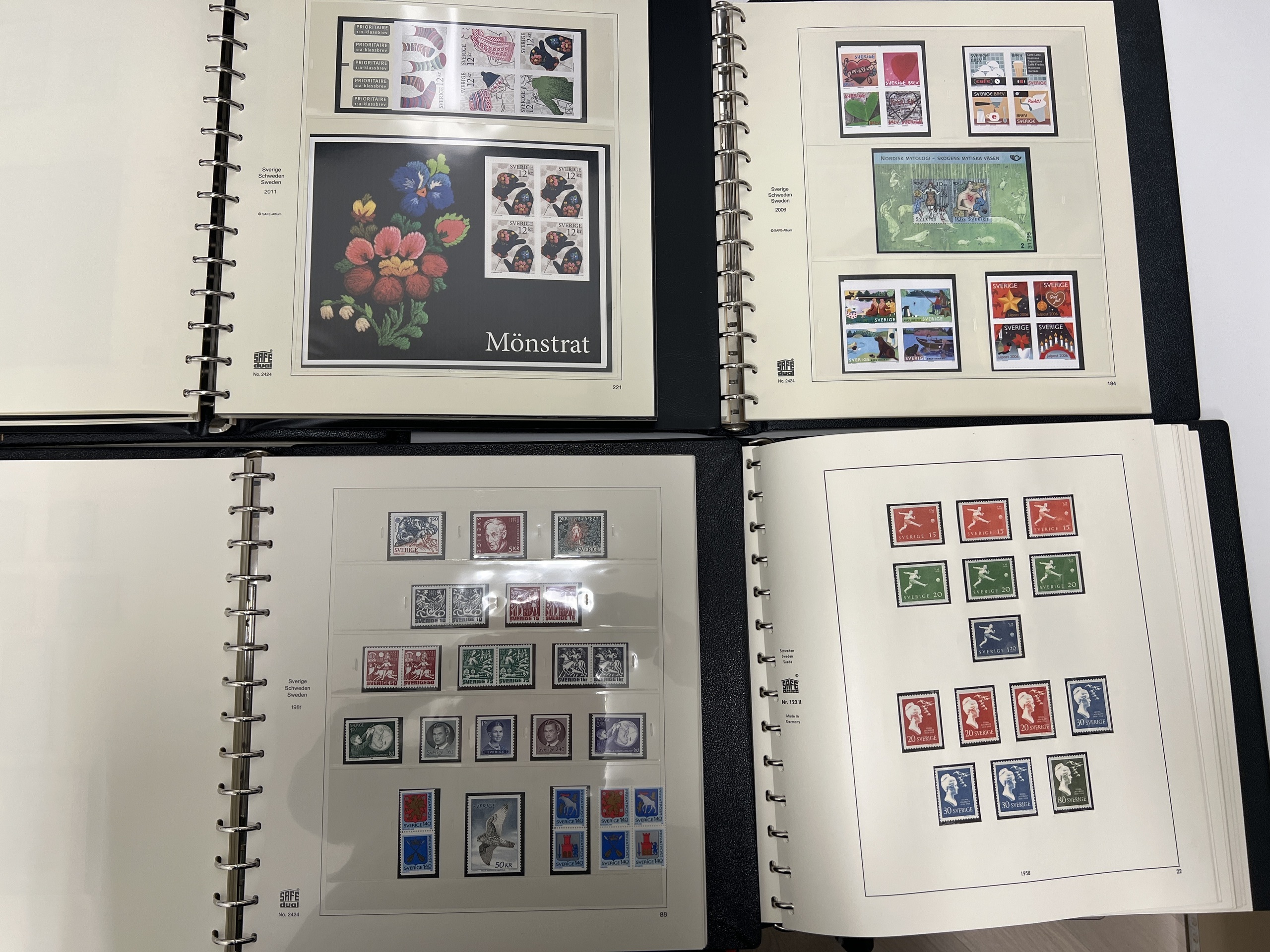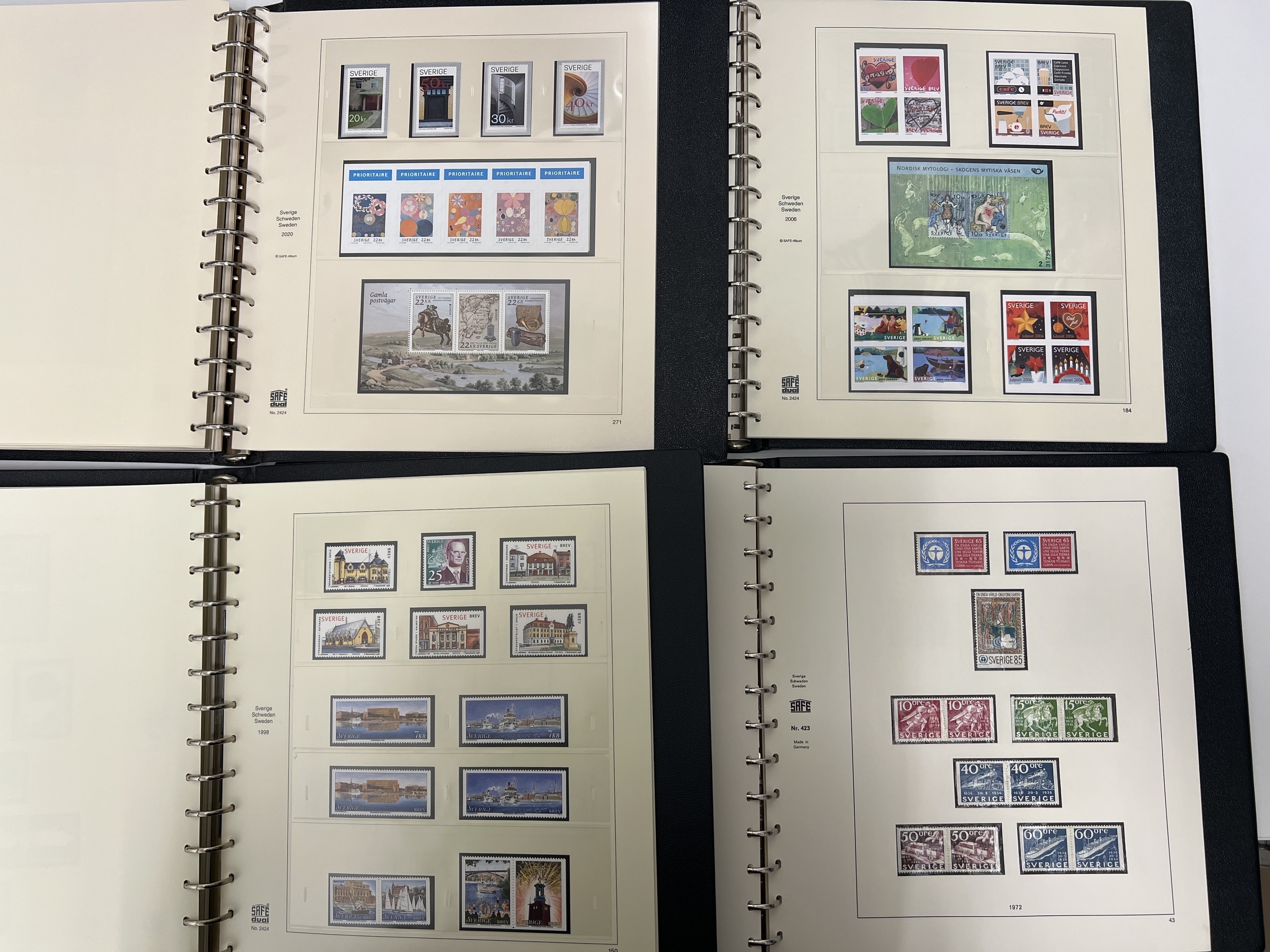 Sweden. Sweden Face value collection 1938–2020 in six SAFE albums Dual from 1975 with stamp mounts (1000s). Almost complete from 1951 up to 2020, including 814 'Sverige BREV' and other good franking denominations counted from year 2000 of 9375. 54 discount stamps. Total franking value above 27000