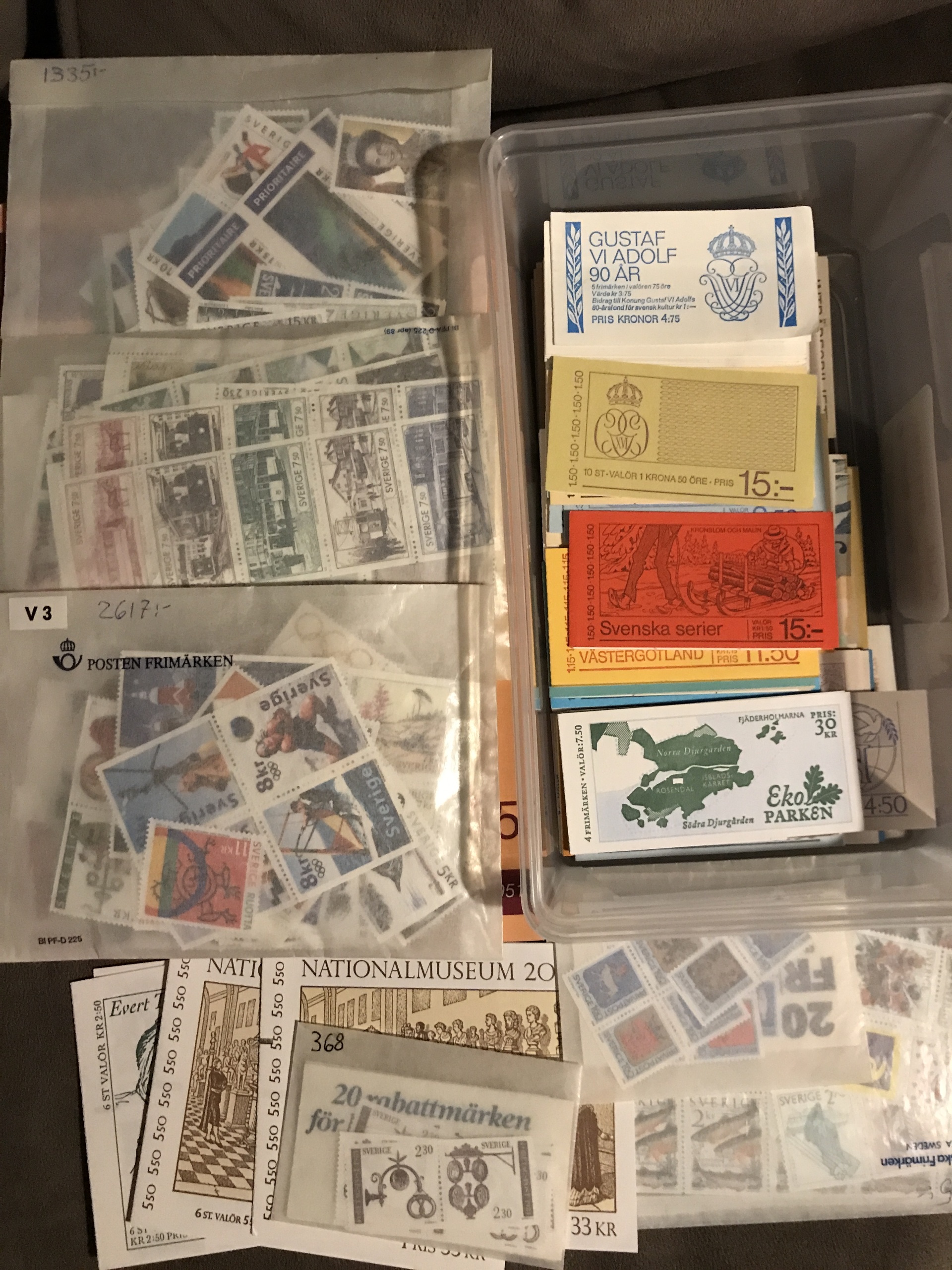 Sweden. Face value. Stamps and booklets incl. much 1990s. Face value approx. 9800 + 94 discount stamps and 18 'Företagspost'.