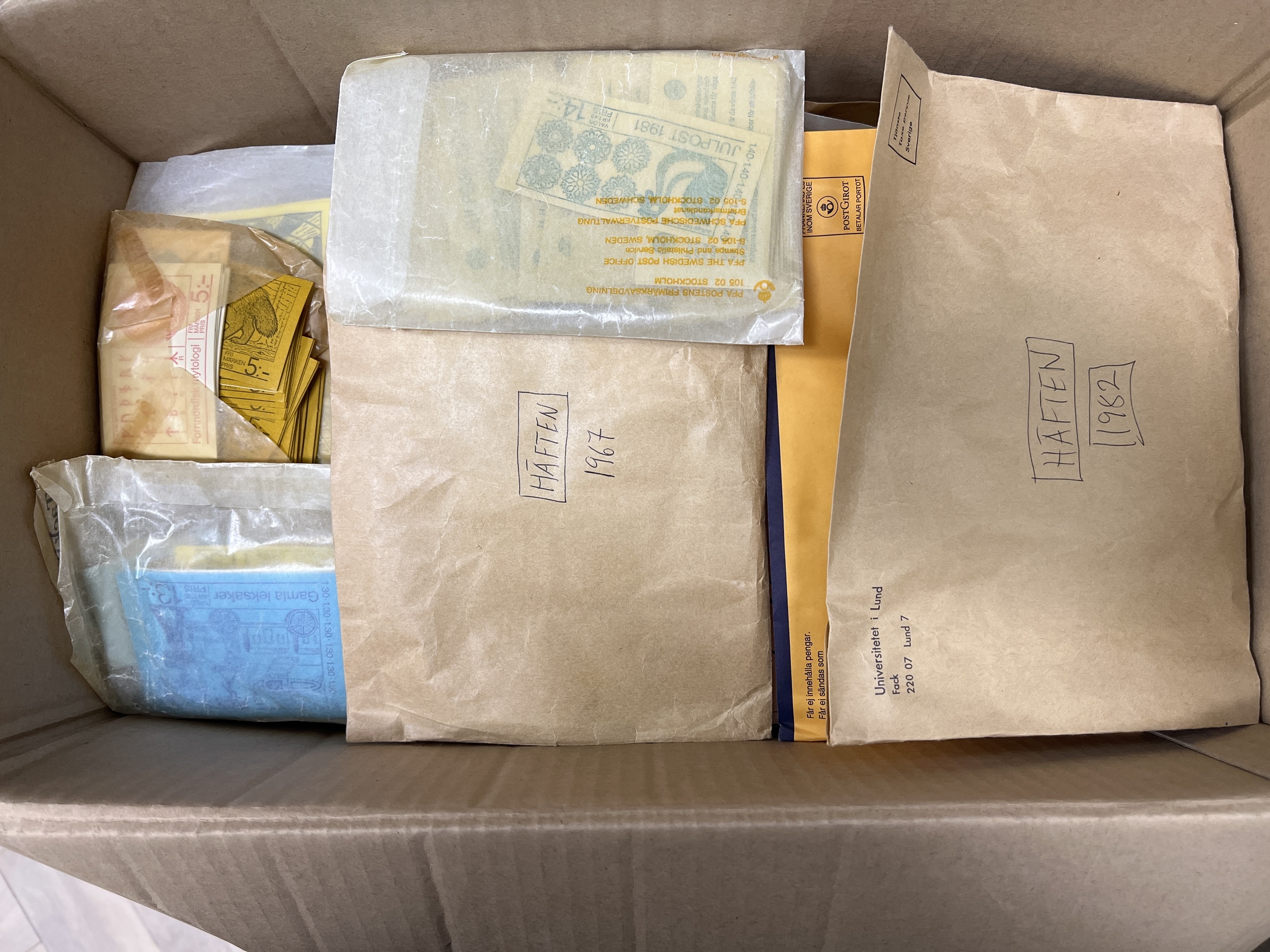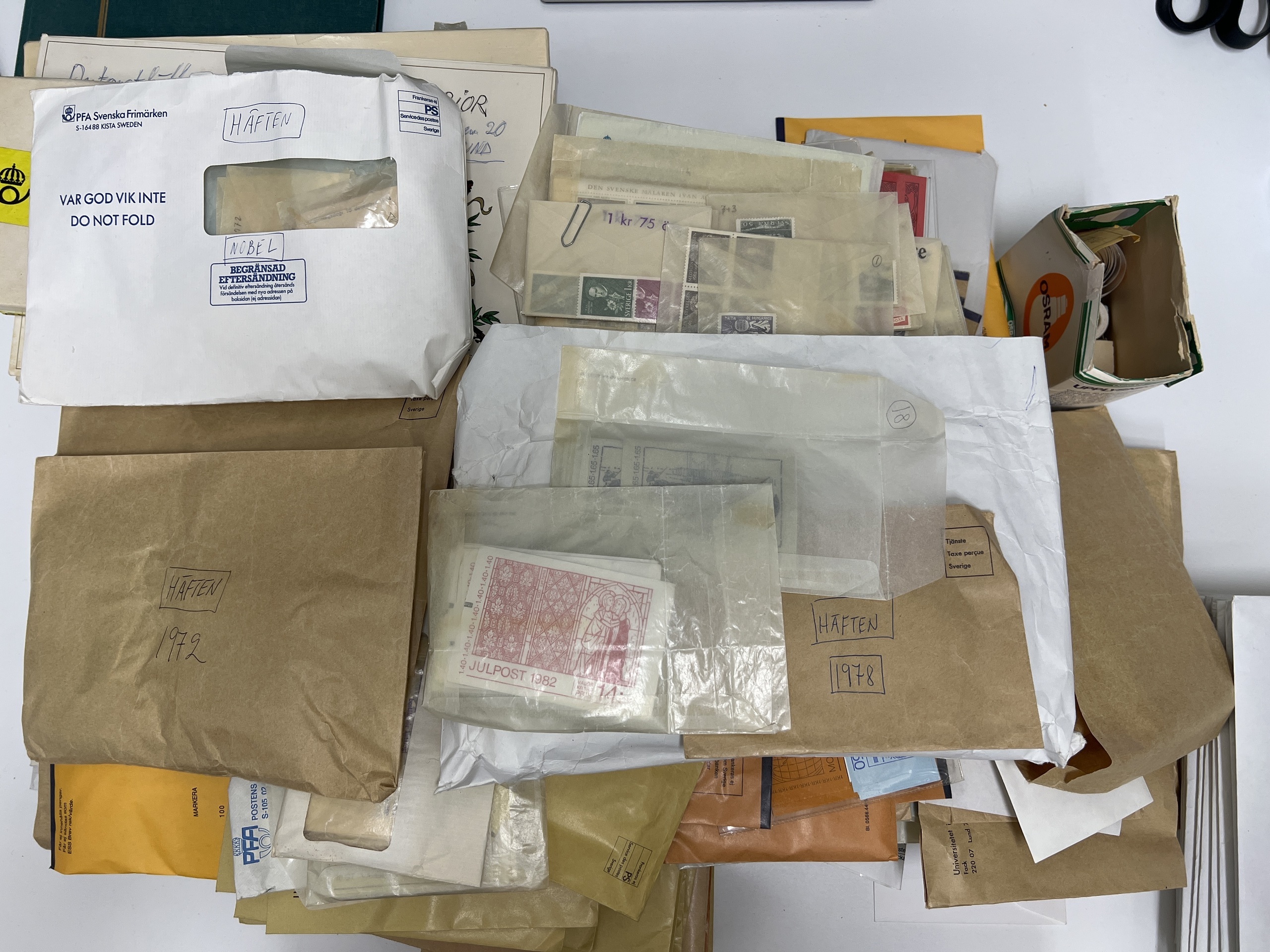 Sweden. Face value, accumulation in box. Huge face value, not counted, but should be well over 10000 kr, however mostly in lower deminitions from mostly 1960s to early 1980s in booklets and series. NO discountbooklets/stamps. Also some smaller box with older material 1940s–1950s and a subsciption in envelopes on the 2000s for some years including some 'Sverige BREV', and one yearset 2002. Approx. 9 kg. (1000s)