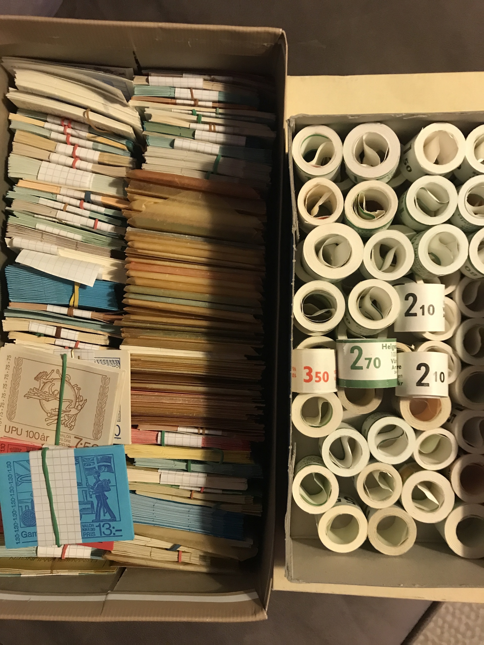 Sweden. Face value. Box with about 55 coils mainly 1970–1980s + booklets 1970s. Face value approx. 12500.