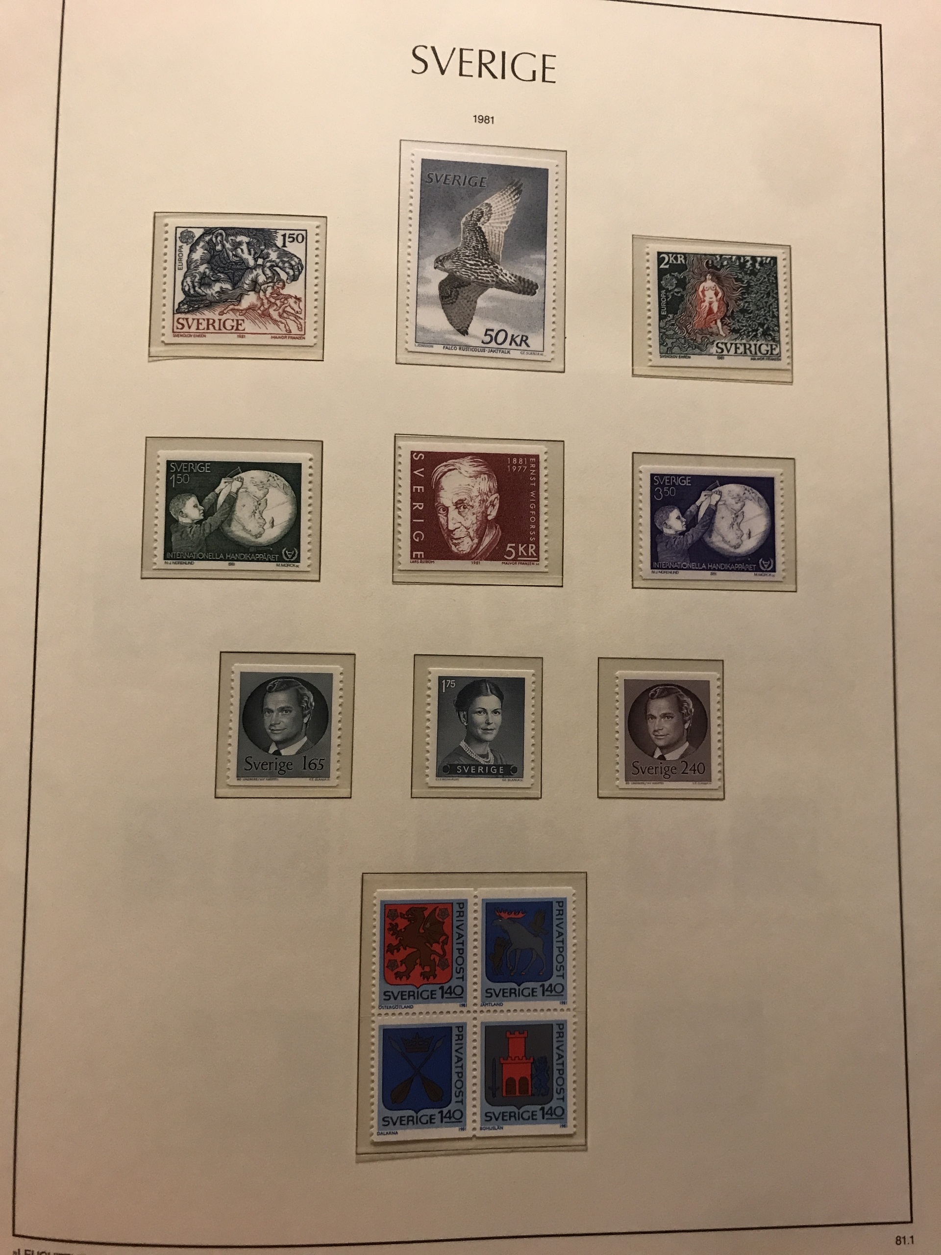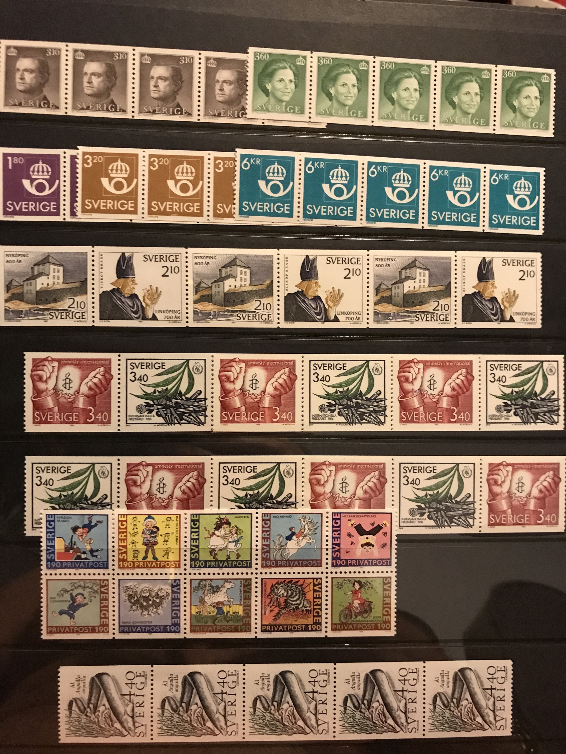 Sweden. Face value. For Visir binders with mostly stripes and some booklets 1970s–1980s + coll. 1970–1982 in Leuchtturm album. Face value 8600 + 60 discount stamps. Approx. 8 kg.