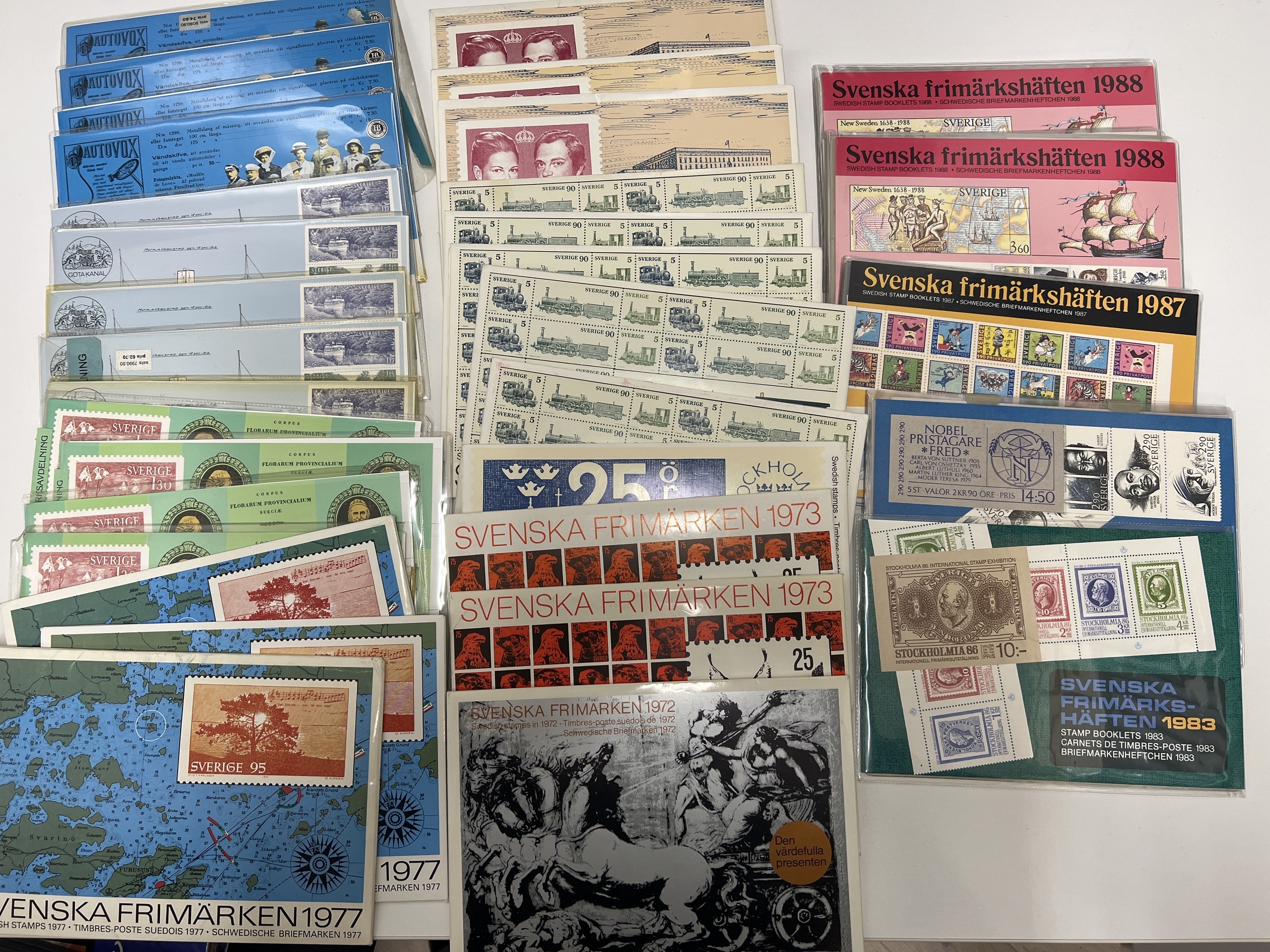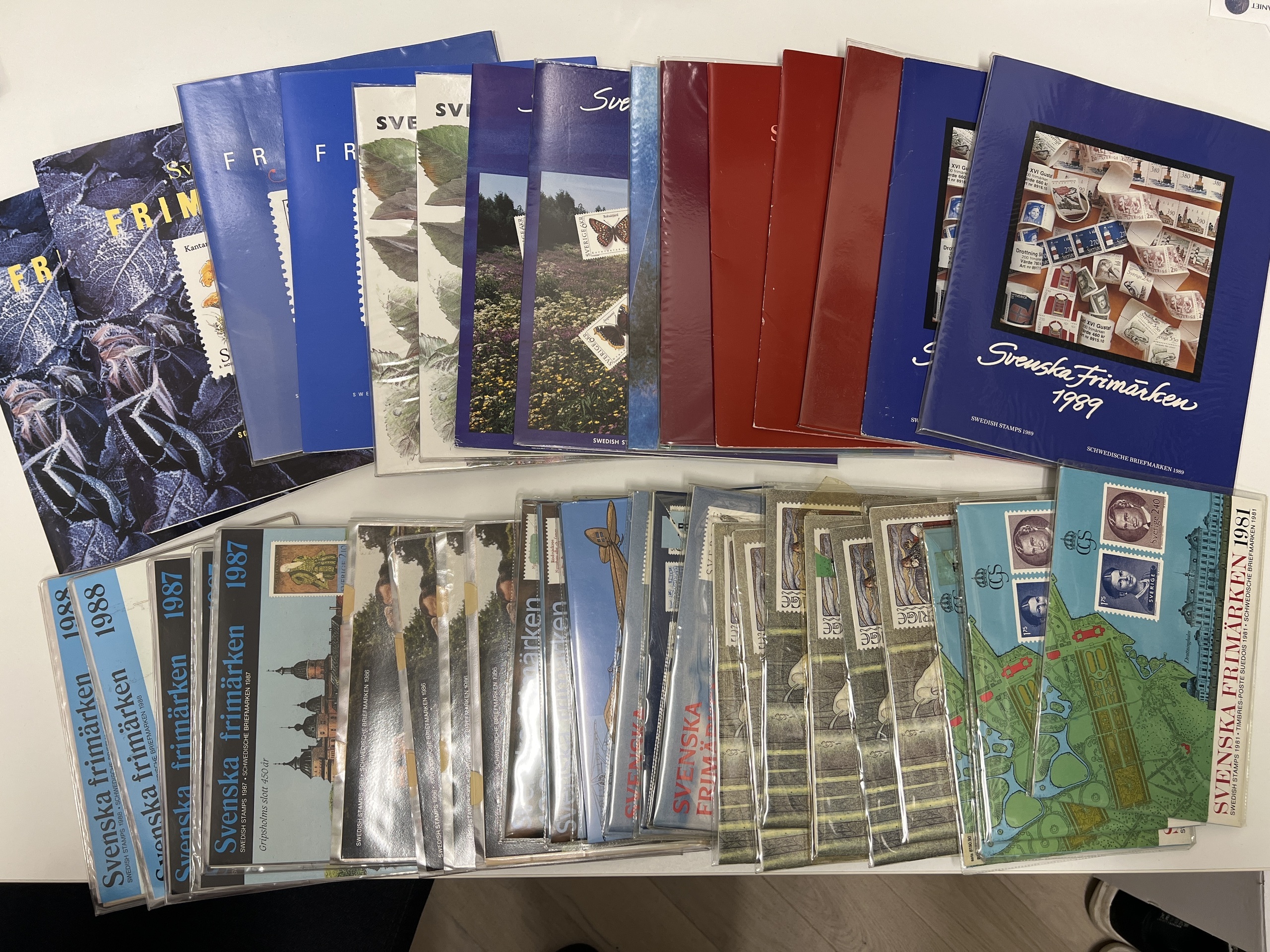Sweden. Sweden Year sets accumulation 1972–1996, including in total 184 discount stamps and five booklets. Face value for rest about 8000. Year sets with stamps. 1972 (1), 1973 (2), 1974 (1), 1975 (5), 1976 (3), 1977 (3), 1978 (4), 1979 (5), 1980 (4), 1981 (4), 1982 (6), 1983 (3), 1984 (2), 1985 (2), 1986 (4), 1987 (3), 1988 (2), 1989 (2), 1990 (3), 1991 (1), 1992 (2), 1993 (2), 1994 (2), 1995 (2), 1996 (2) year sets booklets, 1983–88, total 5 sets.