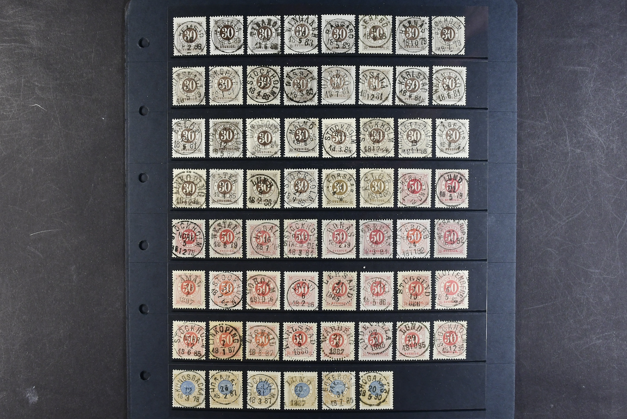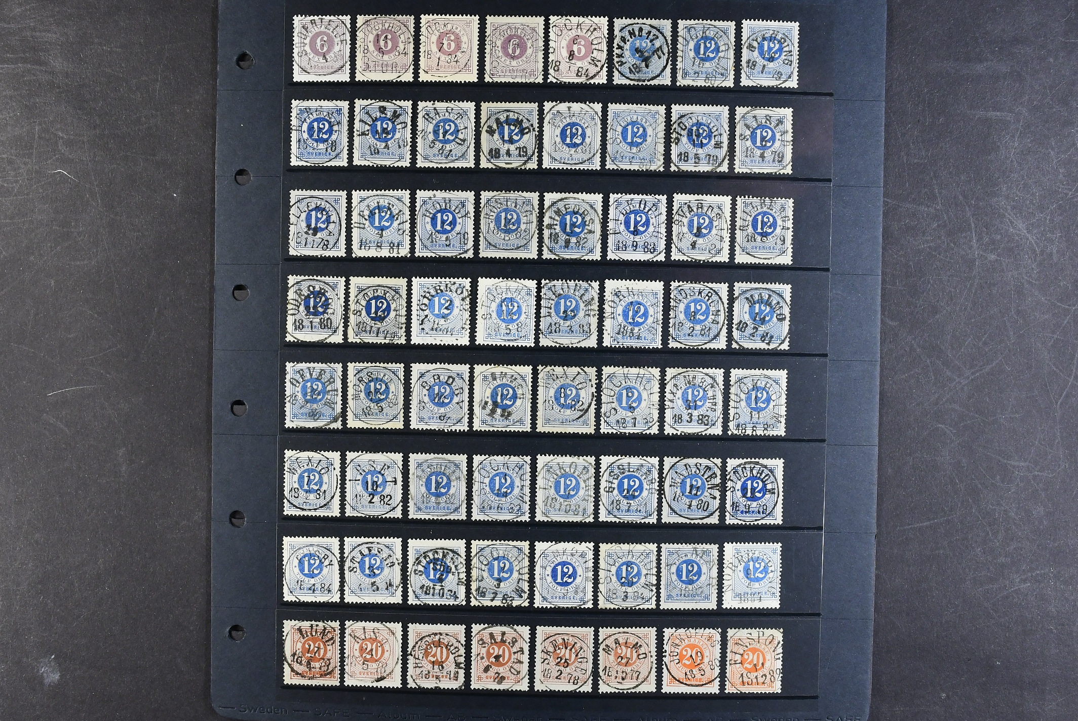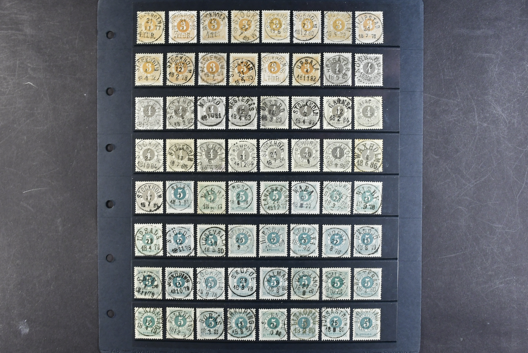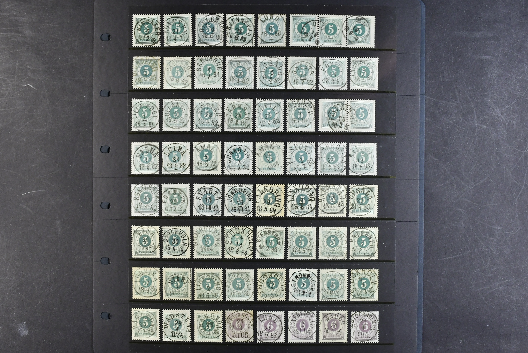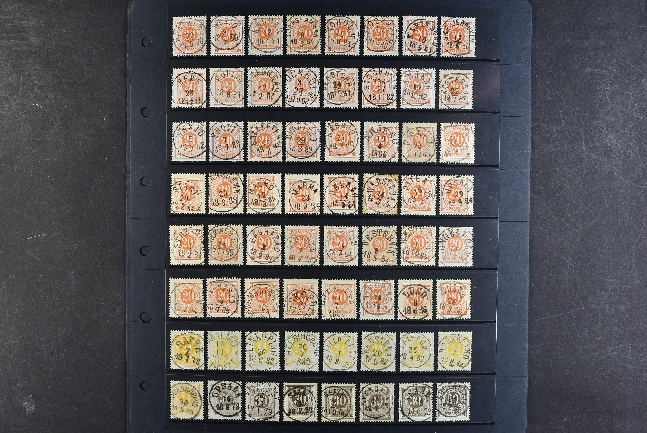 Sweden. Collection used CIRCLE TYPE 13 on visir leaves. Extra ordinary selection almost exclusively with superb–EXCELLENT cancellations. A few signed by O.P. Please inspect. (318)
