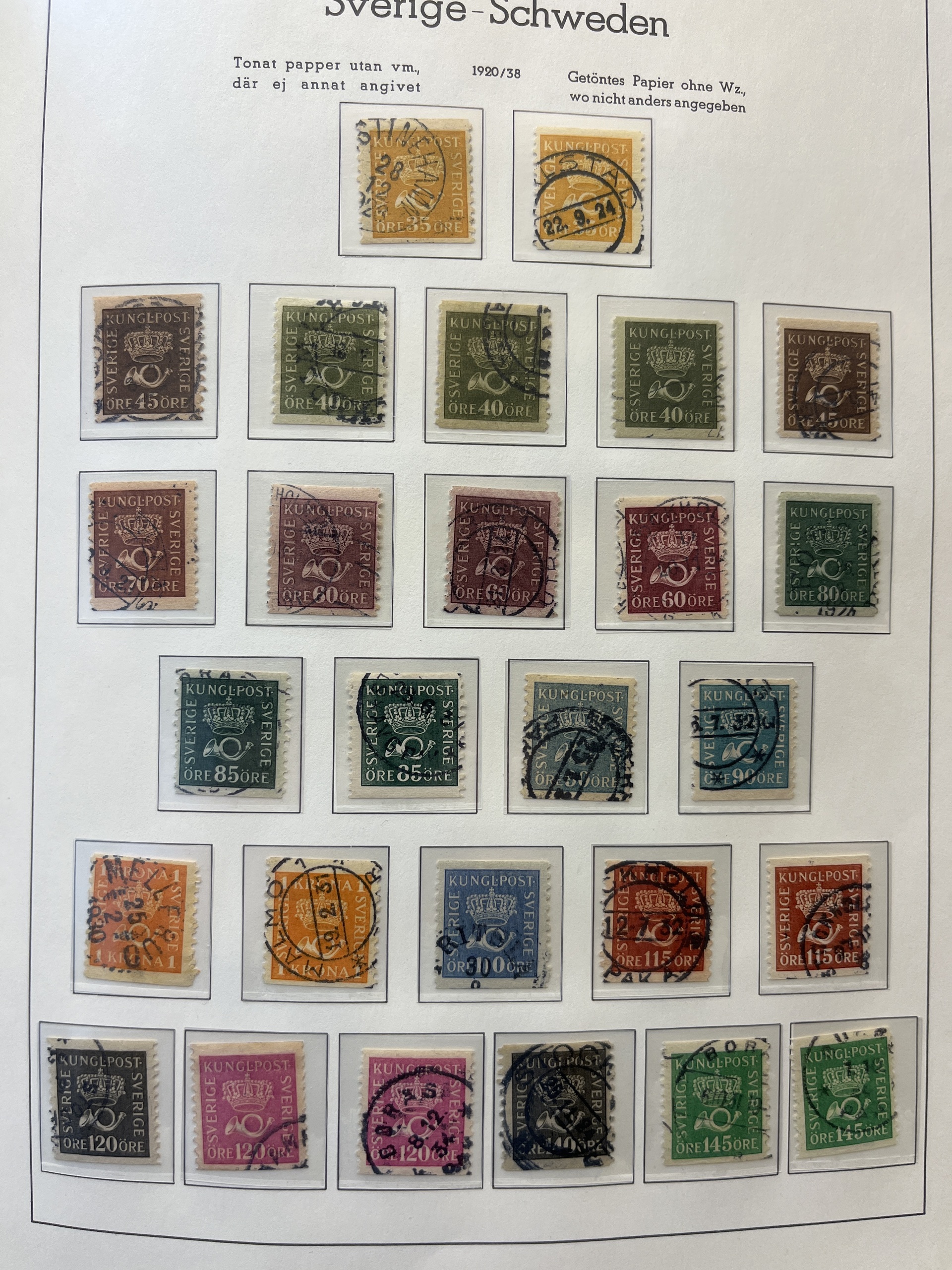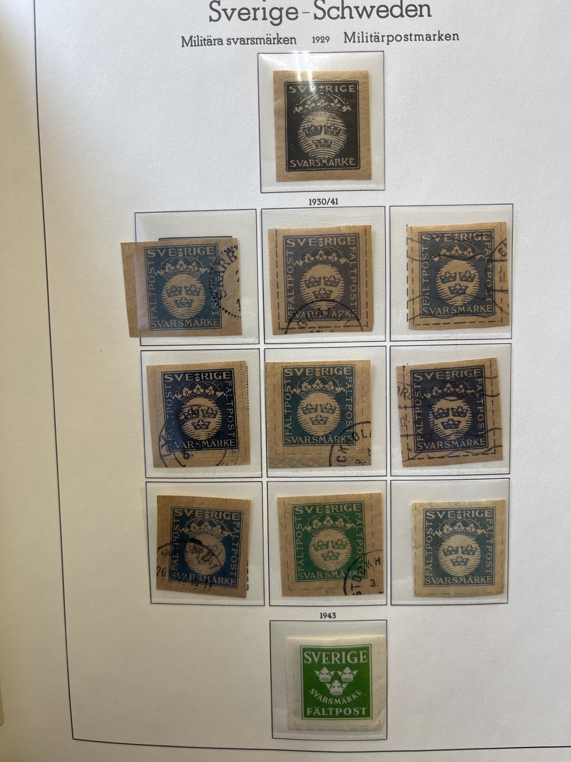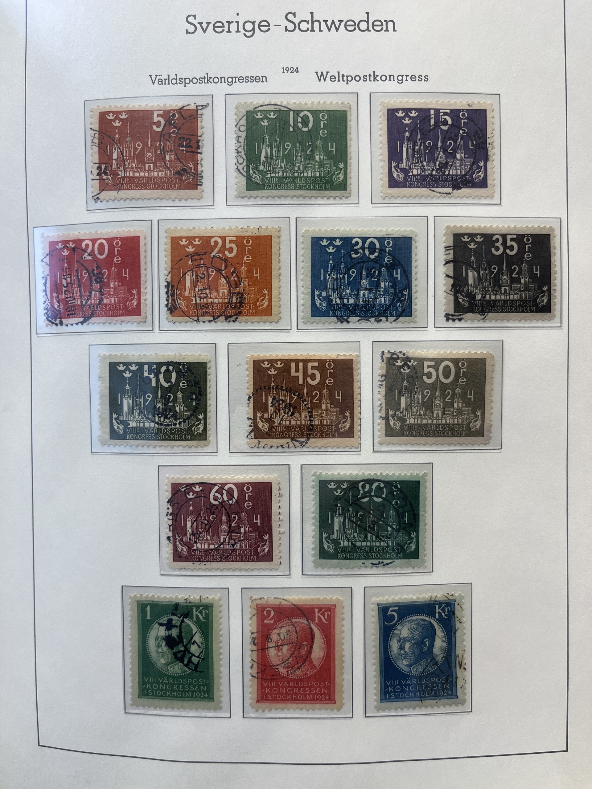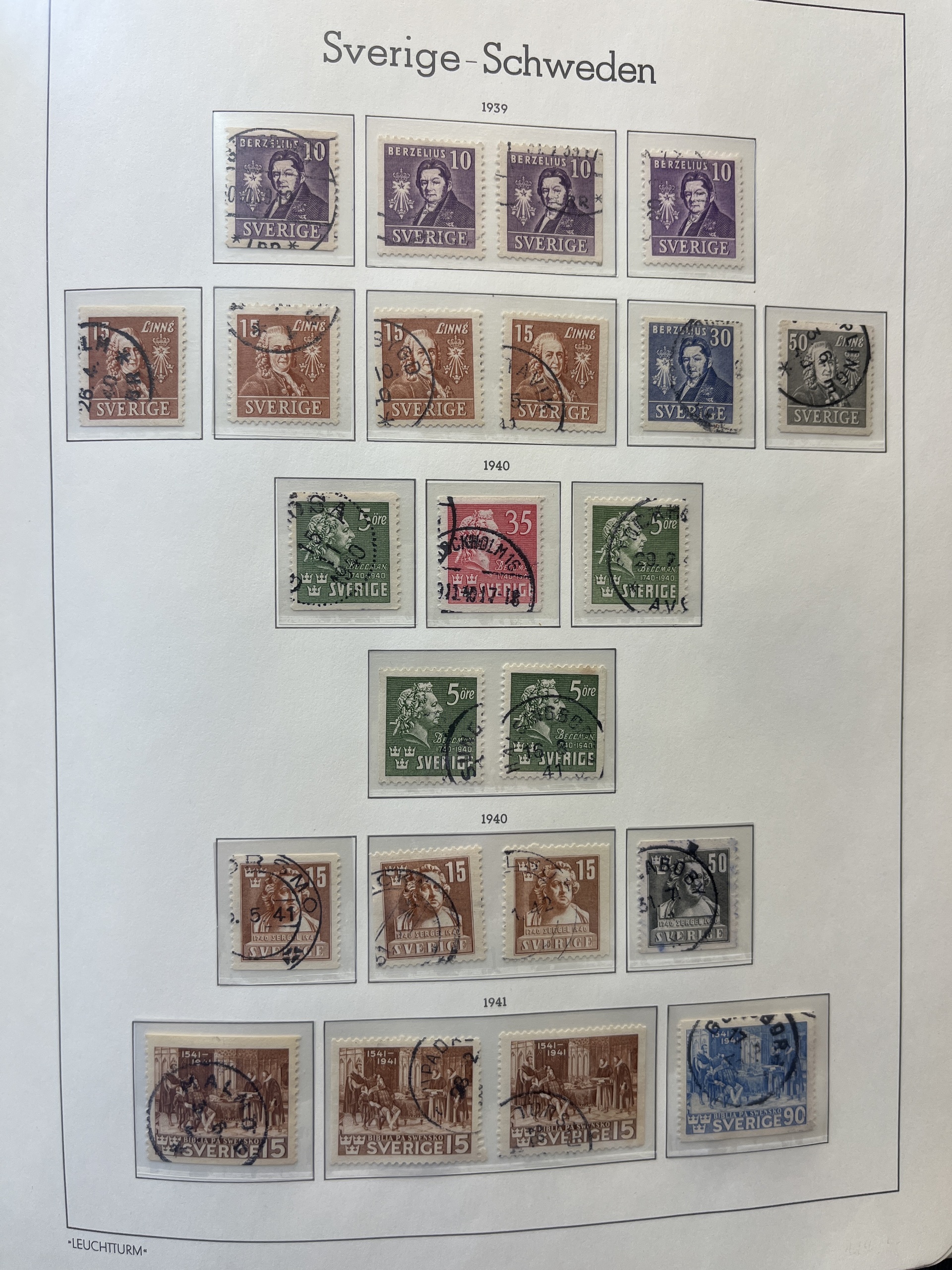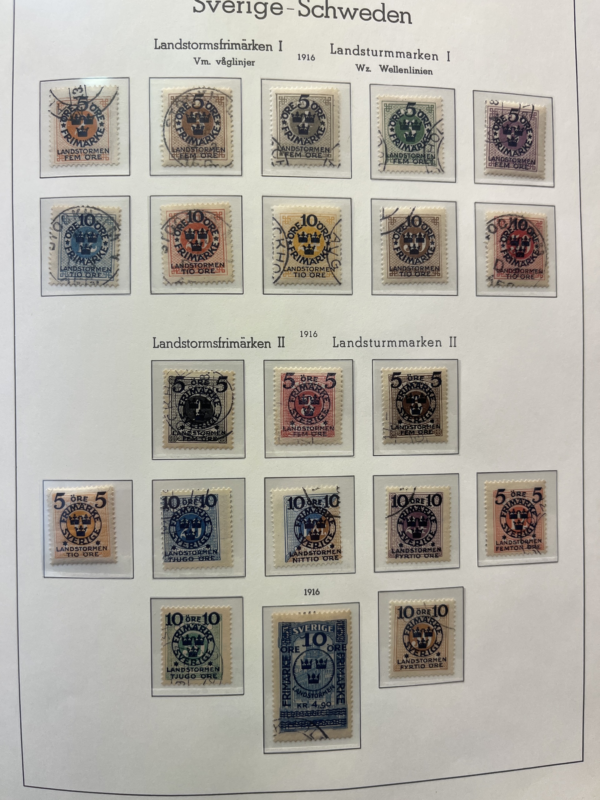 Sweden. Collection used 1855–1944 in Leuchtturm album with stamp mounts. With e.g. 3-24 skill bco in mixed quality, Landstorm I-III compl. 1924 year sets compl. No pairs. Please see a selection of scans at www.philea.se. In the beginning mixed quality, later fine.