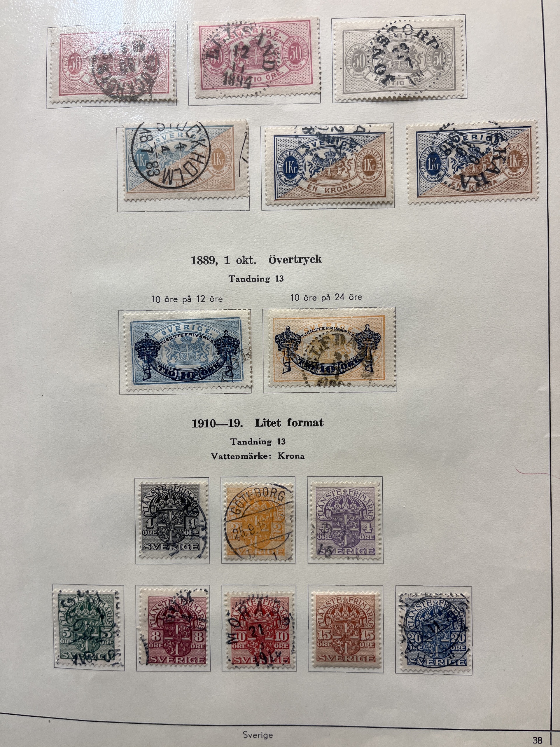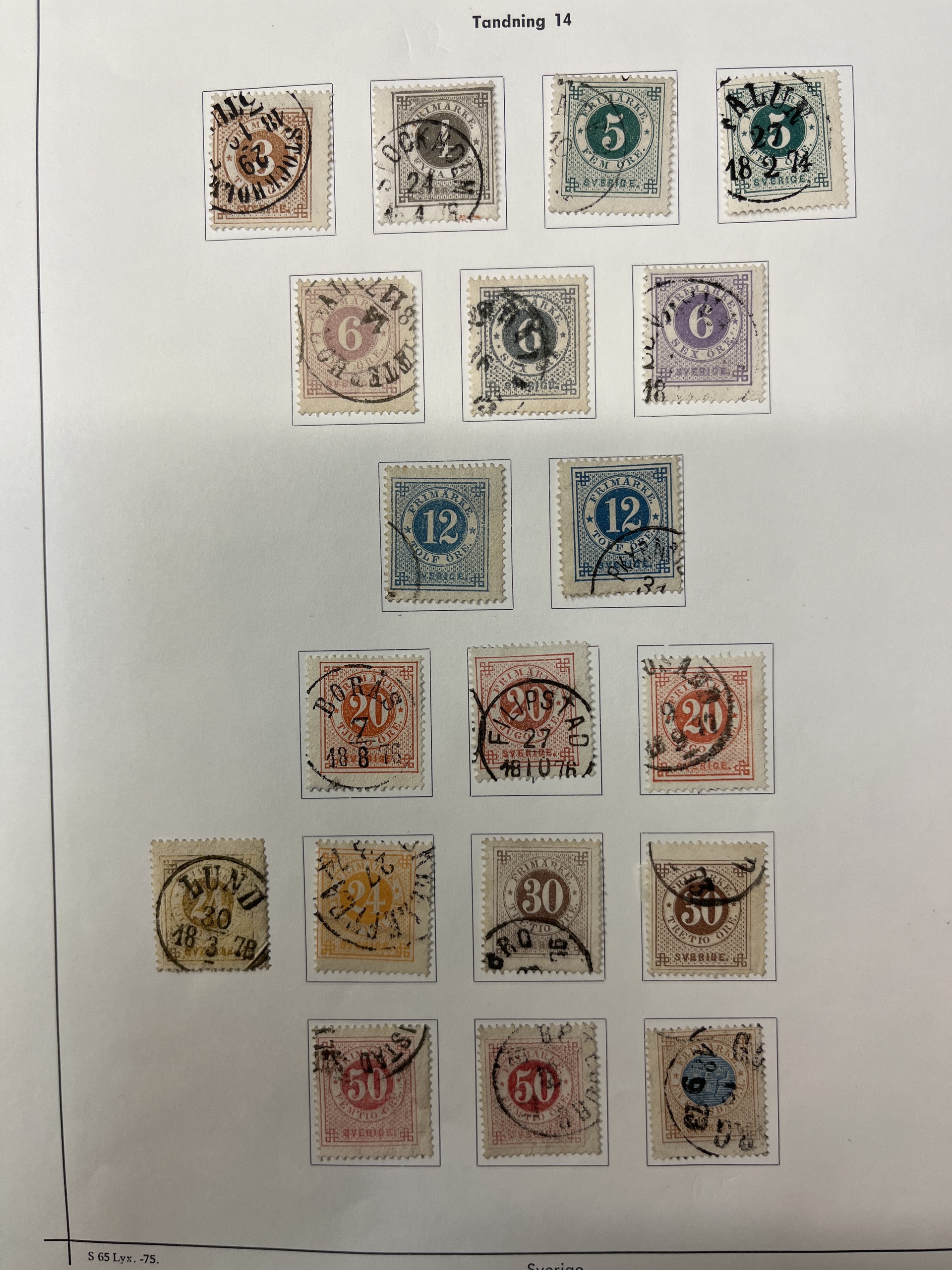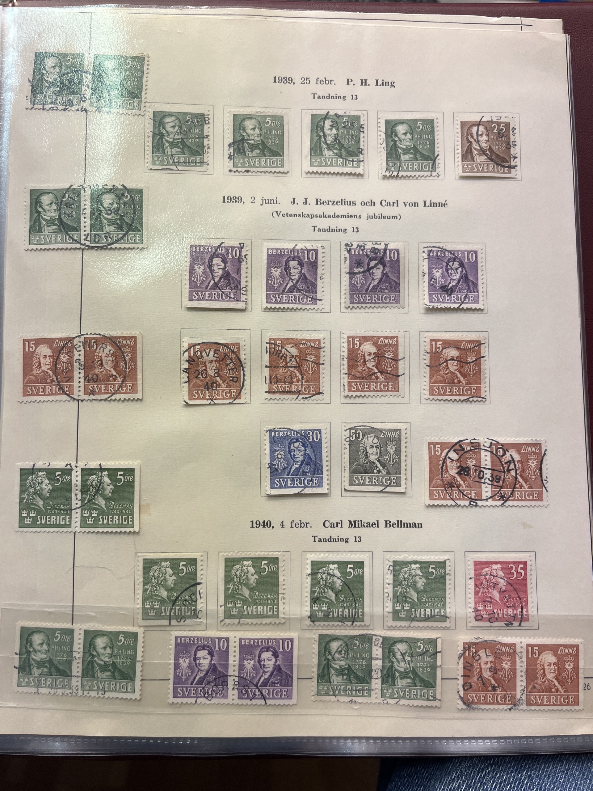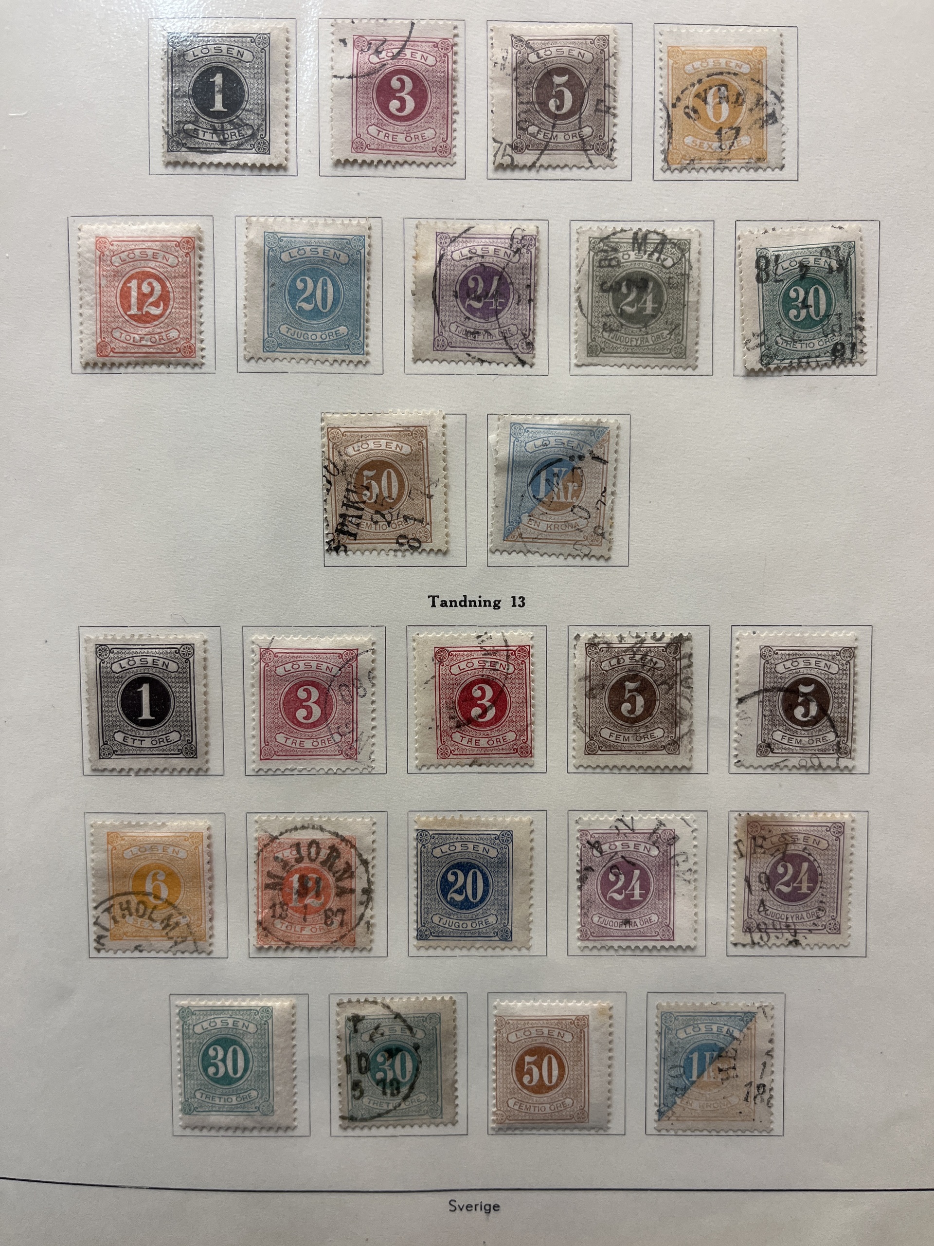 Sweden. Collection mostly used 1858–1949 in album. A rich collection with few gaps, e.g. complete sets of Coat-of-Arms öre, Lying Lion incl. 17 öre grey, Circle type incl. 1 Rd perf. 13 and 1924 year sets, also e.g. many Coil stamps and BC/CB-pairs. Please see a selection of scans at www.philea.se. Mostly fine quality.