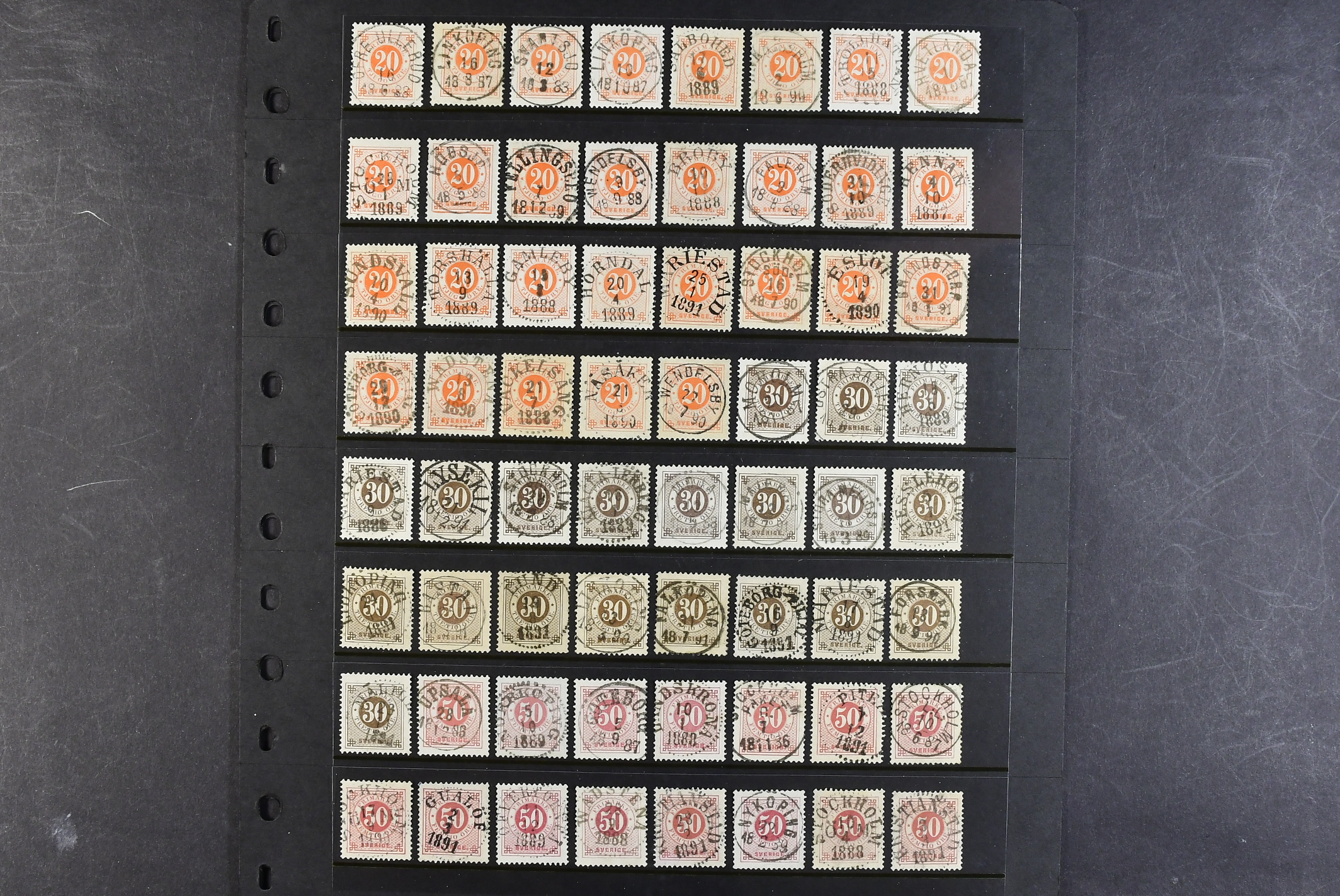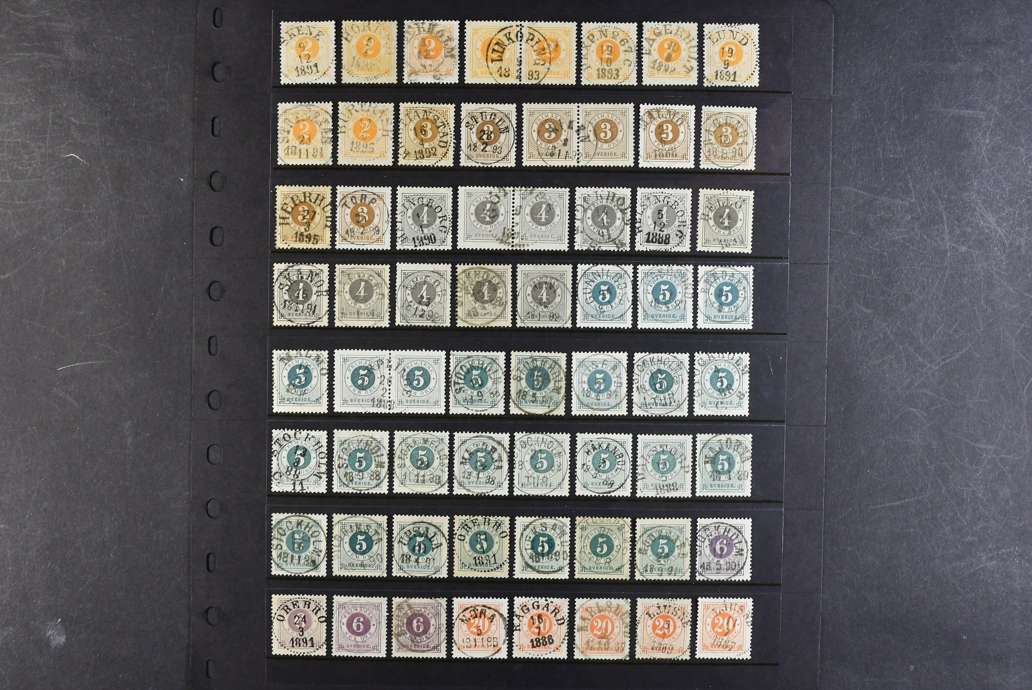 Sweden. Collection used CIRCLE TYPE PH on visir leaves. Wonderful selection almost exclusively with superb–EXCELLENT cancellations. A few signed by O.P. Please inspect. (145)