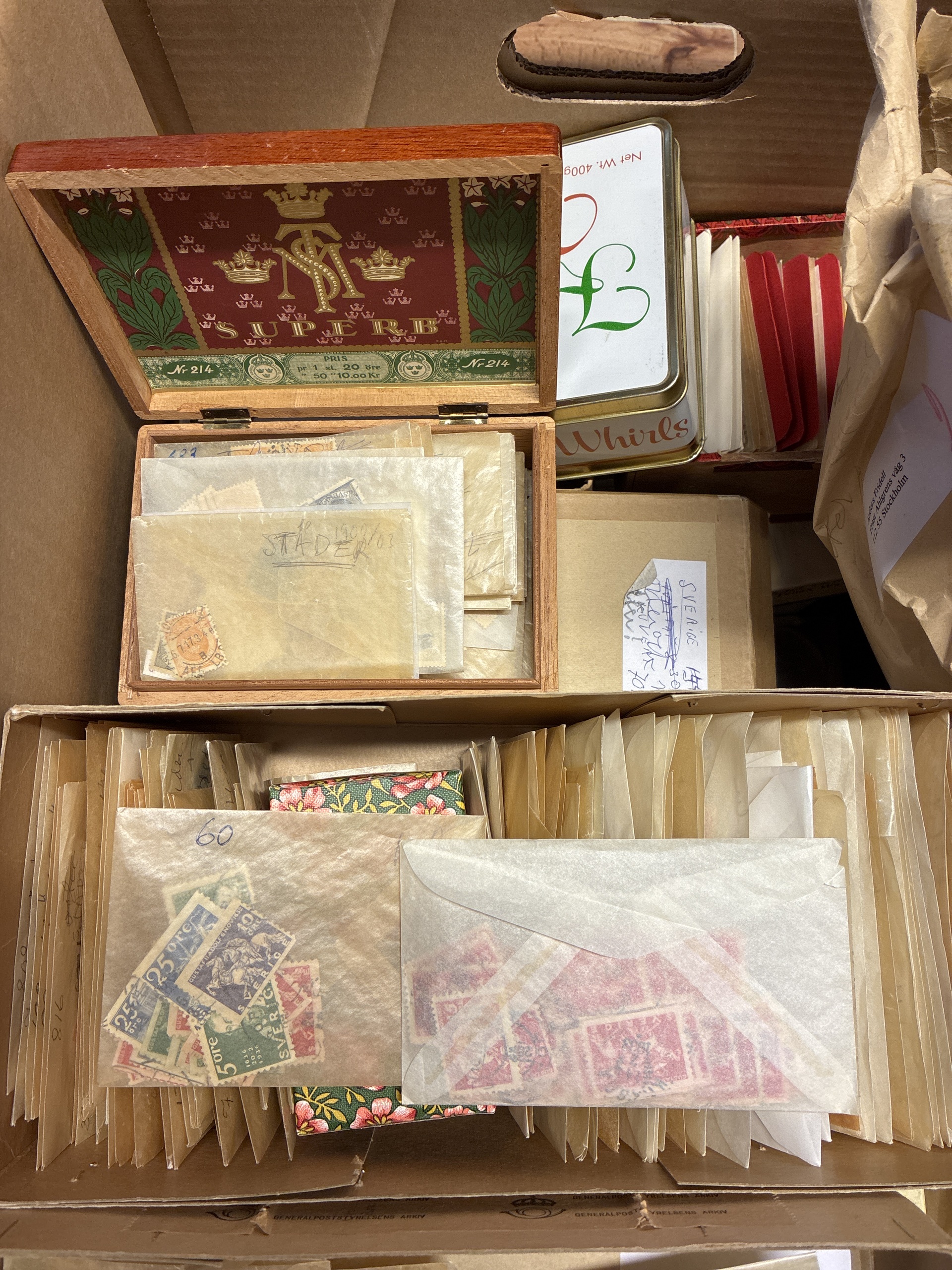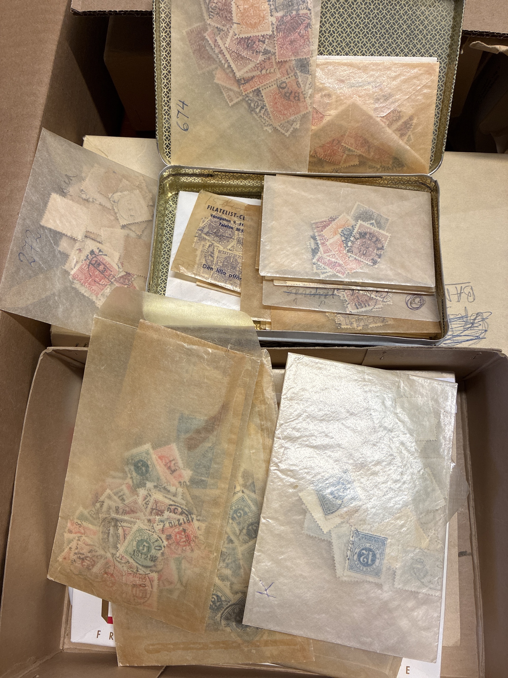 Sweden. Accumulation used 1880– in removal box. Envelopes with stamps, glassine, etc. Many official stamps, Oscar II and Gustaf V. Approx. 10 kg. (>10000)