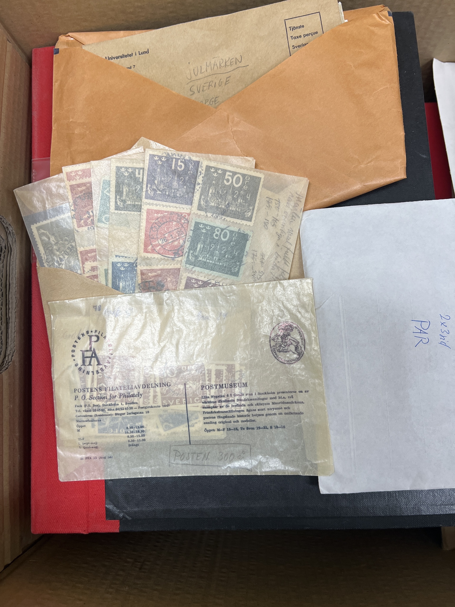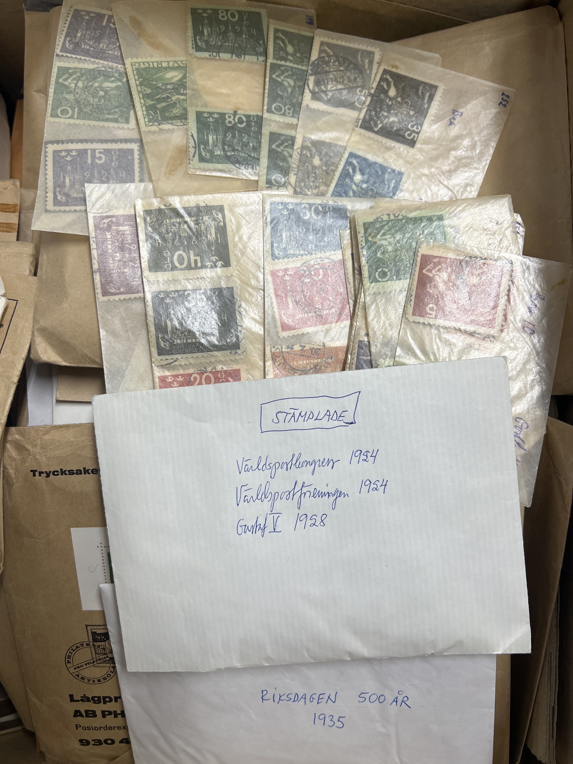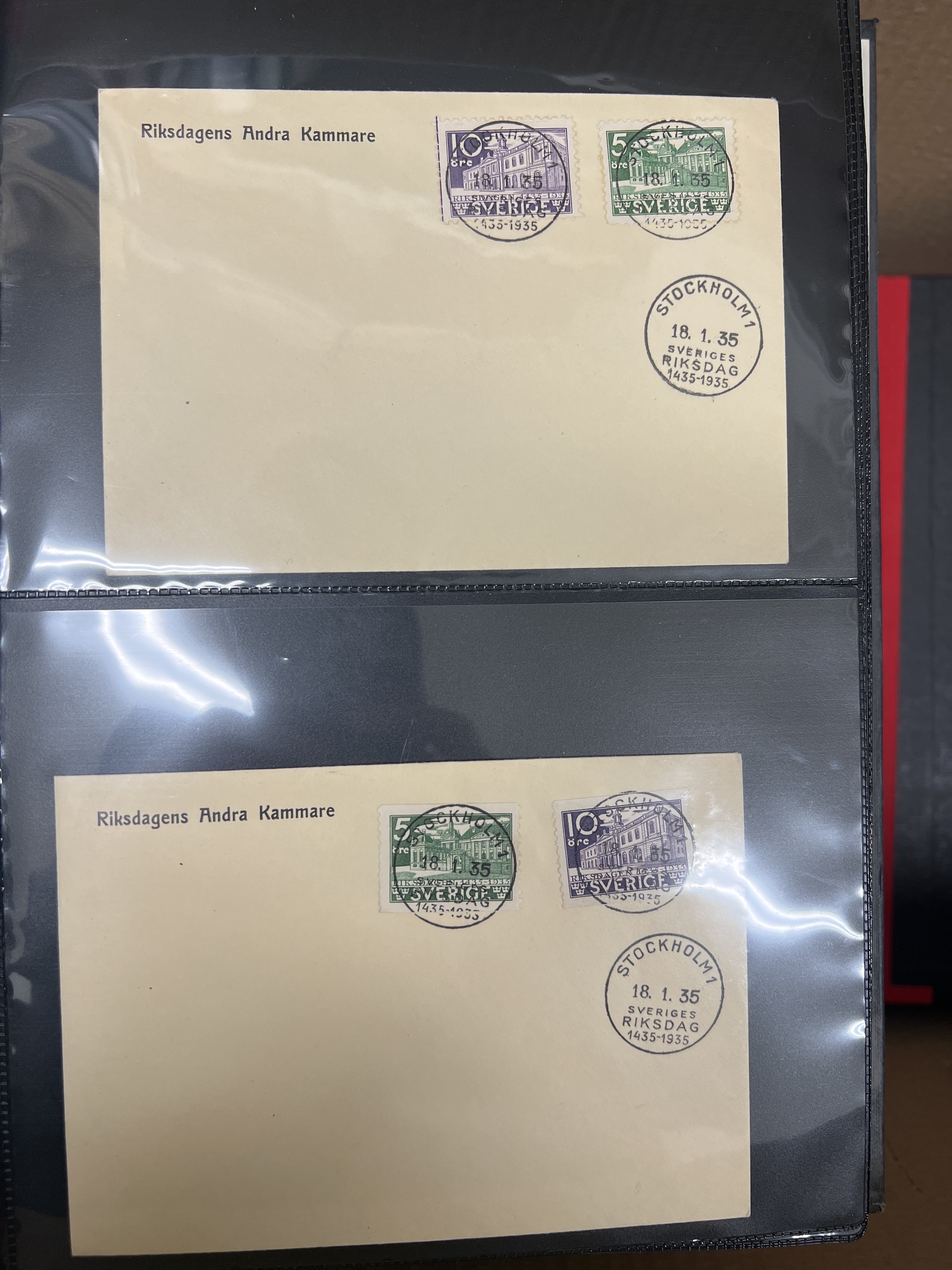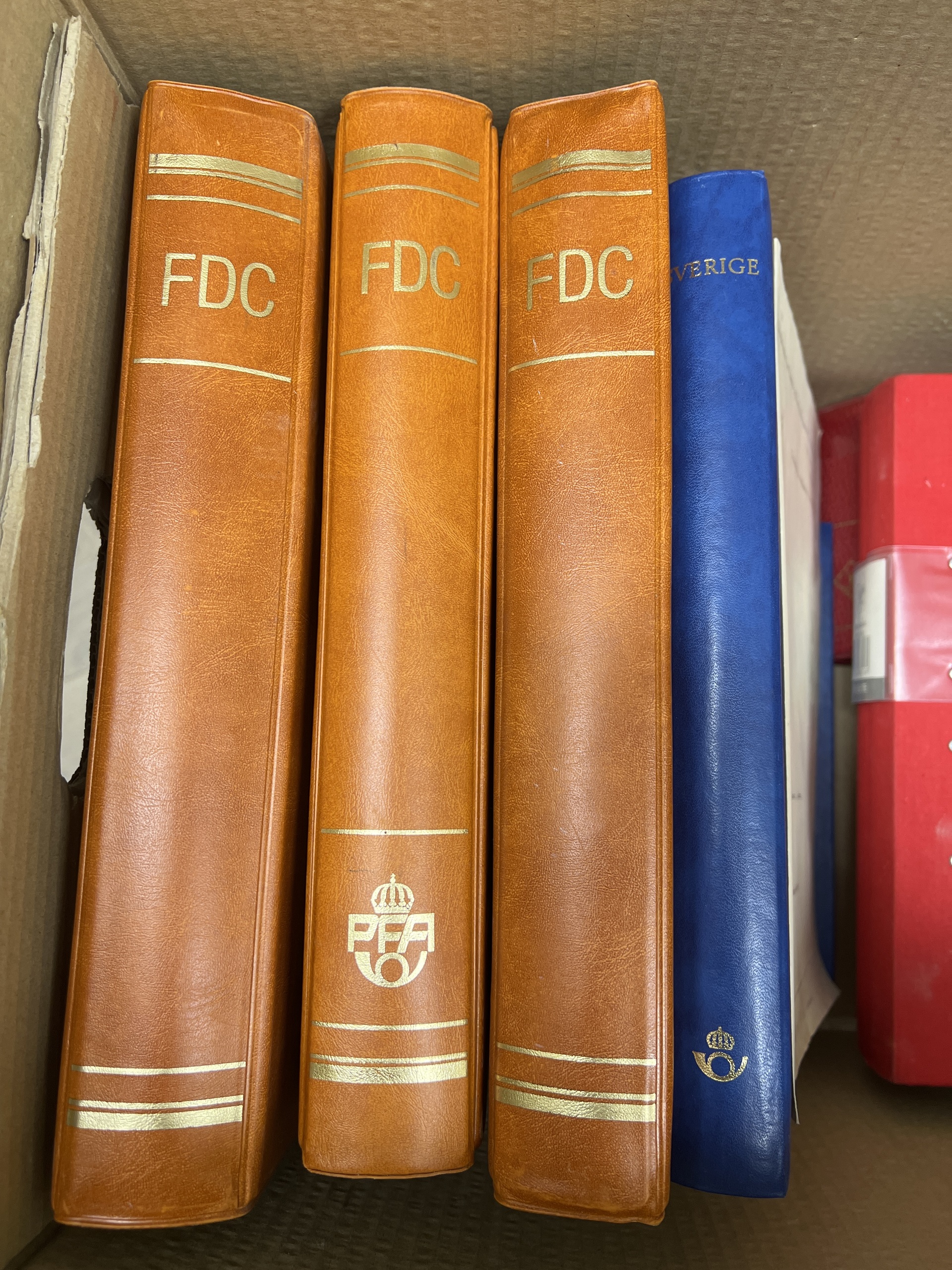 Sweden. Sweden Mostly used accumulation in removal box. Used in envelopes, including better stamps like 1924 congress and UPU stamps, Circel type, Oscar II, BC/CB paars, etc, etc. Also some on cut pieces but more modern 1950s–2000s. One small album with better stamps from mostly Europe and Sweden, including 9 öre Coat-of-Arms. FDC collection 1935–2000s in five albums. From estate, please inspect. (1000s)