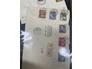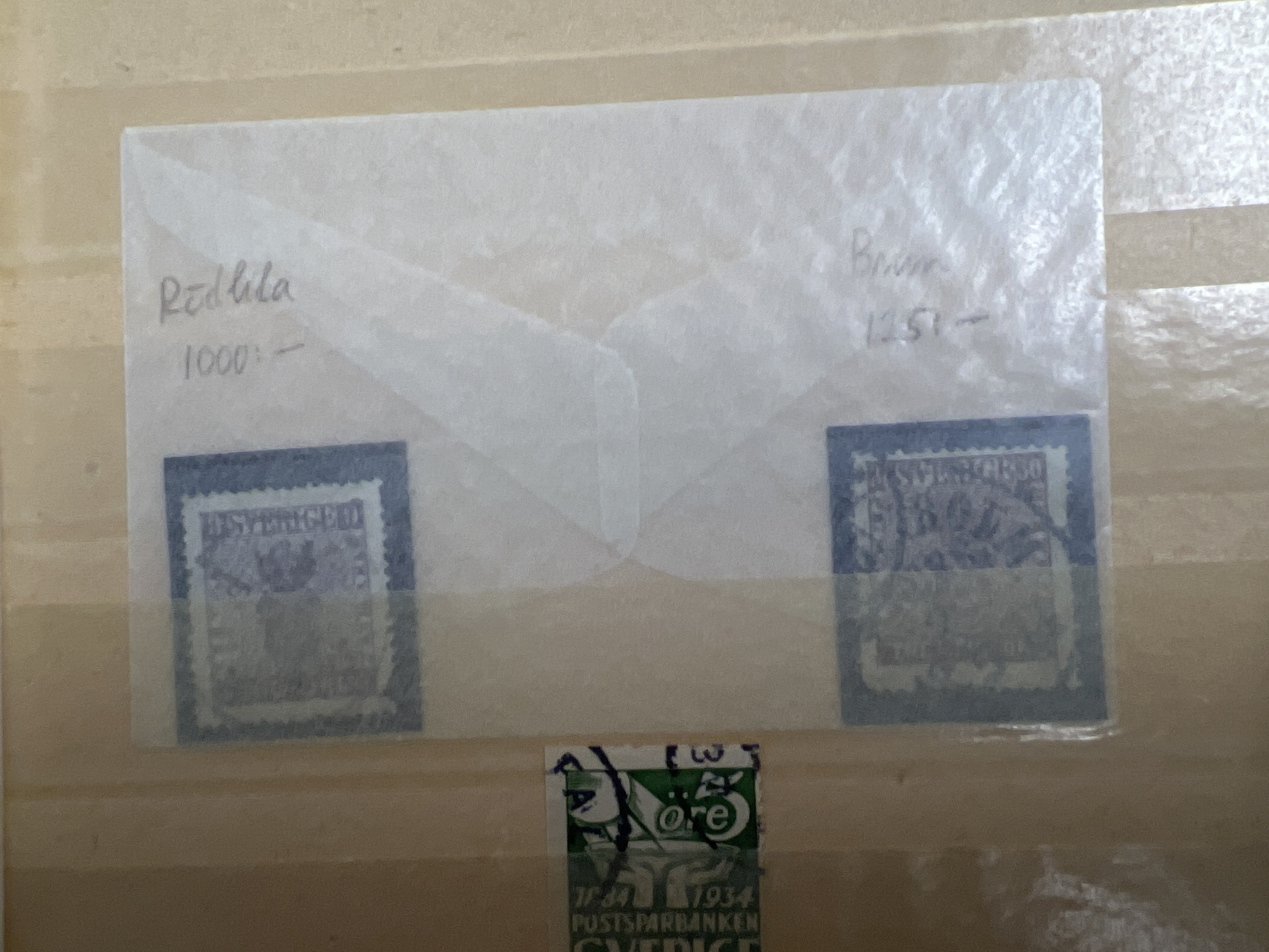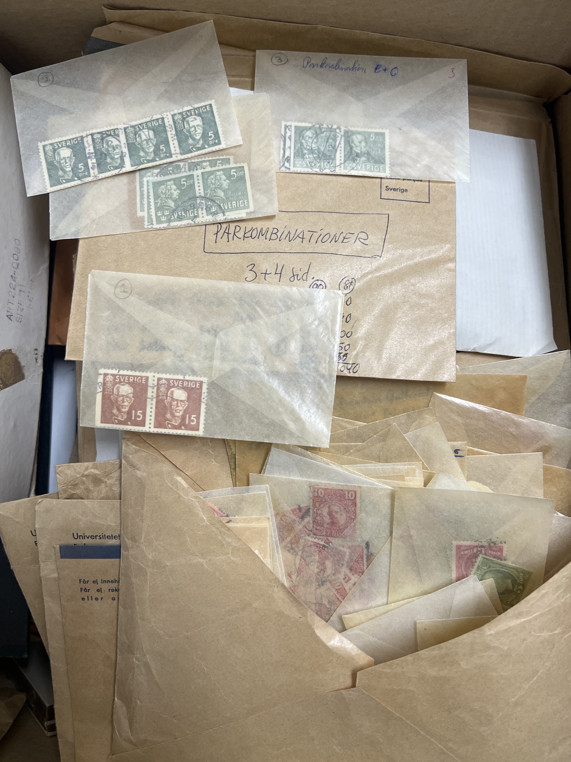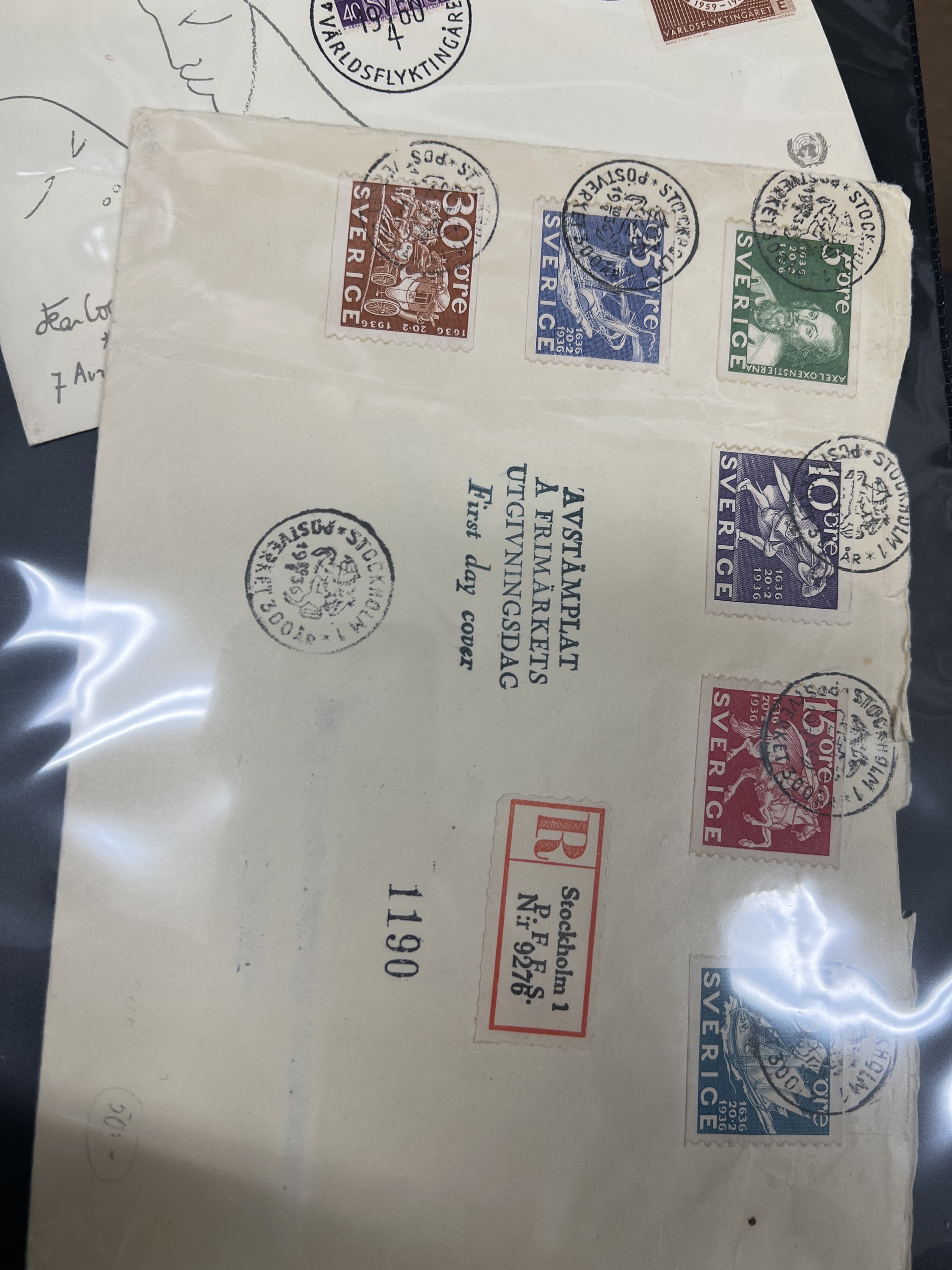 Sweden. Sweden Mostly used accumulation in removal box. Used in envelopes, including better stamps like 1924 congress and UPU stamps, Circel type, Oscar II, BC/CB paars, etc, etc. Also some on cut pieces but more modern 1950s–2000s. One small album with better stamps from mostly Europe and Sweden, including 9 öre Coat-of-Arms. FDC collection 1935–2000s in five albums. From estate, please inspect. (1000s)