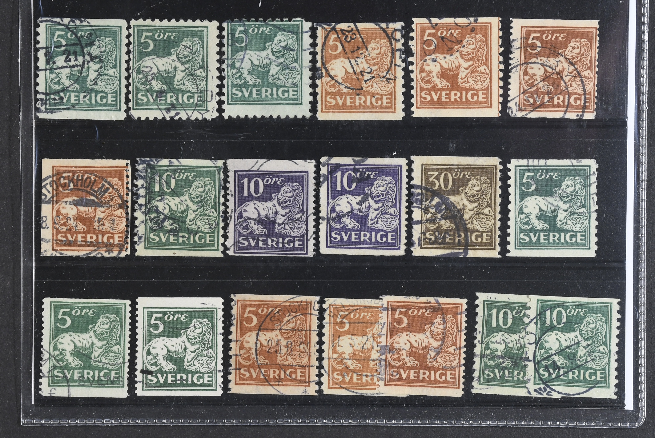 Sweden. Used 1920–1936. St. lions. All different, e.g. Mi 140Acx+C+Ccx, 141Abz, 142Acc+Ecxz,+Ecc, 144Acc, 145E+Ecx, 148Acx. Mostly good quality. F SEK 6350 (19)