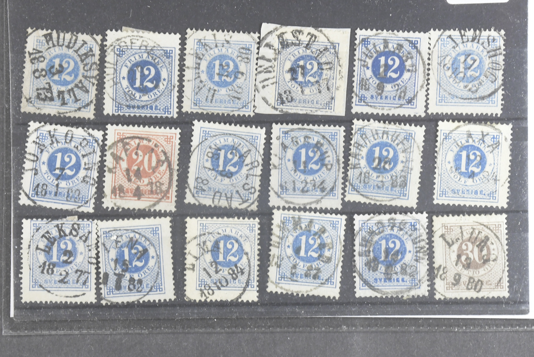Sweden. Lot used CIRCLE TYPE on stock card. Selected readable–superb cancellations. The entire lot is presented at www.philea.se. (18)