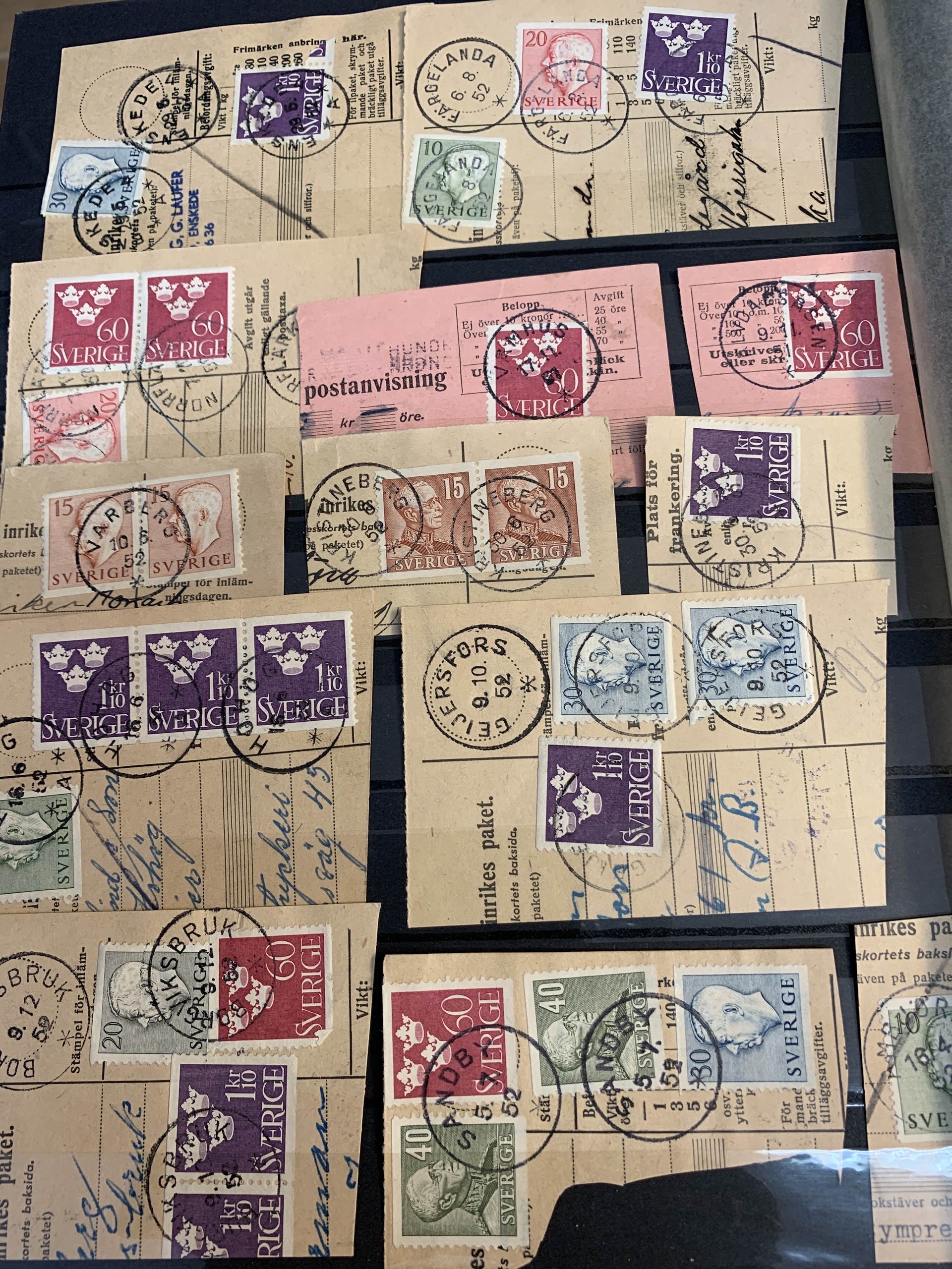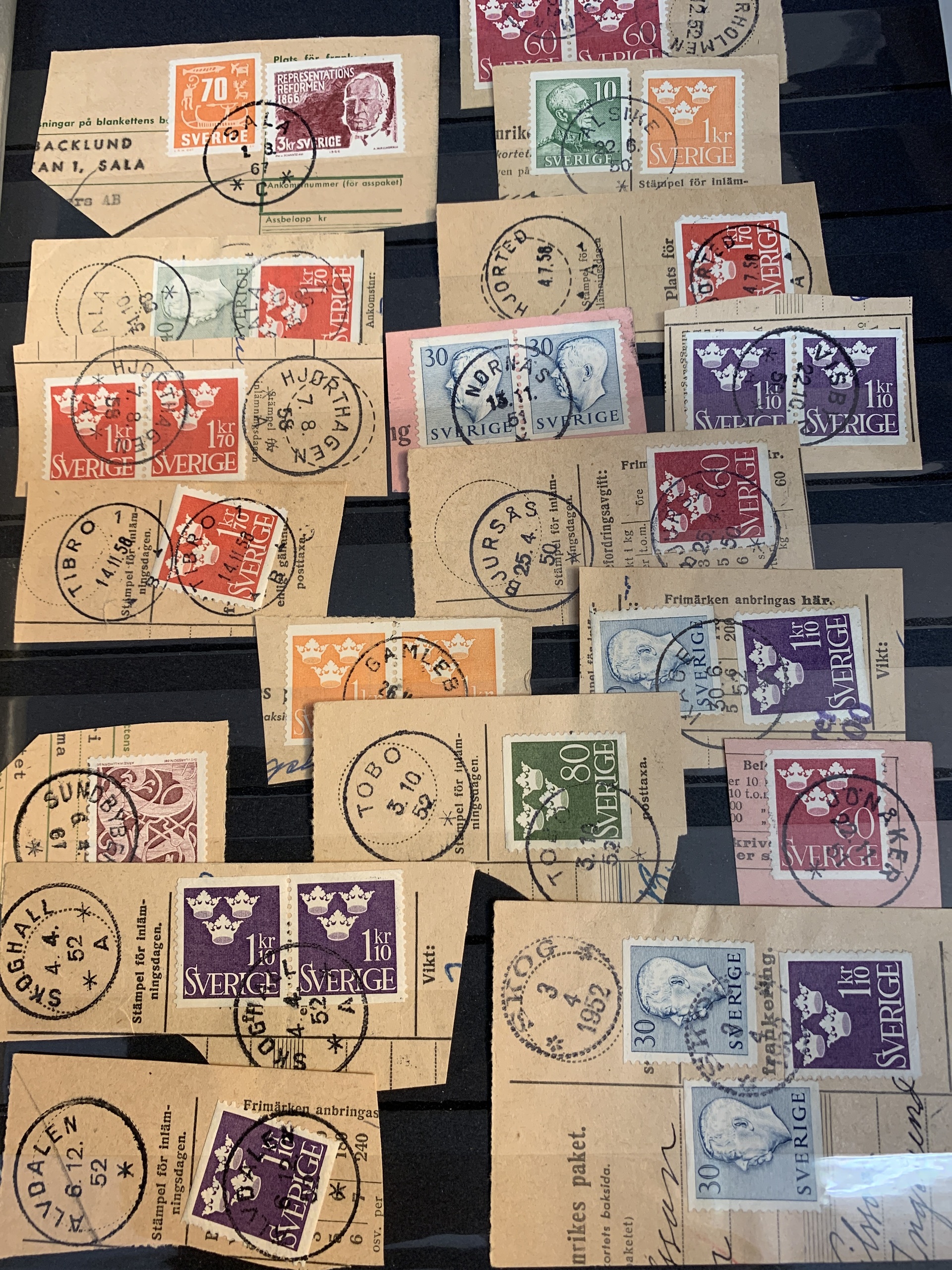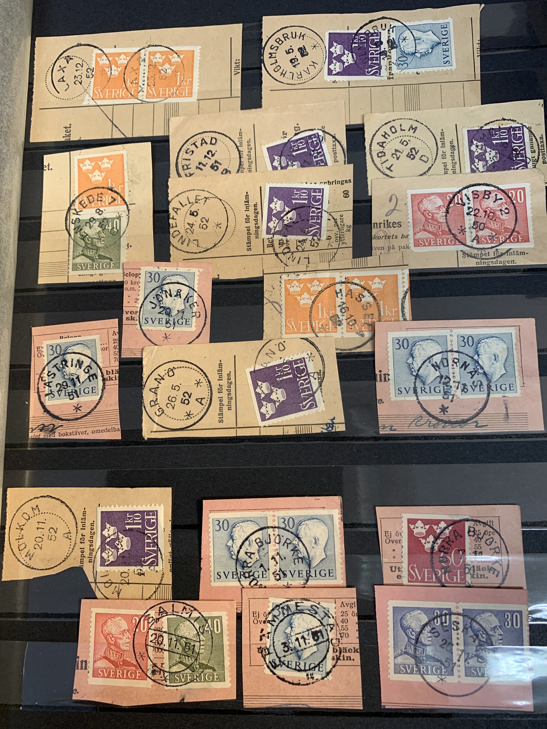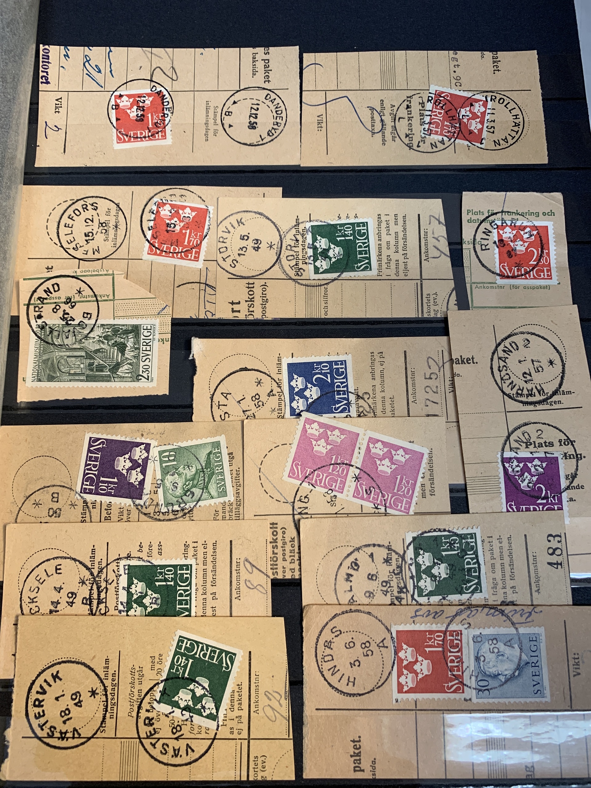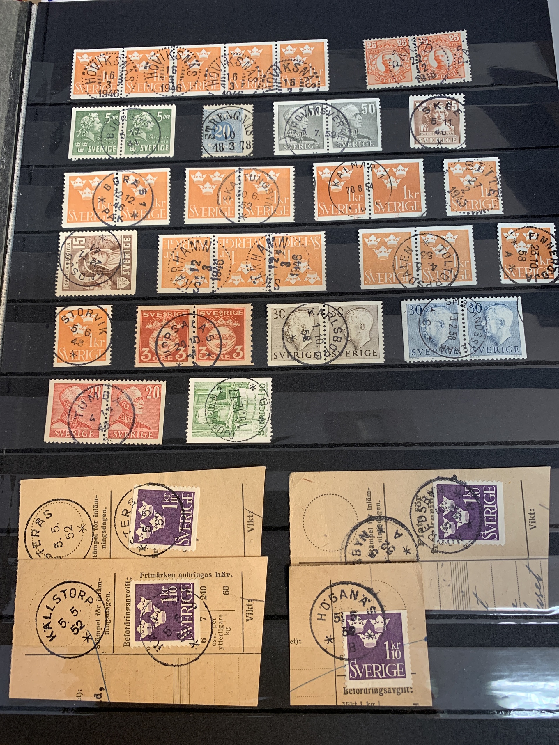 Sweden. Miscellaneous. Beautiful–superb cancellations on covers (104 ex.), mostly 1880–1920s, cut pieces (415 ex.) and 20 loose stamps in two stockbooks with pockets + 136 cut pieces with beautiful cancellations from consistently closed postal stations in stockbook.