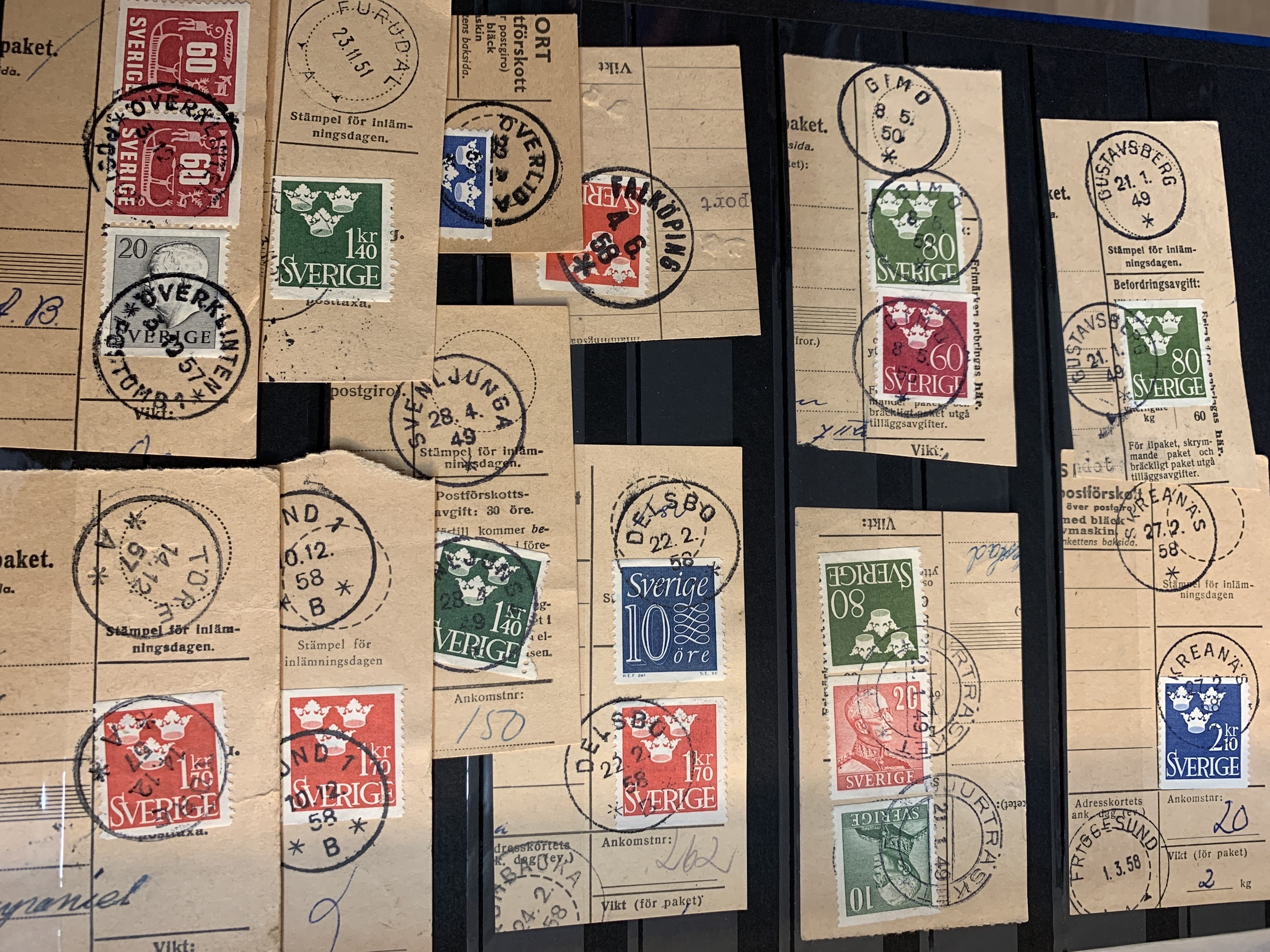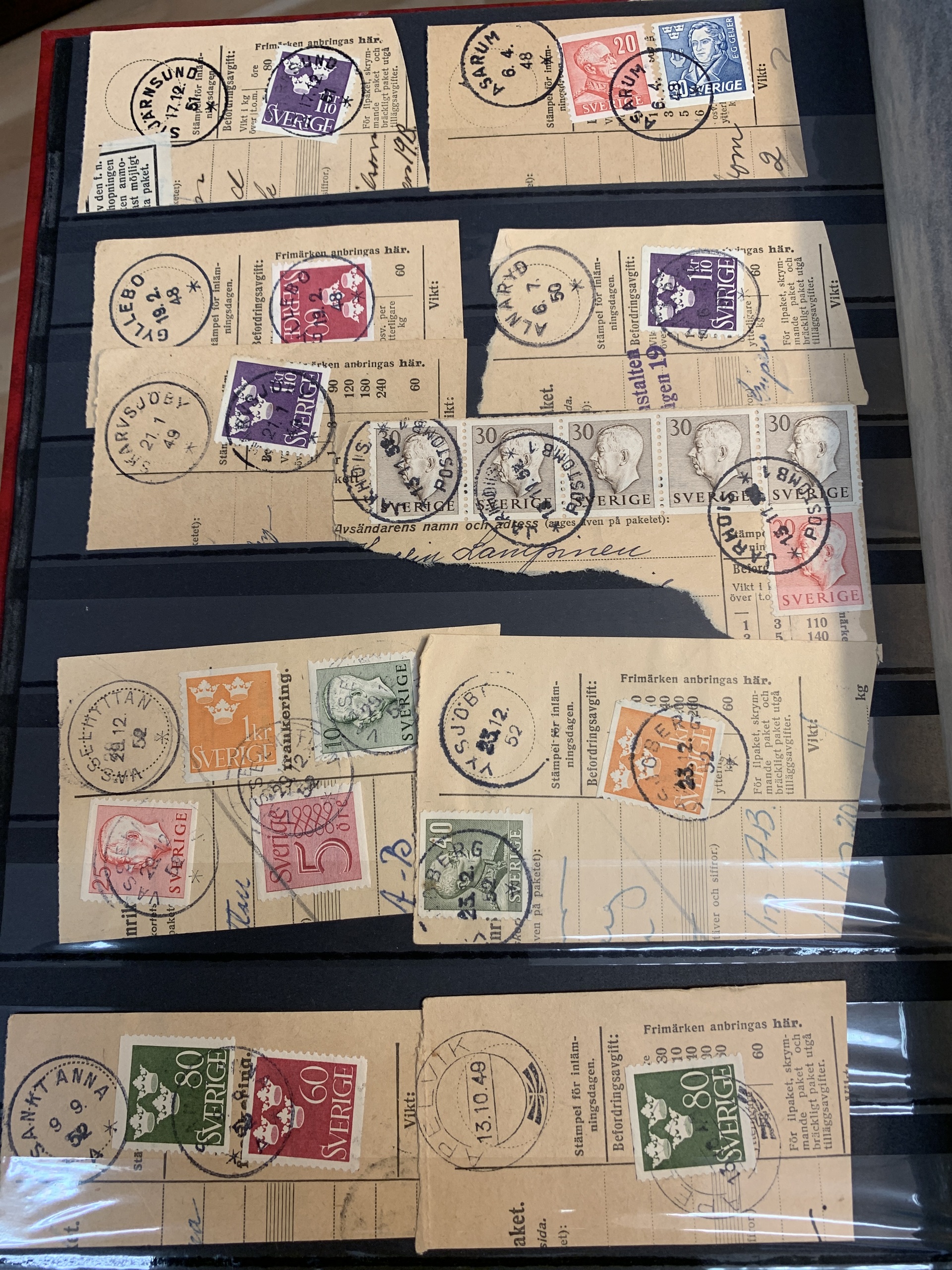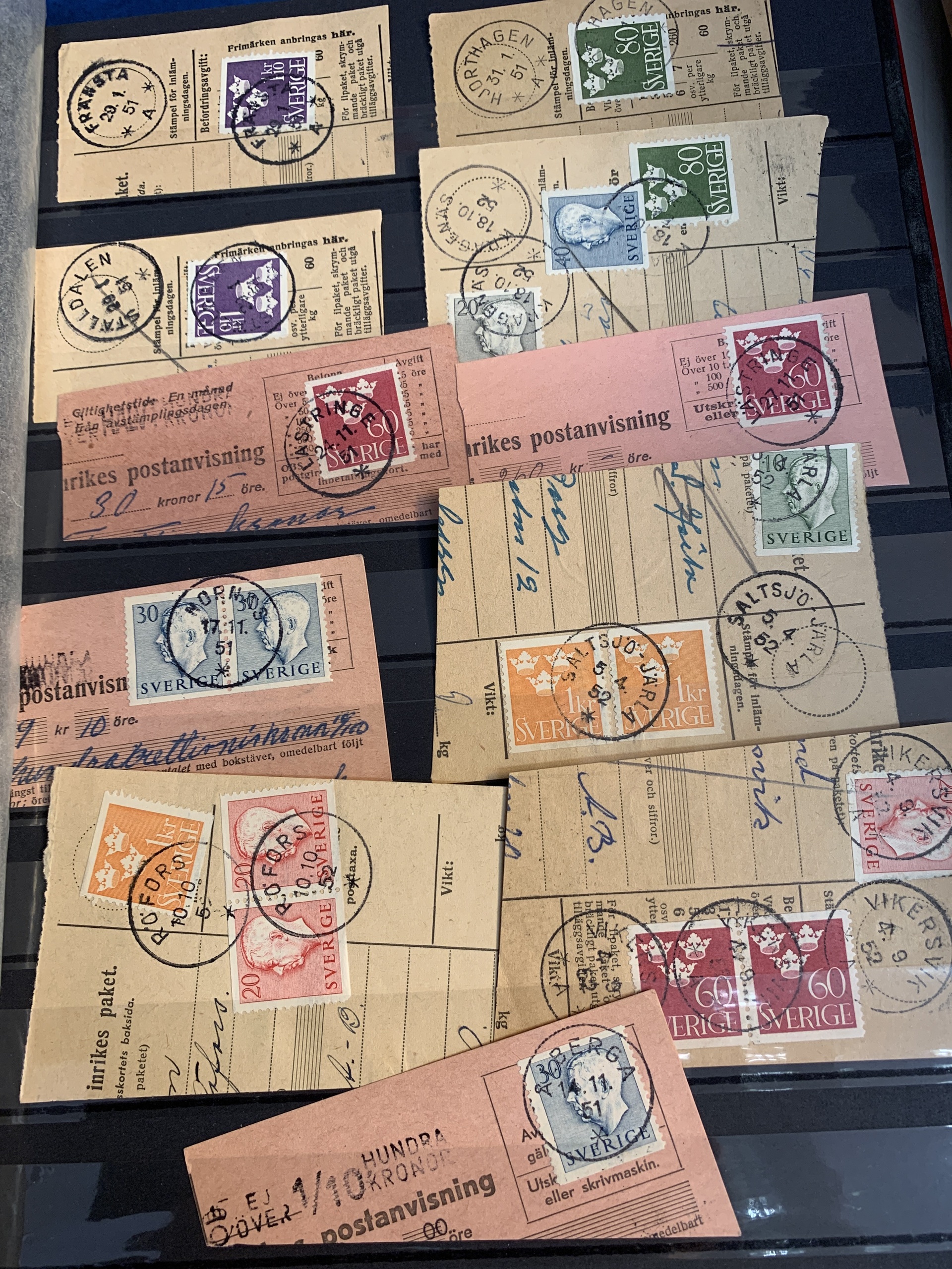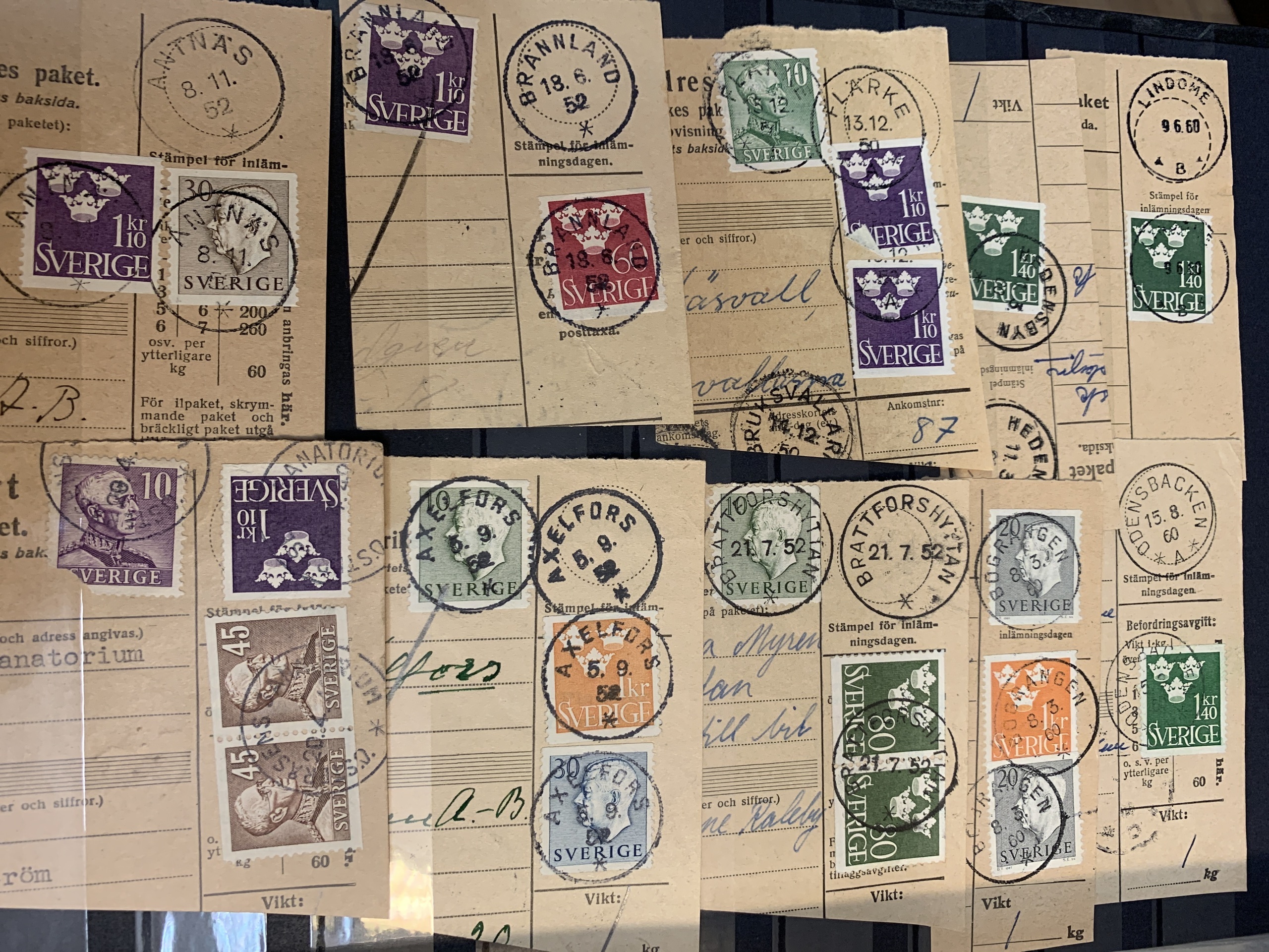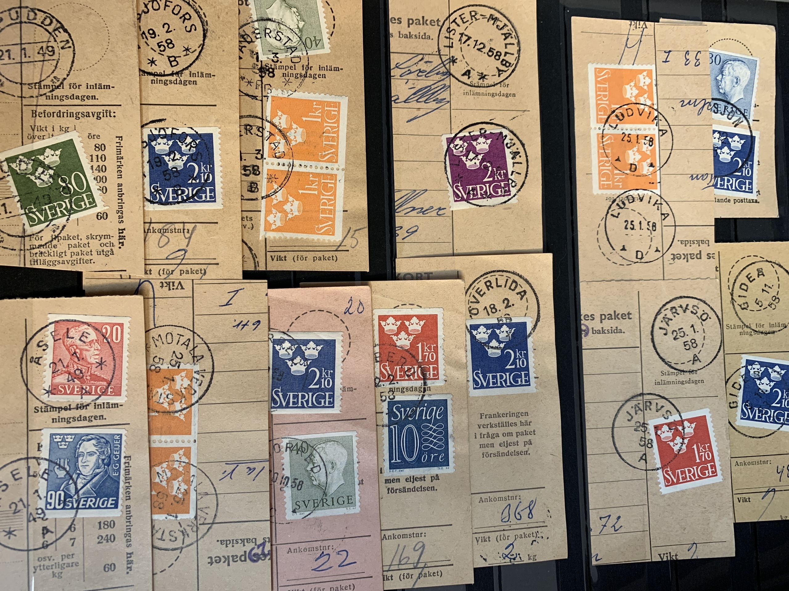 Sweden. Miscellaneous. Beautiful–superb cancellations on covers (104 ex.), mostly 1880–1920s, cut pieces (415 ex.) and 20 loose stamps in two stockbooks with pockets + 136 cut pieces with beautiful cancellations from consistently closed postal stations in stockbook.
