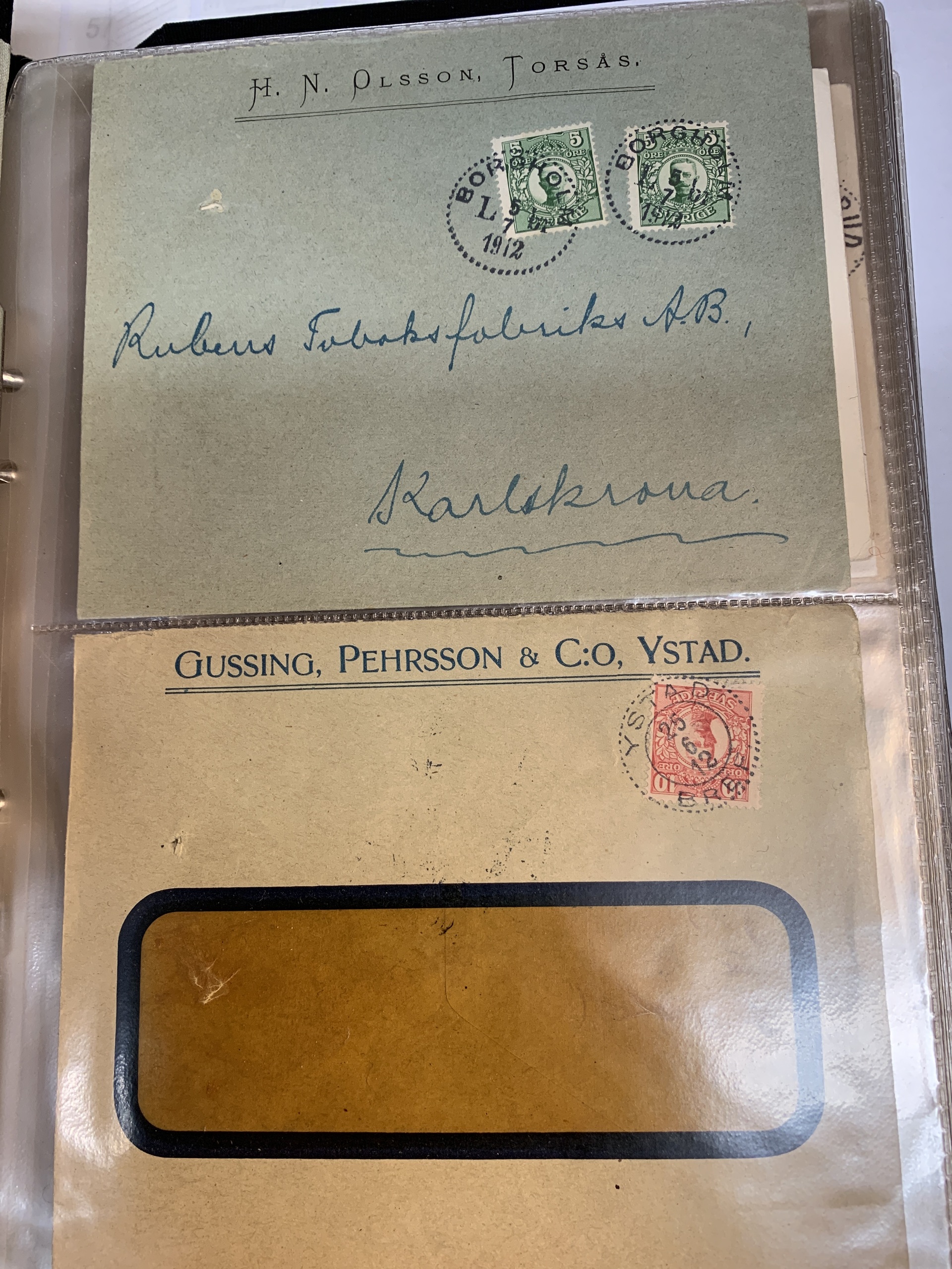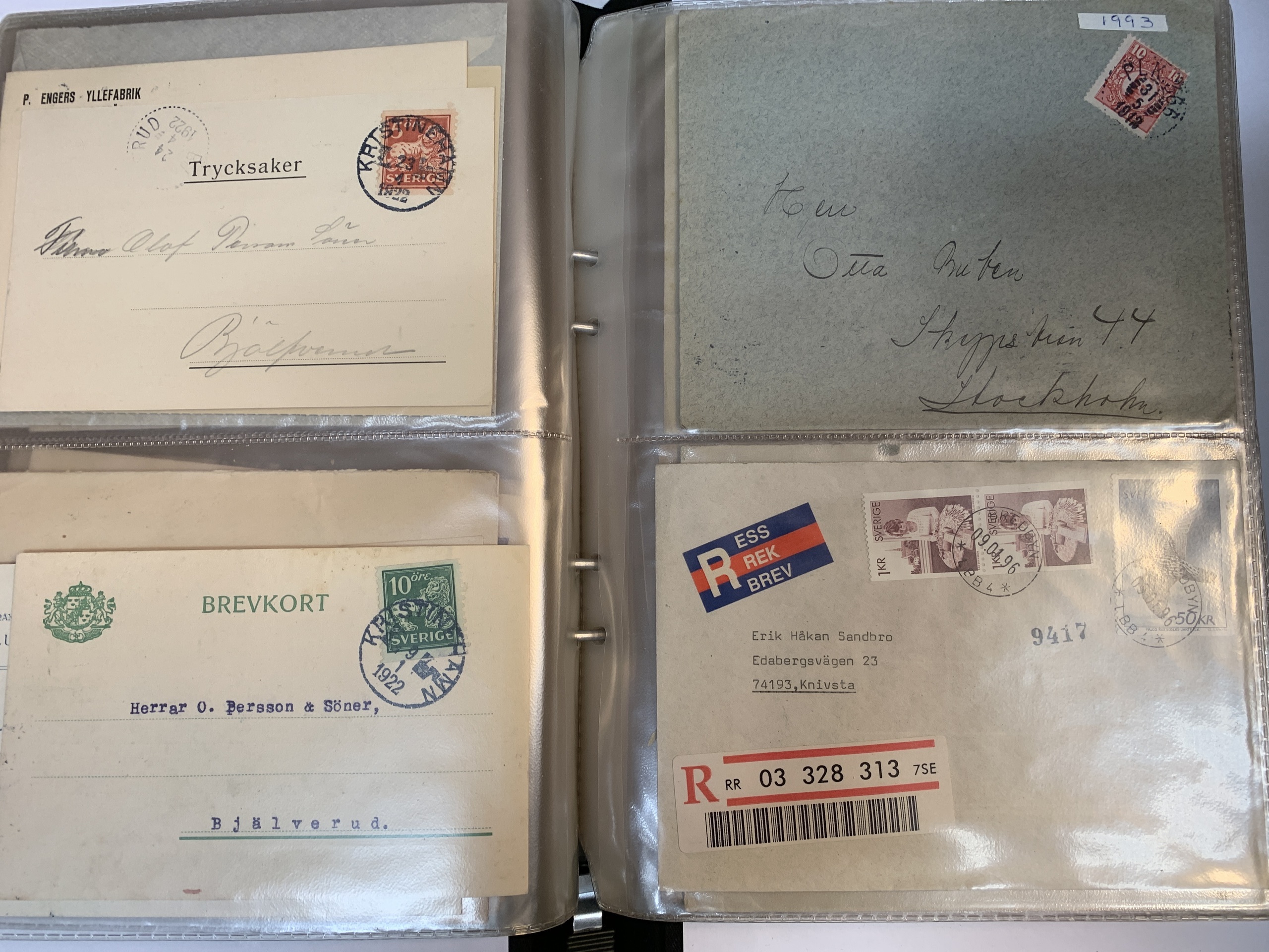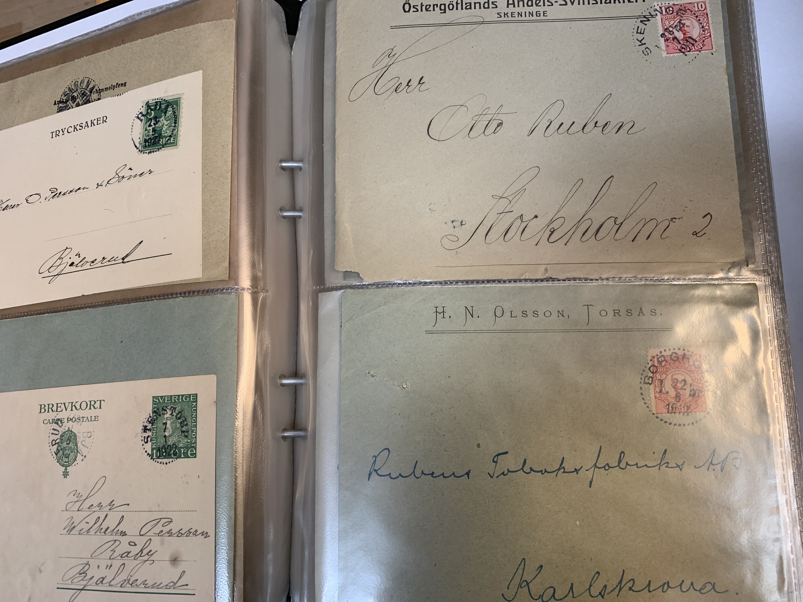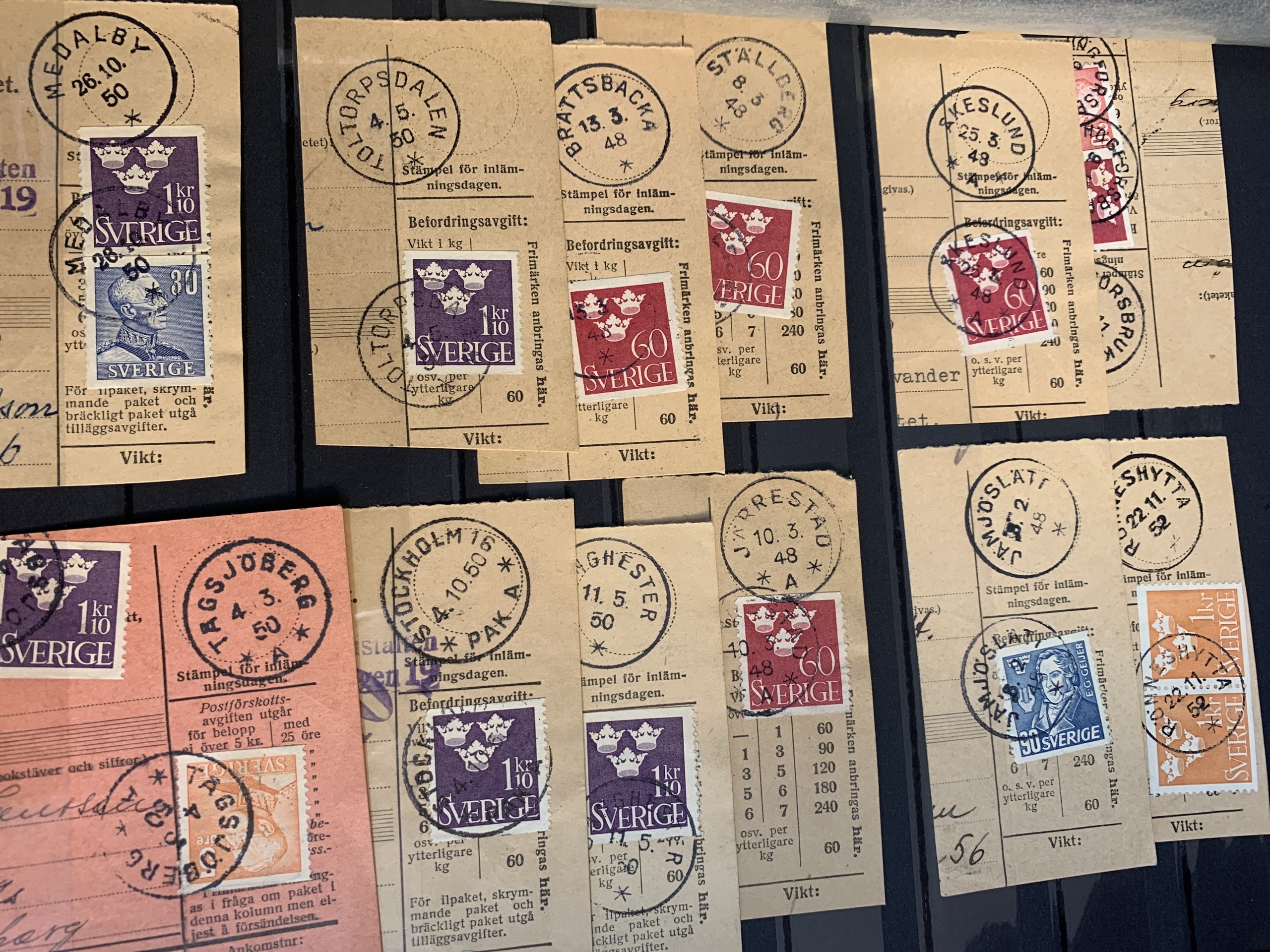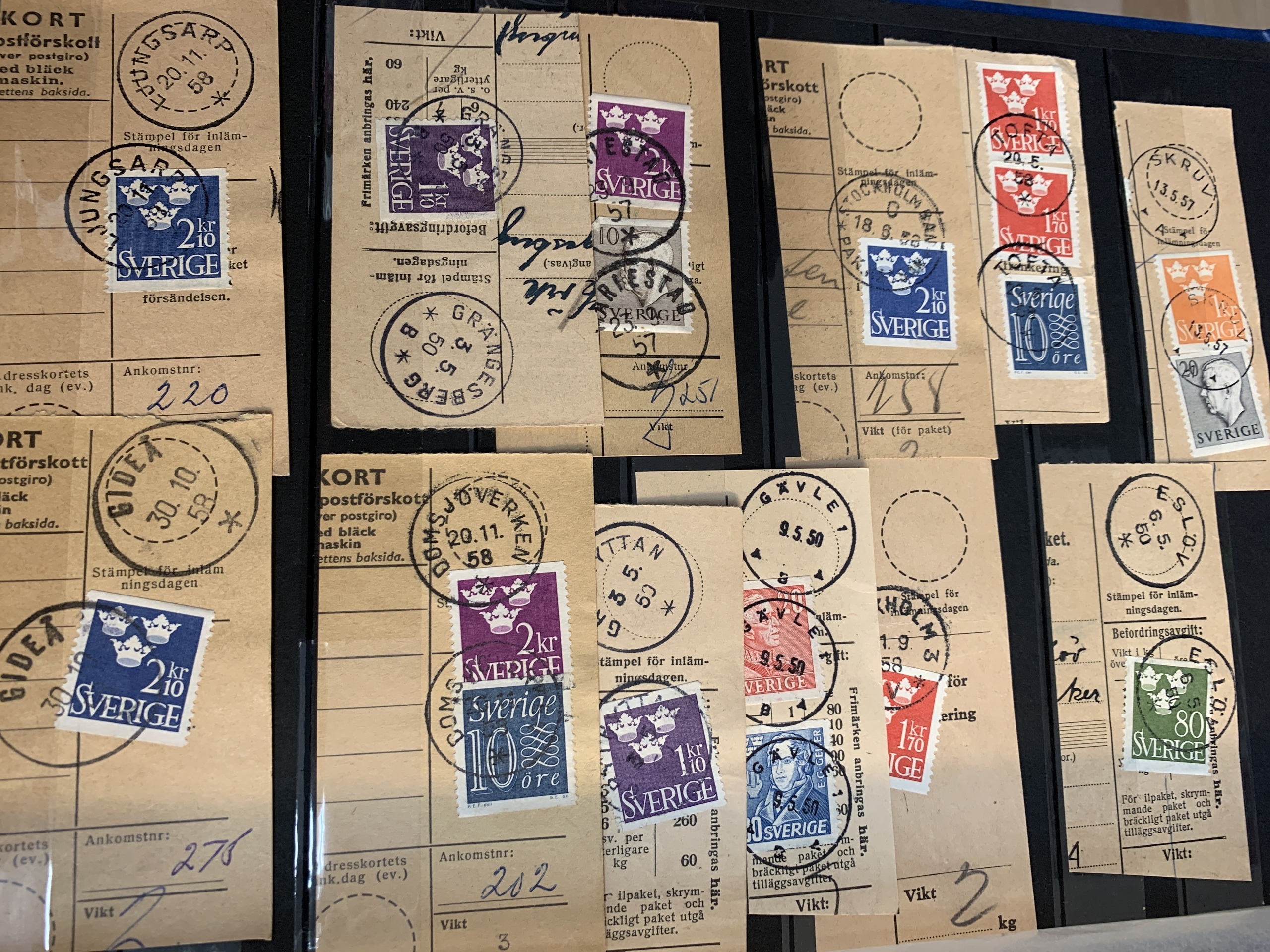 Sweden. Miscellaneous. Beautiful–superb cancellations on covers (104 ex.), mostly 1880–1920s, cut pieces (415 ex.) and 20 loose stamps in two stockbooks with pockets + 136 cut pieces with beautiful cancellations from consistently closed postal stations in stockbook.