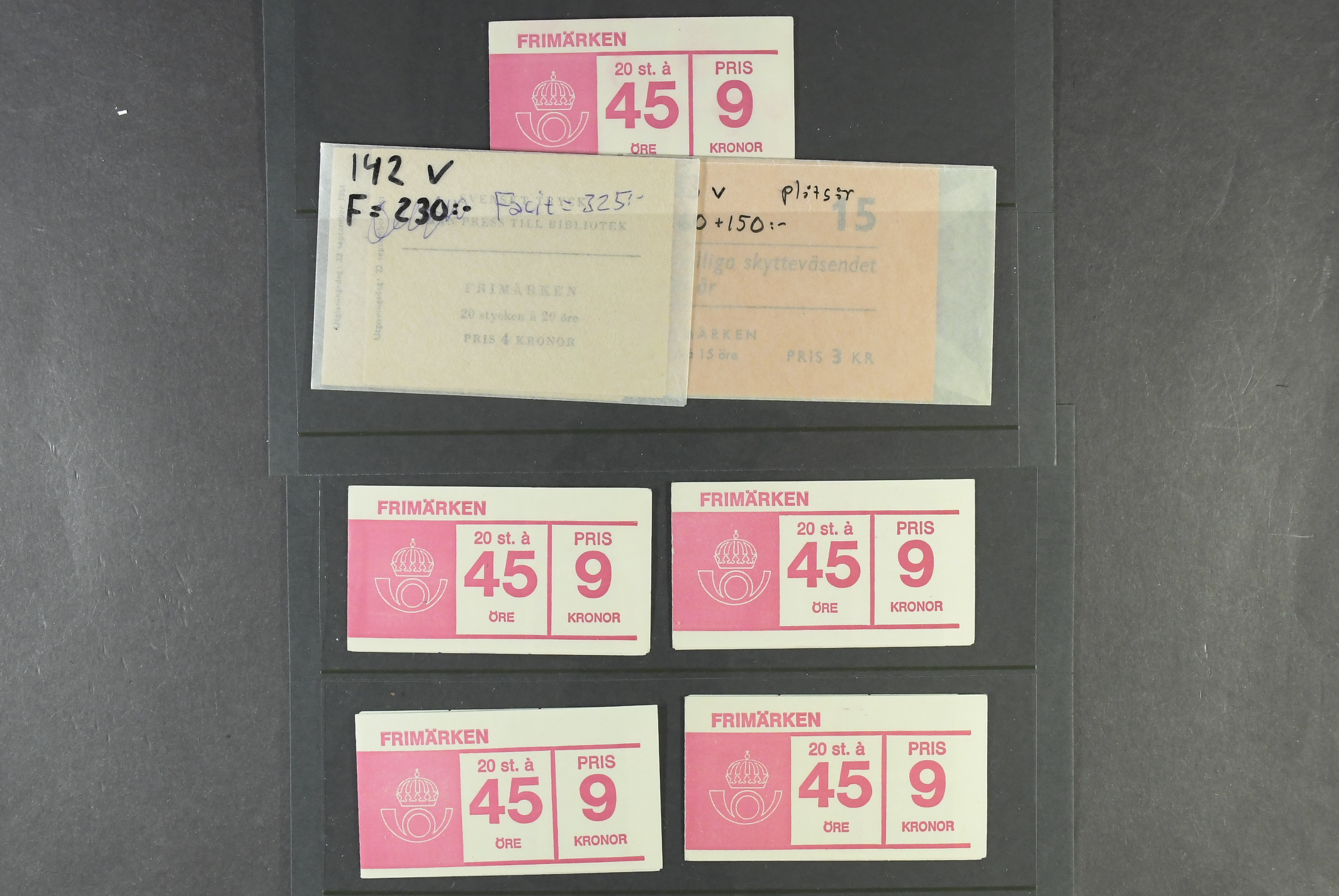 Sweden. Booklets. Lot with five fresh booklets H190D1a, three copies H142v with plate flaw and one H133v with plate crack on back. F 7760. Excellent quality.