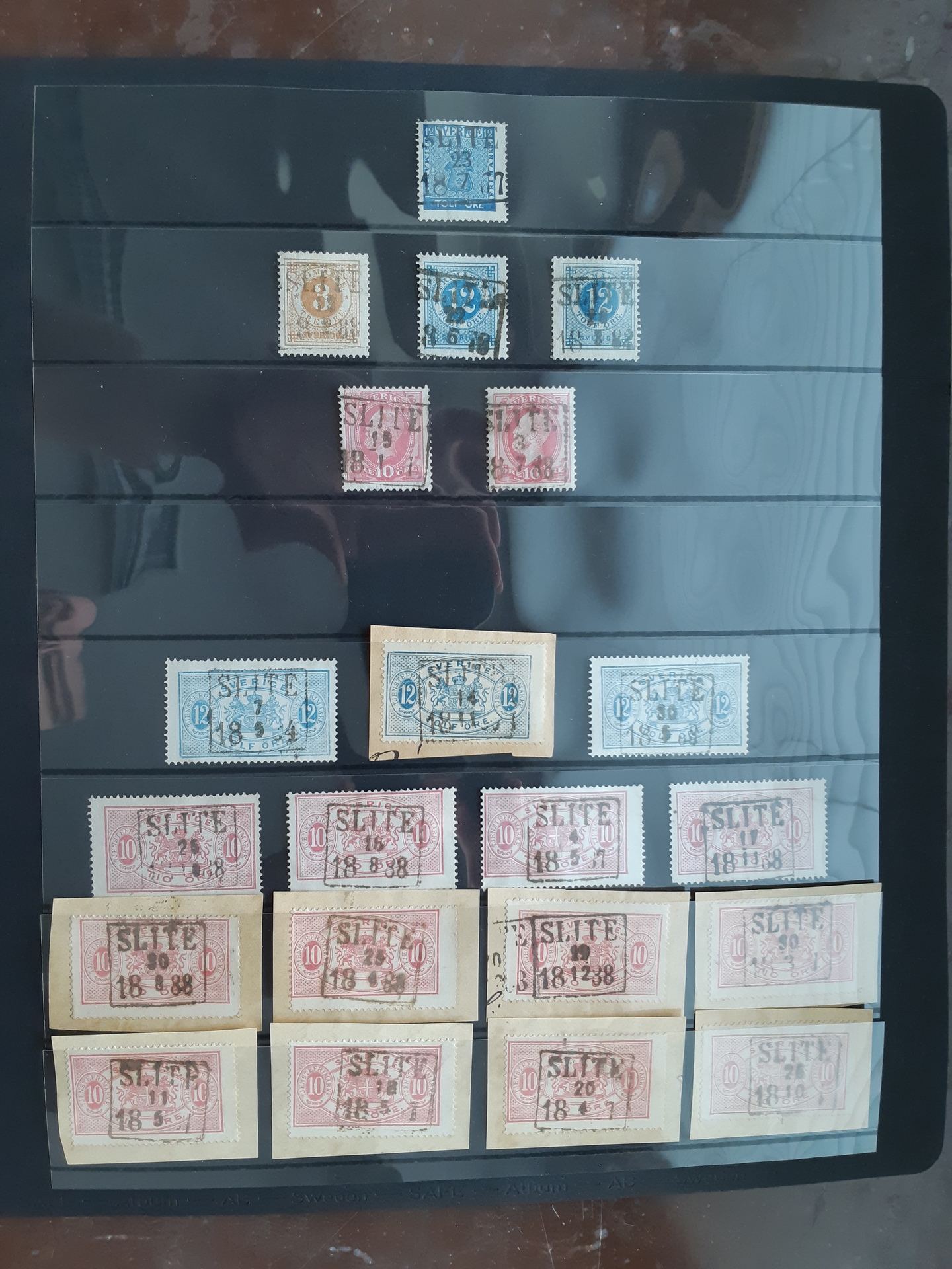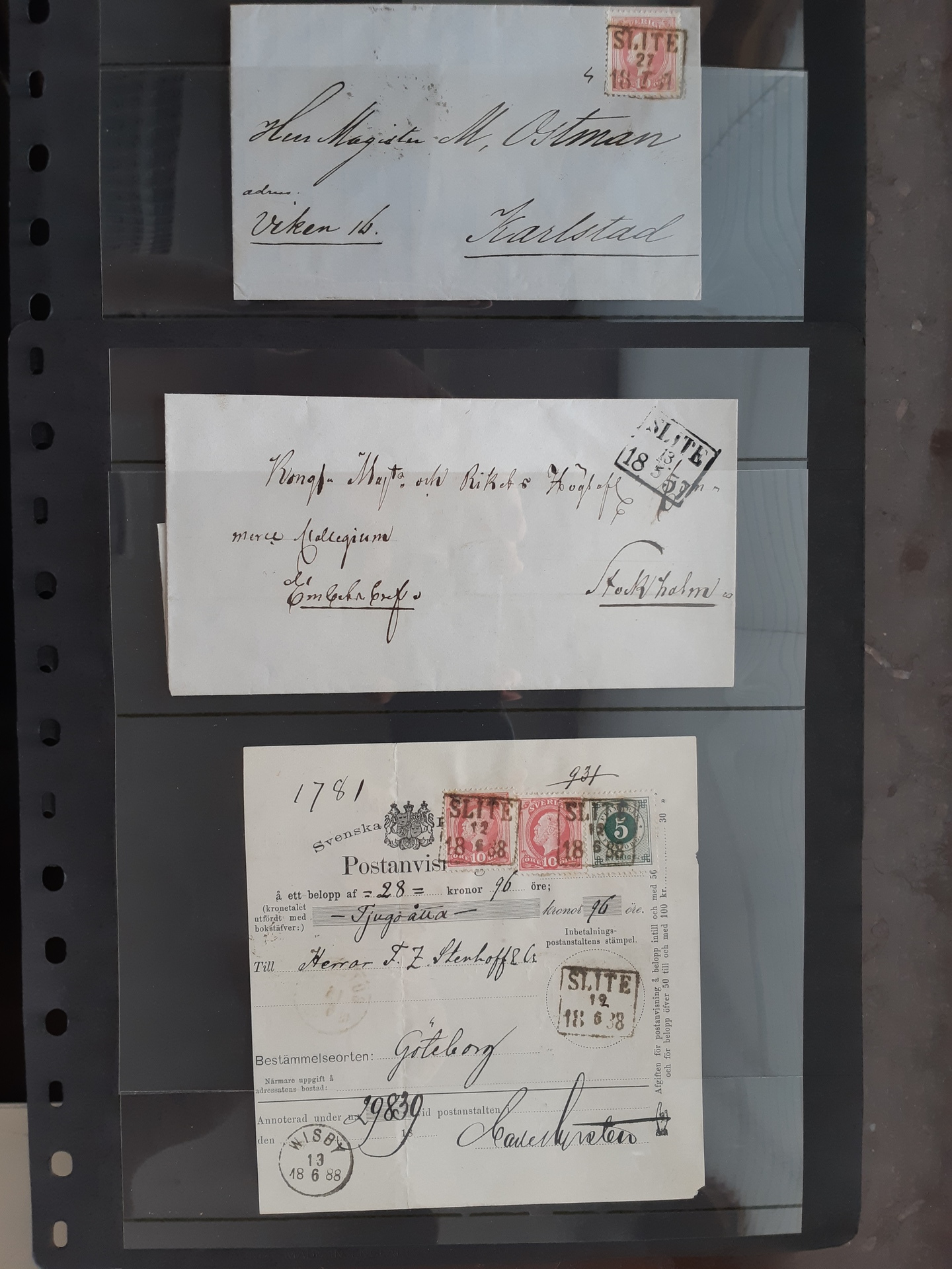 Sweden. Cancellations, collection SLITE on visir leaves. Lovely lot with rectangular pmks on Coat-of-Arms–Oscar / Officials, plus one stampless cover 1857, one wonderful money order and one cover 1887–1888. Unusual offer. The entire lot is presented at www.philea.se. (21+3)