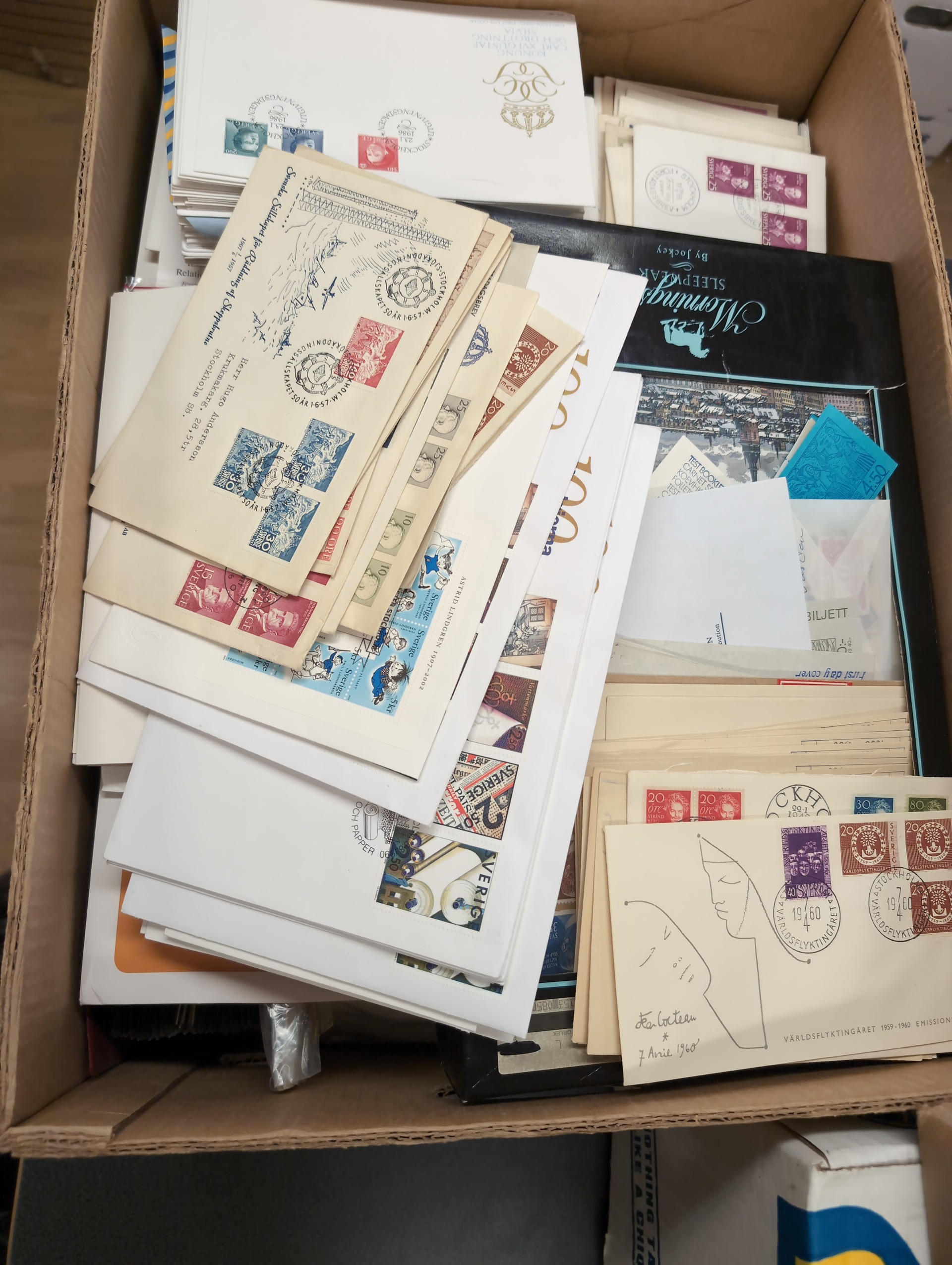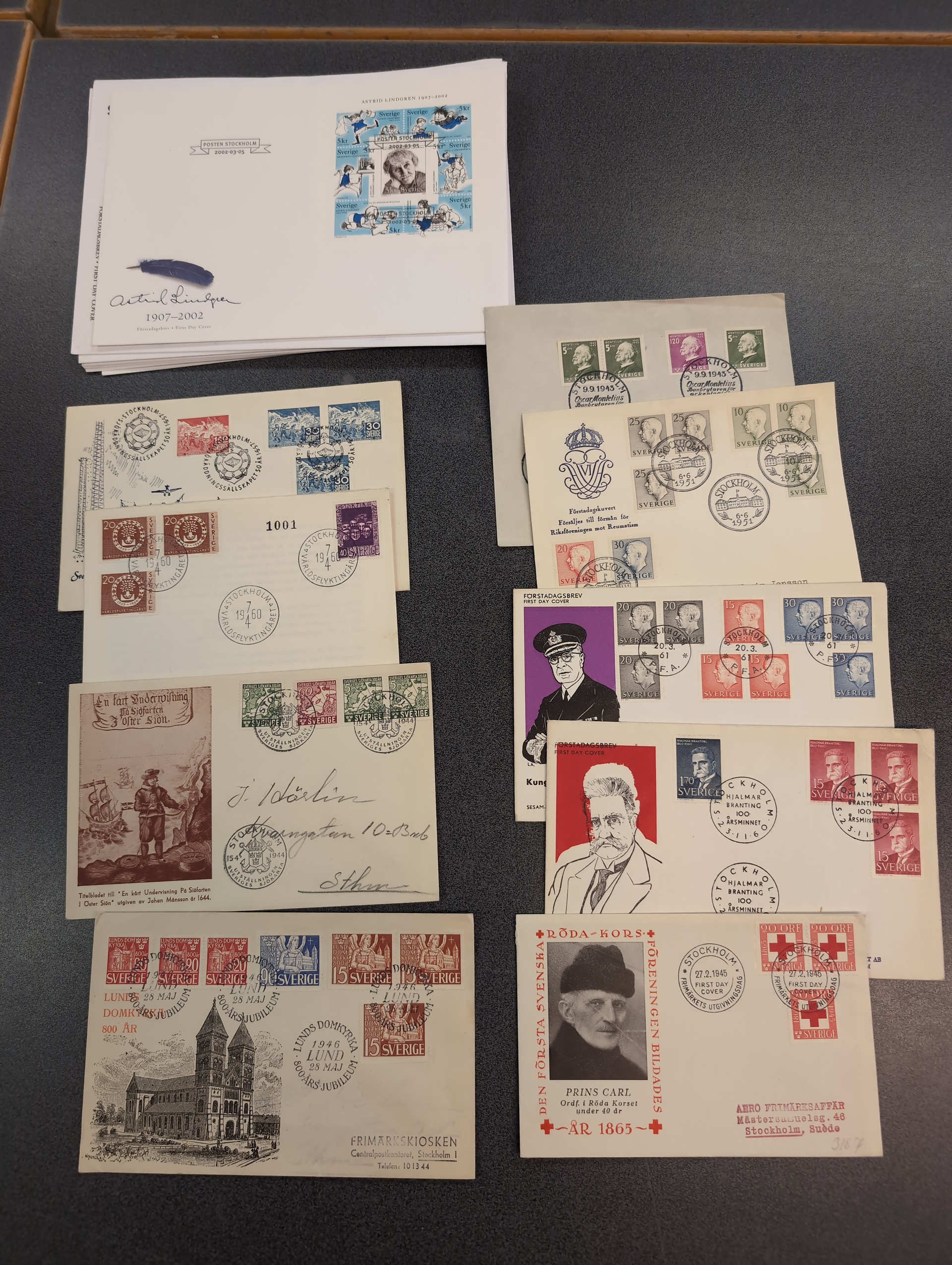 Sweden. FDCs, accumulation 1940s–2015 in three banana boxes. Several overlapping collections with duplicates up to ca. 2007, later more or less one of each. Eleven brown and six blue Posten binders. One of the boxes with mostly loose and four old cover albums. Please see a selection of scans at www.philea.se. Mostly fine quality. Approx. 45 kg. (1000s)