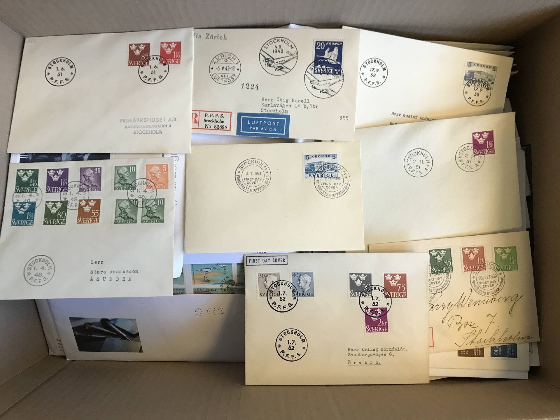 Sweden. FDCs. Removal box with FDCs ca. 1940–2013 incl. e.g. 14.7.41, 4.5.42, 1.4.48, 1.6.51, 2.11.51 and 17.9.58, etc. Also some others. Approx. 11 kg.