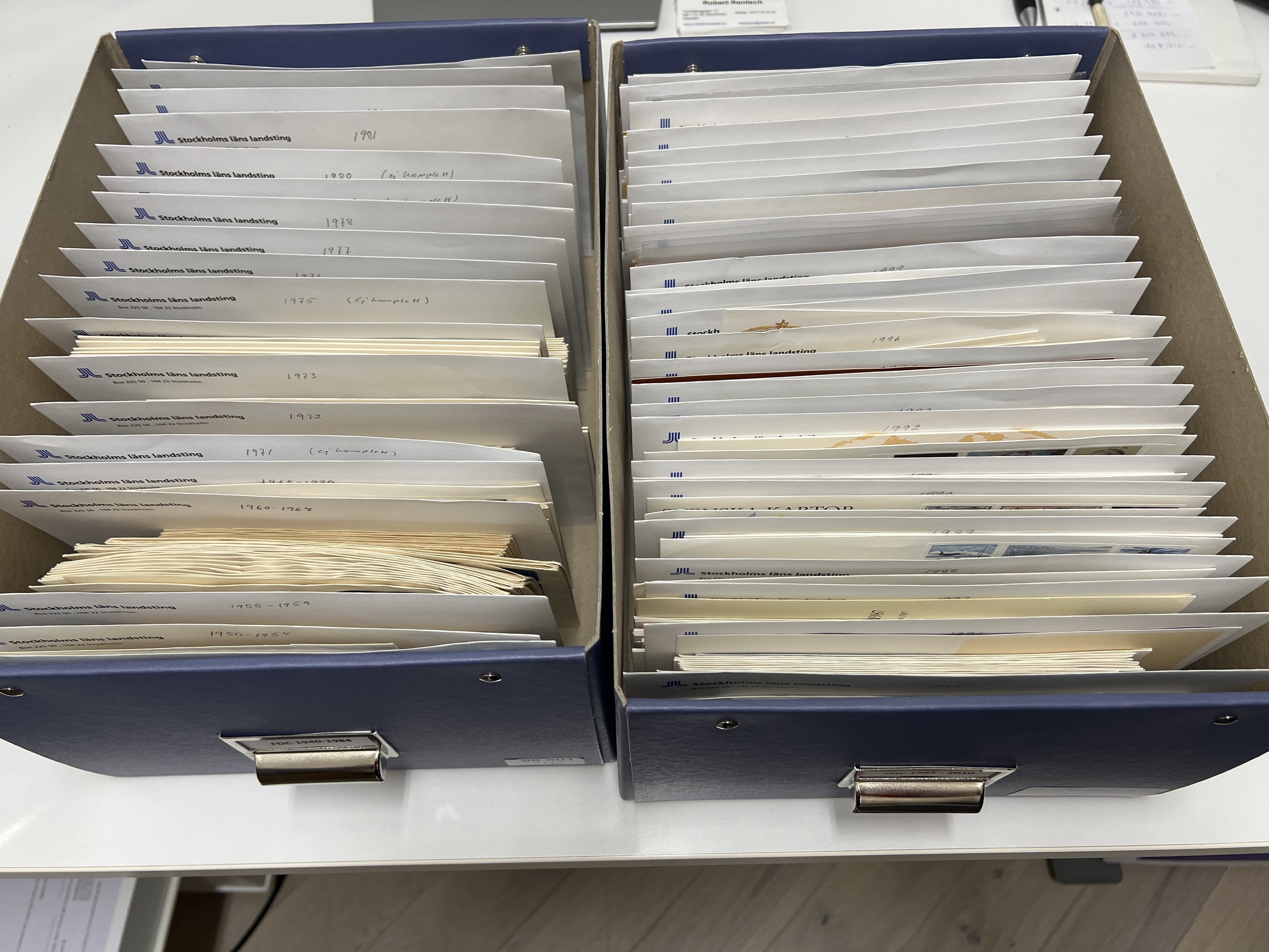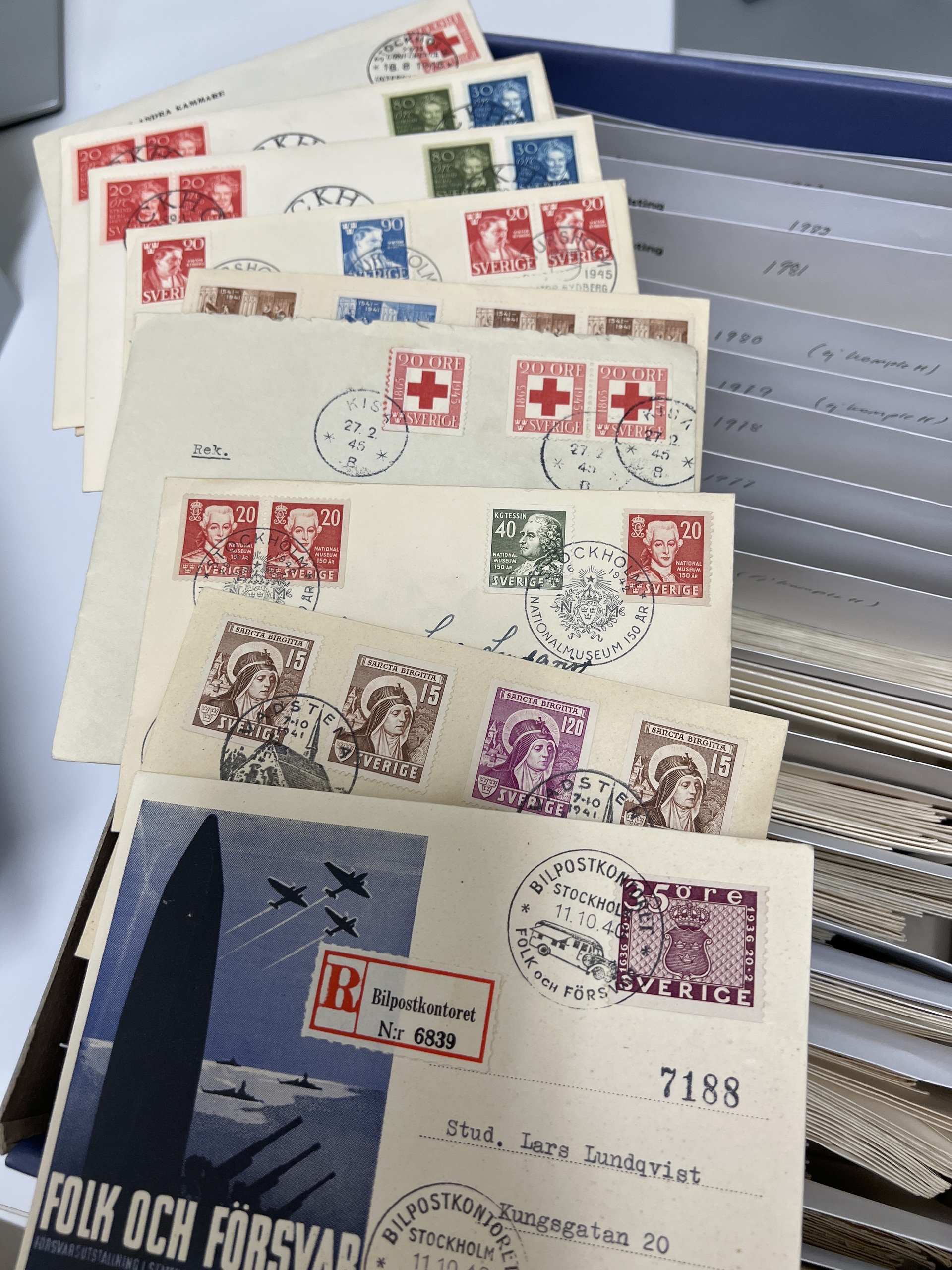 Sweden. FDCs, collection 1940–2010 in two boxes, in the beginning only a few, but later on it might be complete exept a few years, that are noted not to be complete. Plese inspect. Approx. 10 kg.