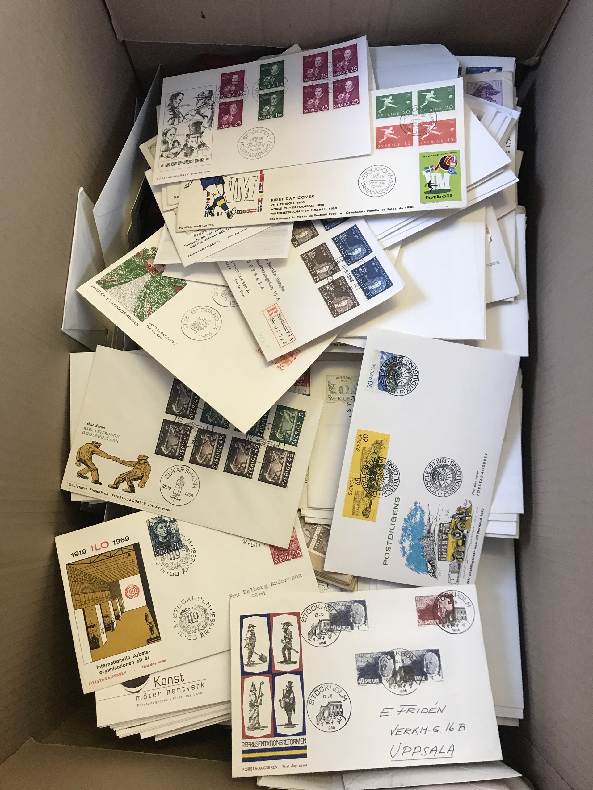 Sweden. FDCs. Removal box with 100s of FDCs old–modern incl. some vignettes, etc. Approx. 14 kg.