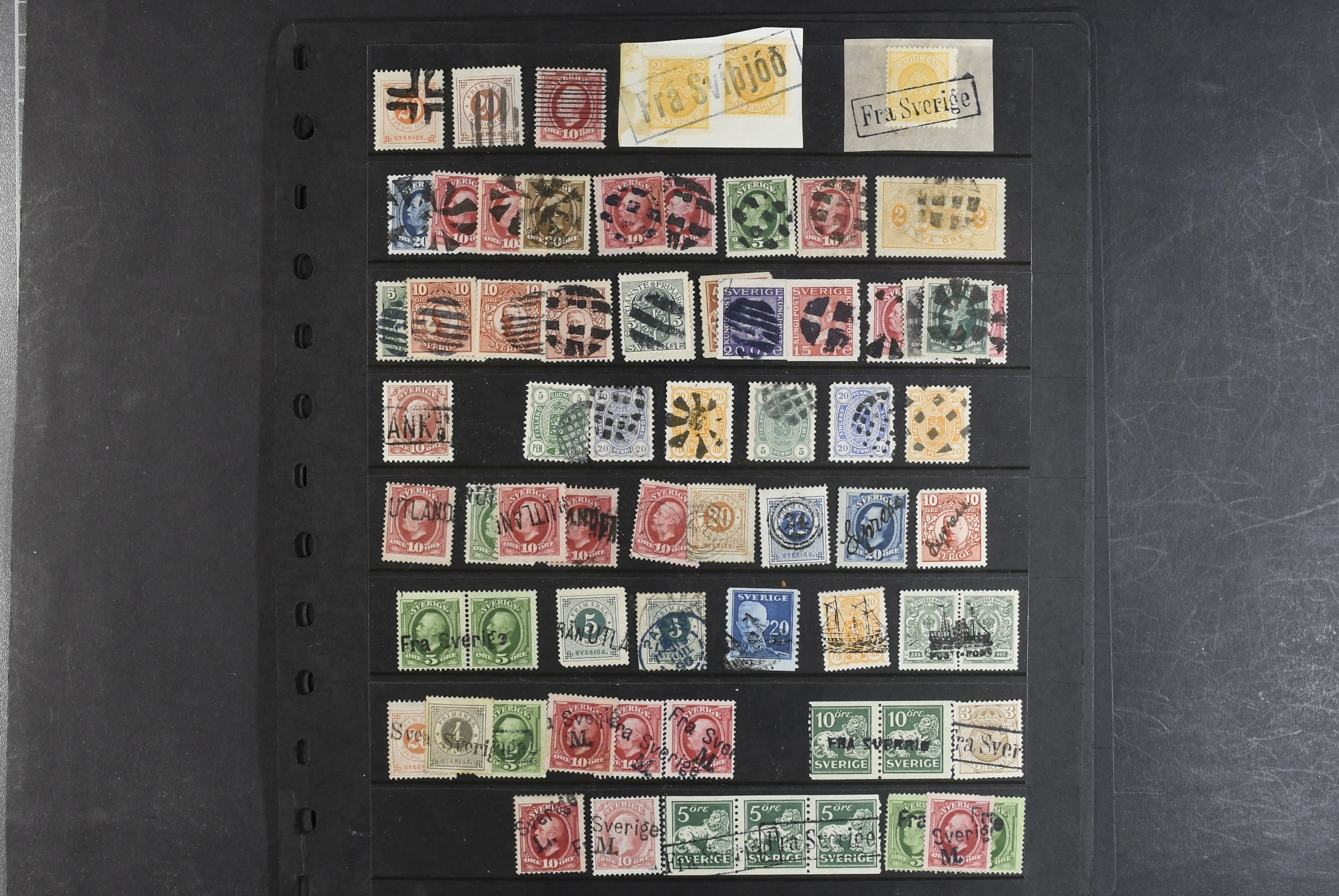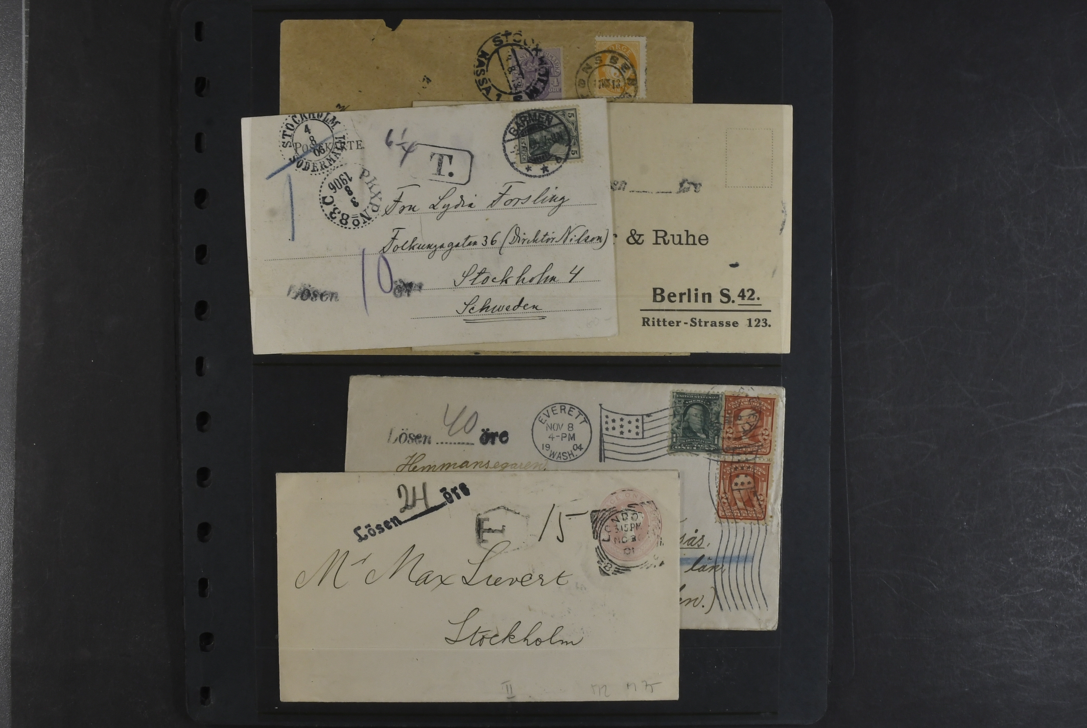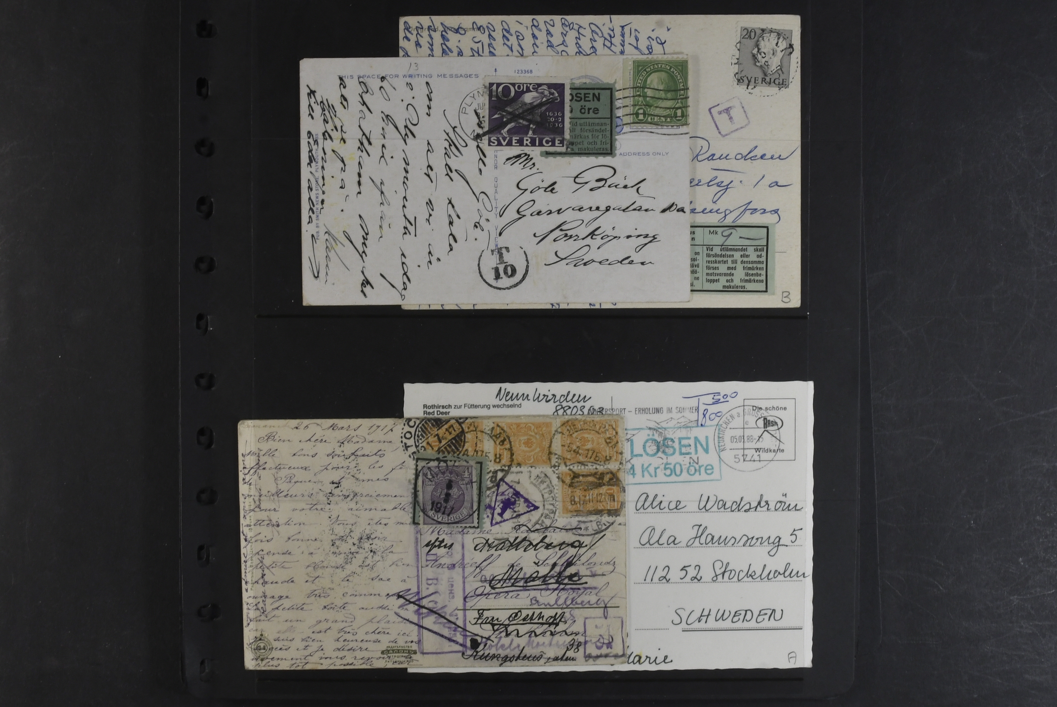 Sweden. Collection covers on visir leaves. 88 stamps and 45 covers and cards, mostly foreign cancellations and postage due marks. Also a few foreign material. Somewhat mixed quality.