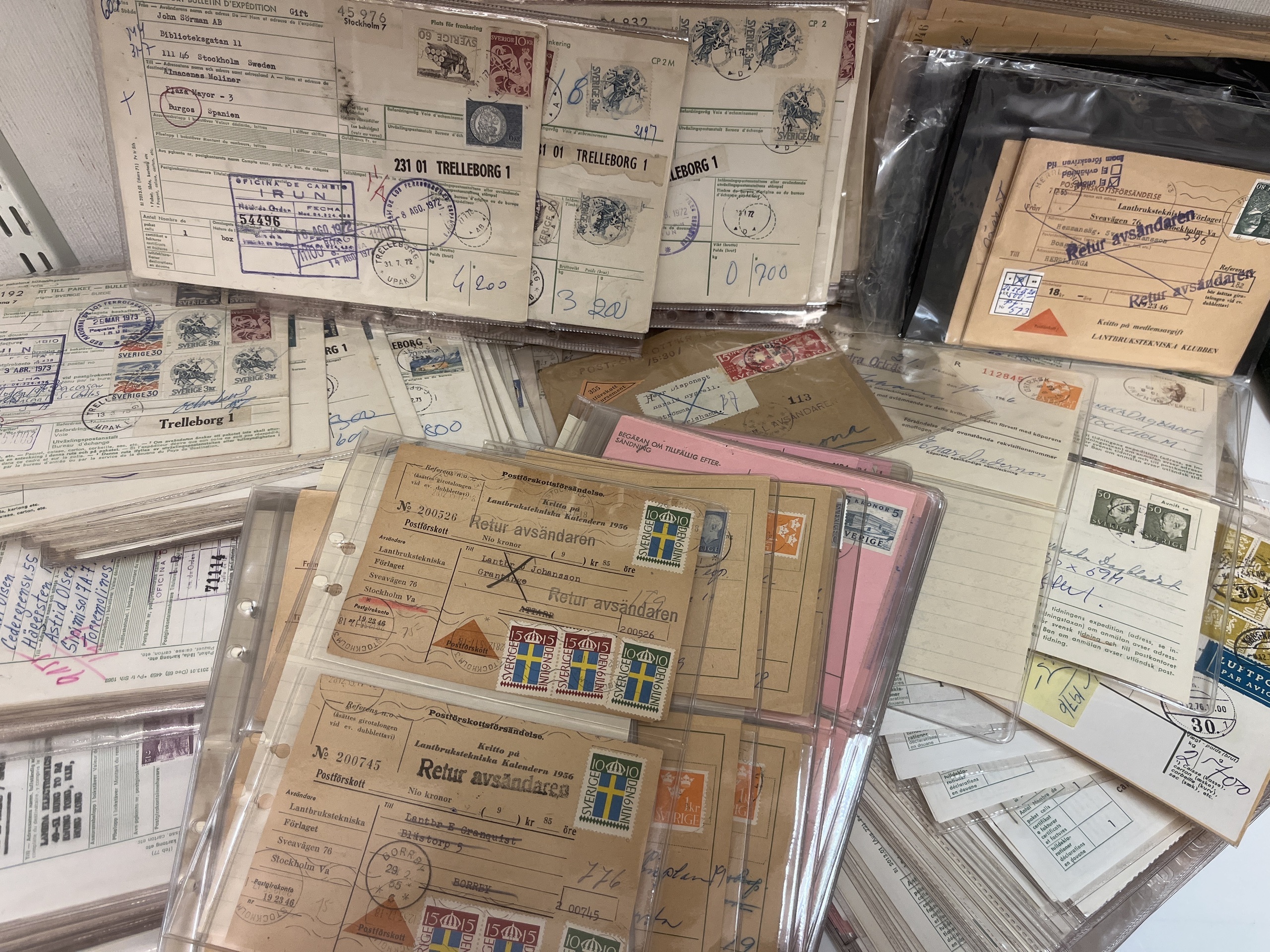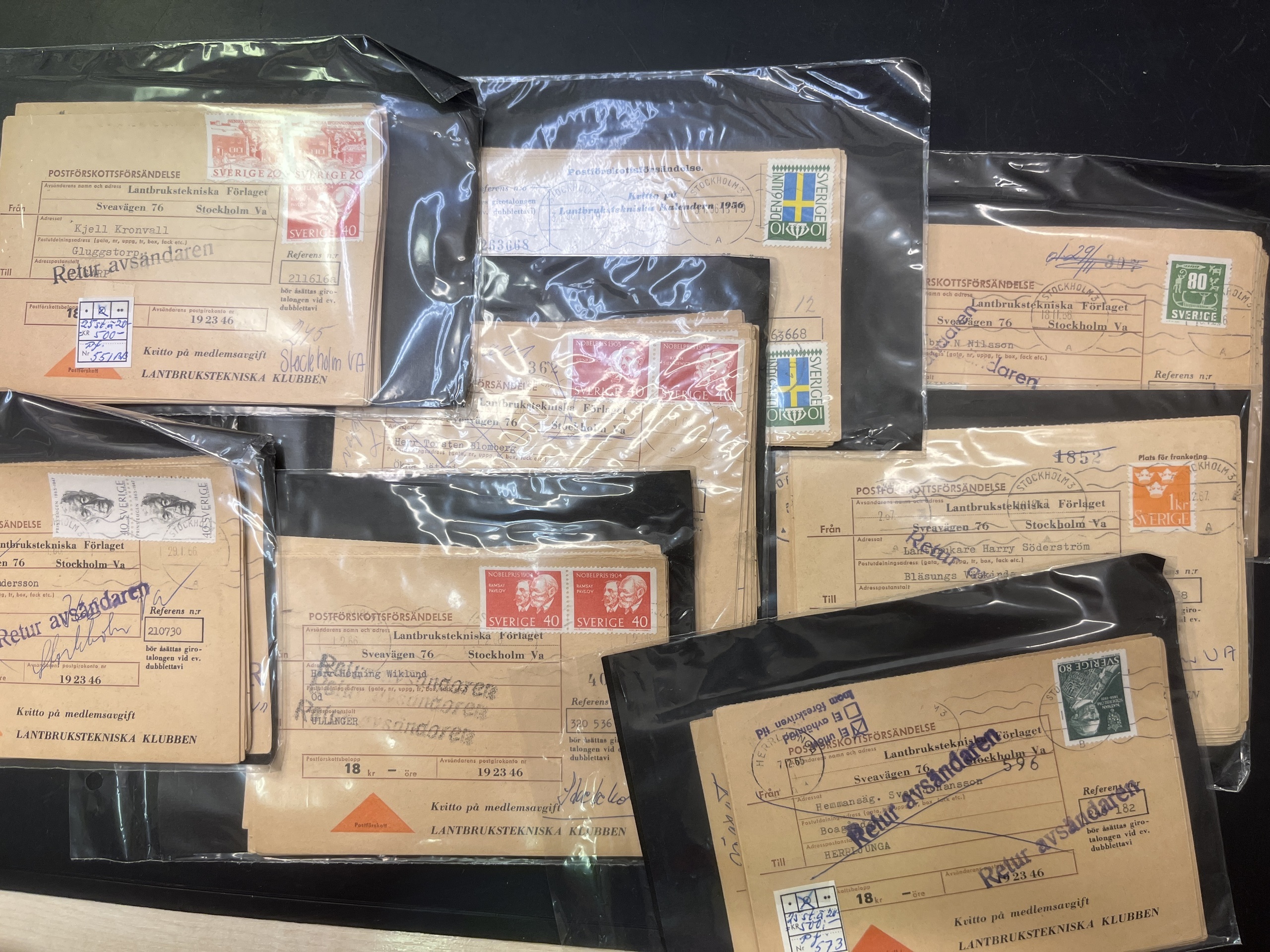 Sweden. Accumulation covers 1960–1970s in box. Postal documents, e.g. address card to Hong Kong. Please see a selection of scans at www.philea.se. Approx. 6 kg.