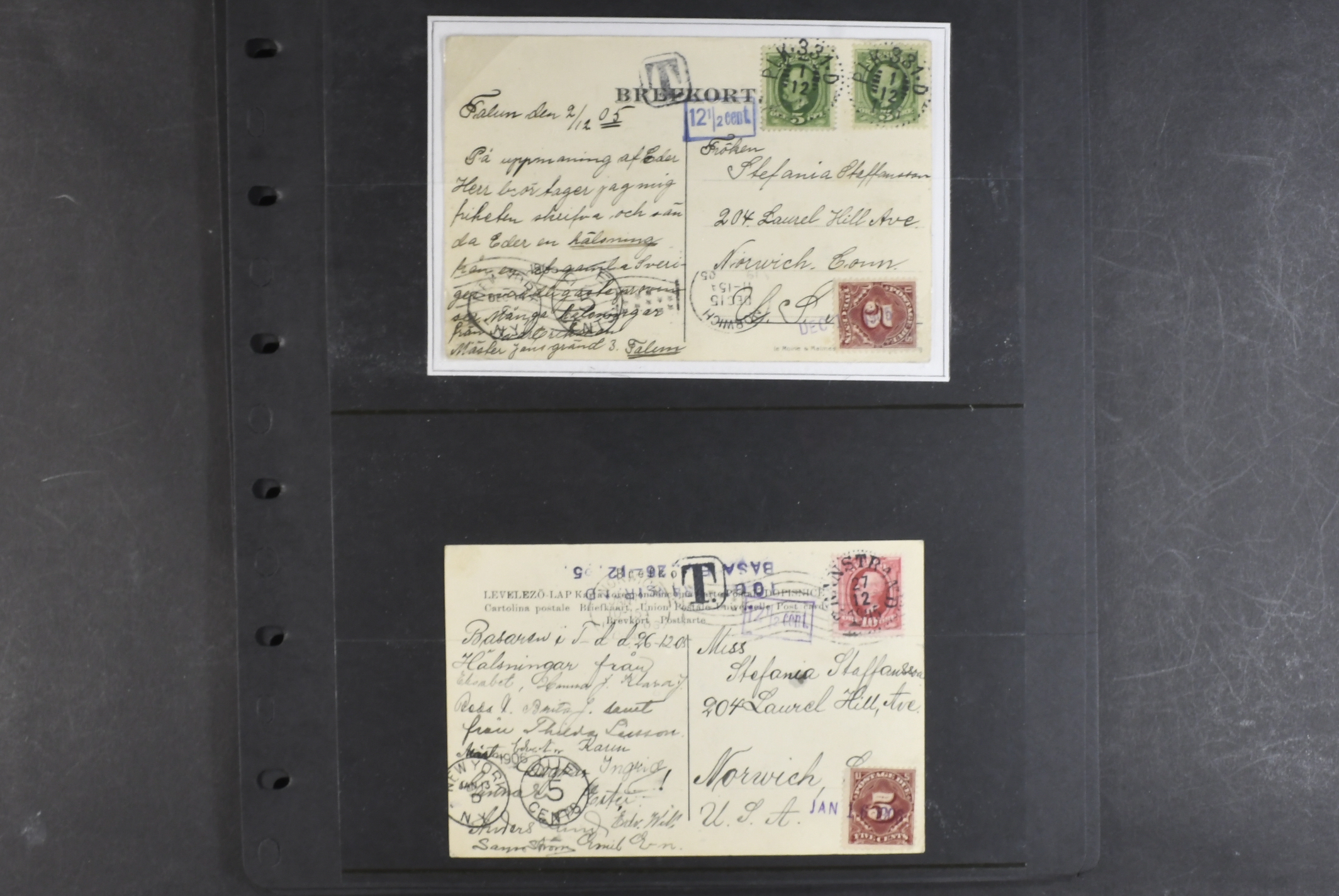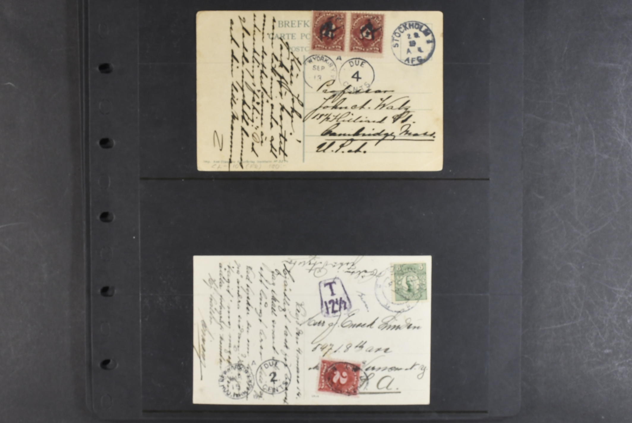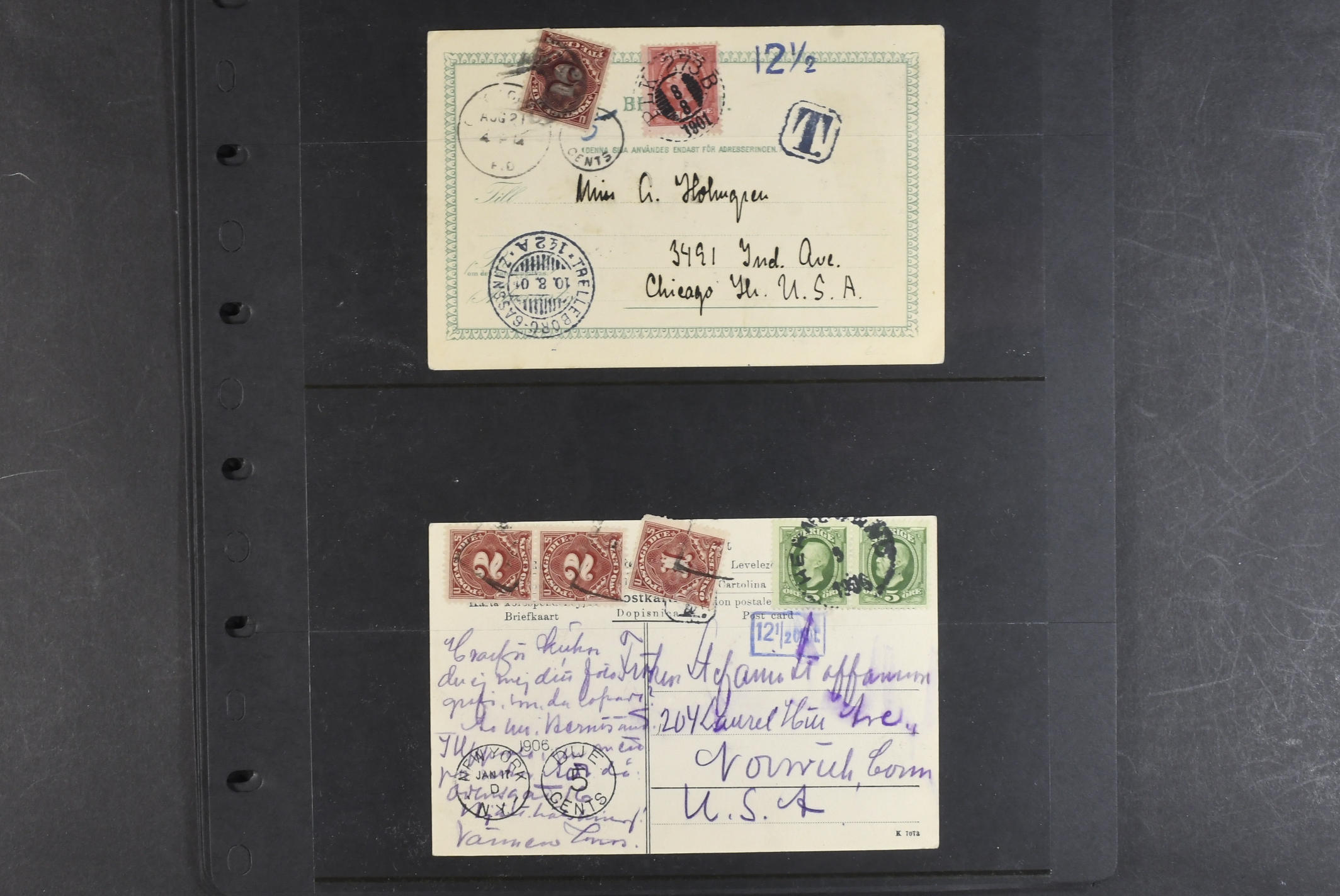 Sweden. Collection covers. Taxed postcards sent to USA 1901–1915, all with American postage dues. The entire lot is presented at www.philea.se. (13)