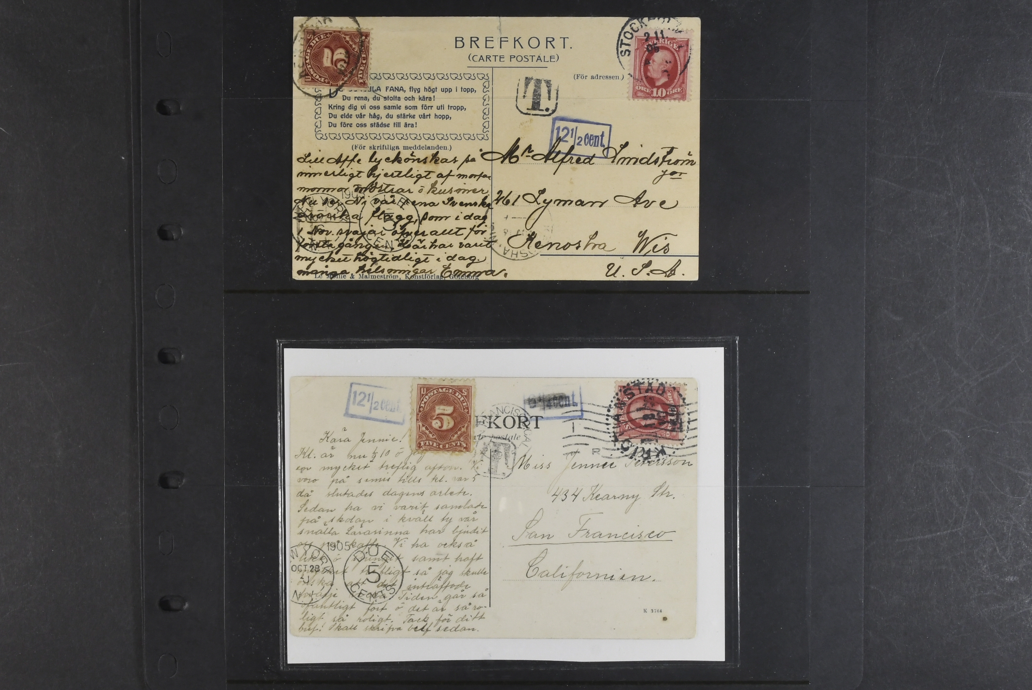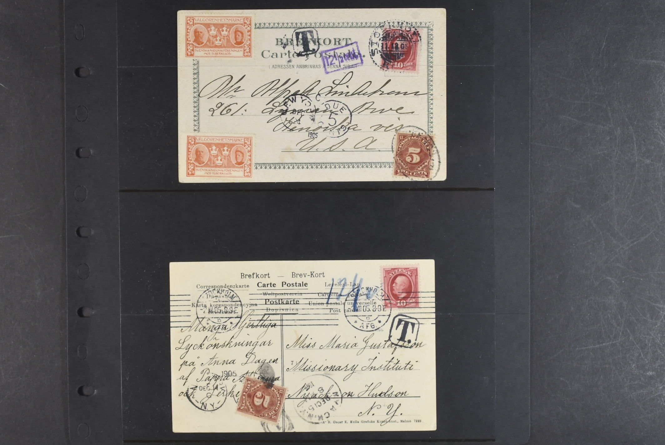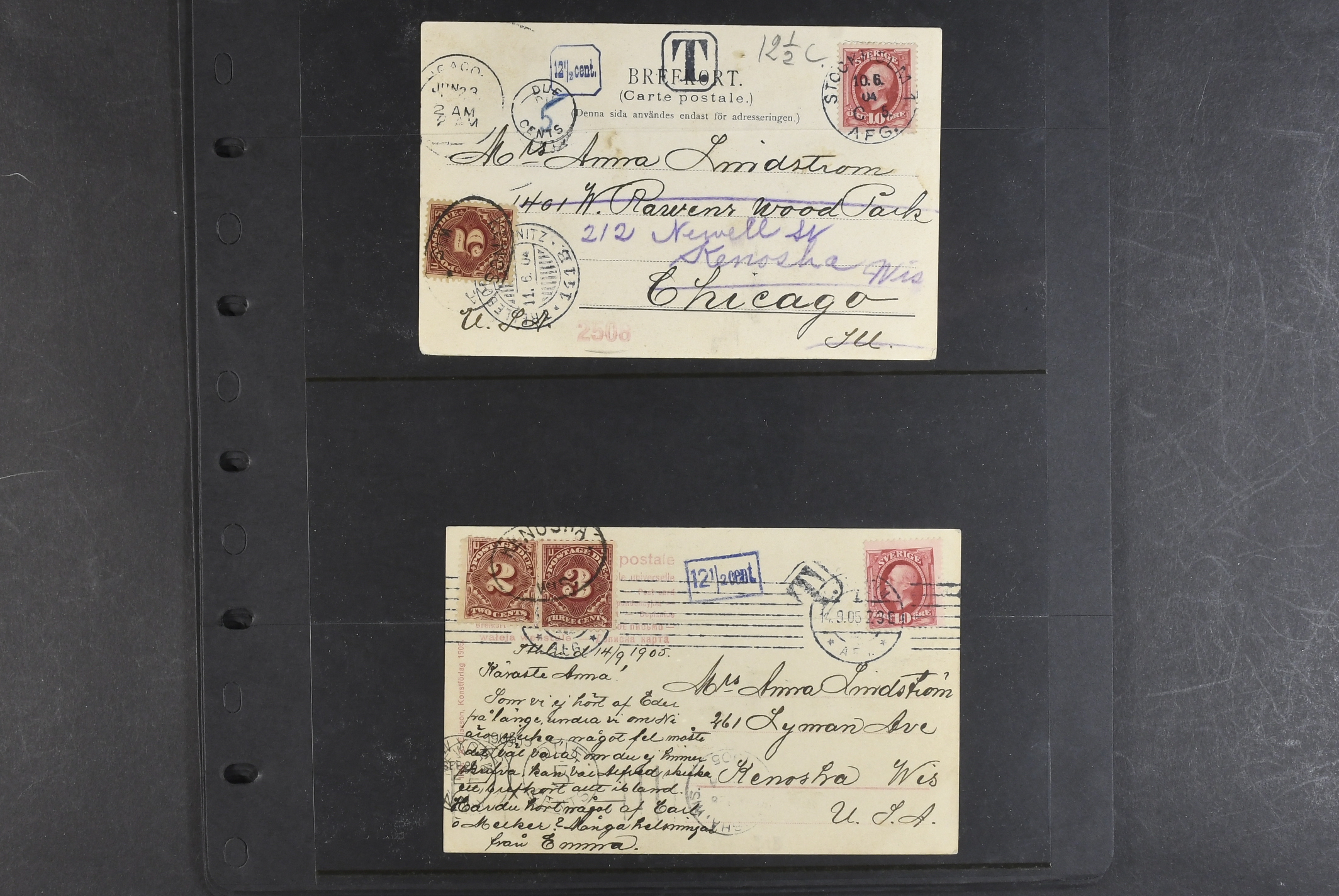 Sweden. Collection covers. Taxed postcards sent to USA 1901–1915, all with American postage dues. The entire lot is presented at www.philea.se. (13)