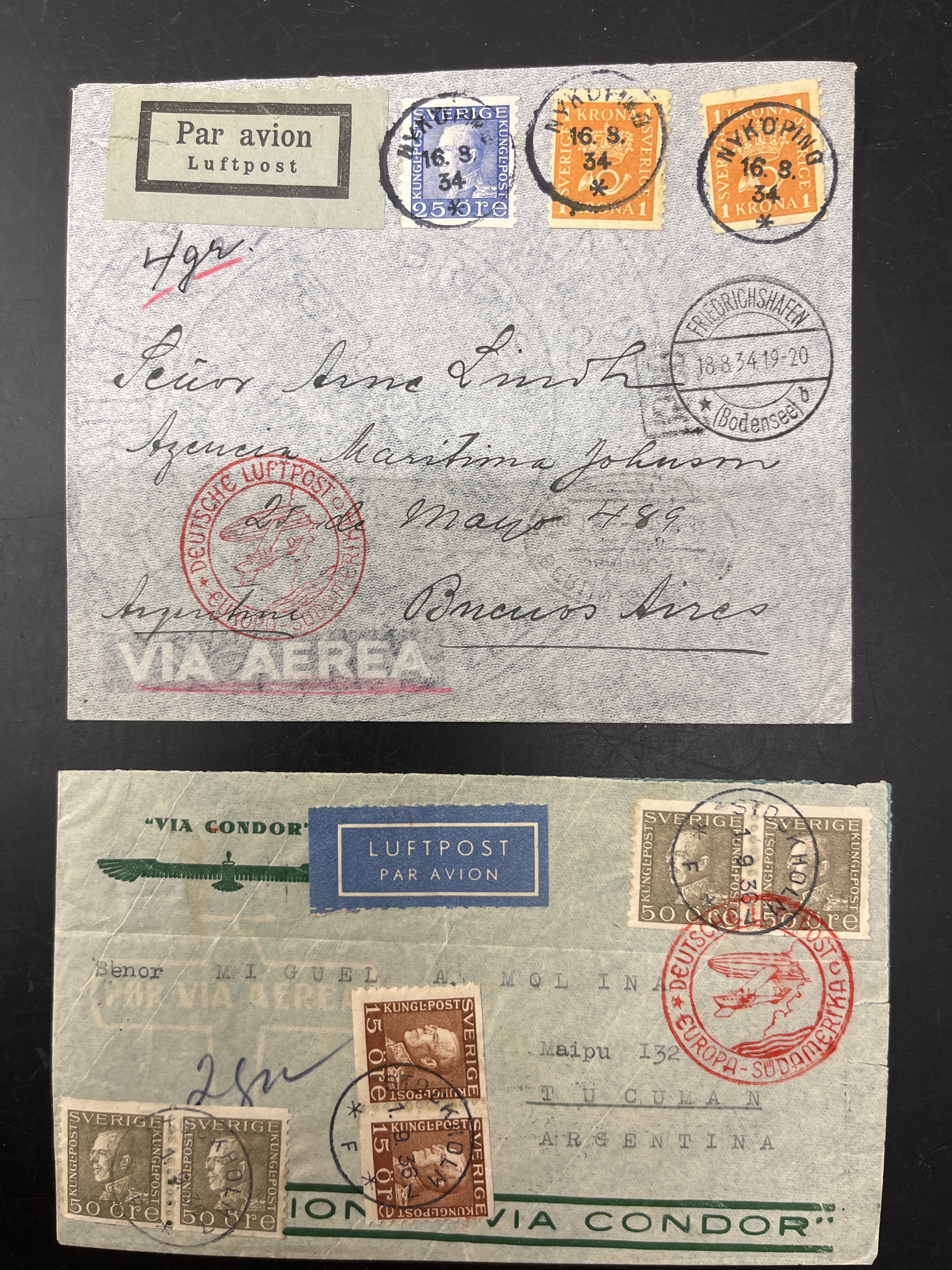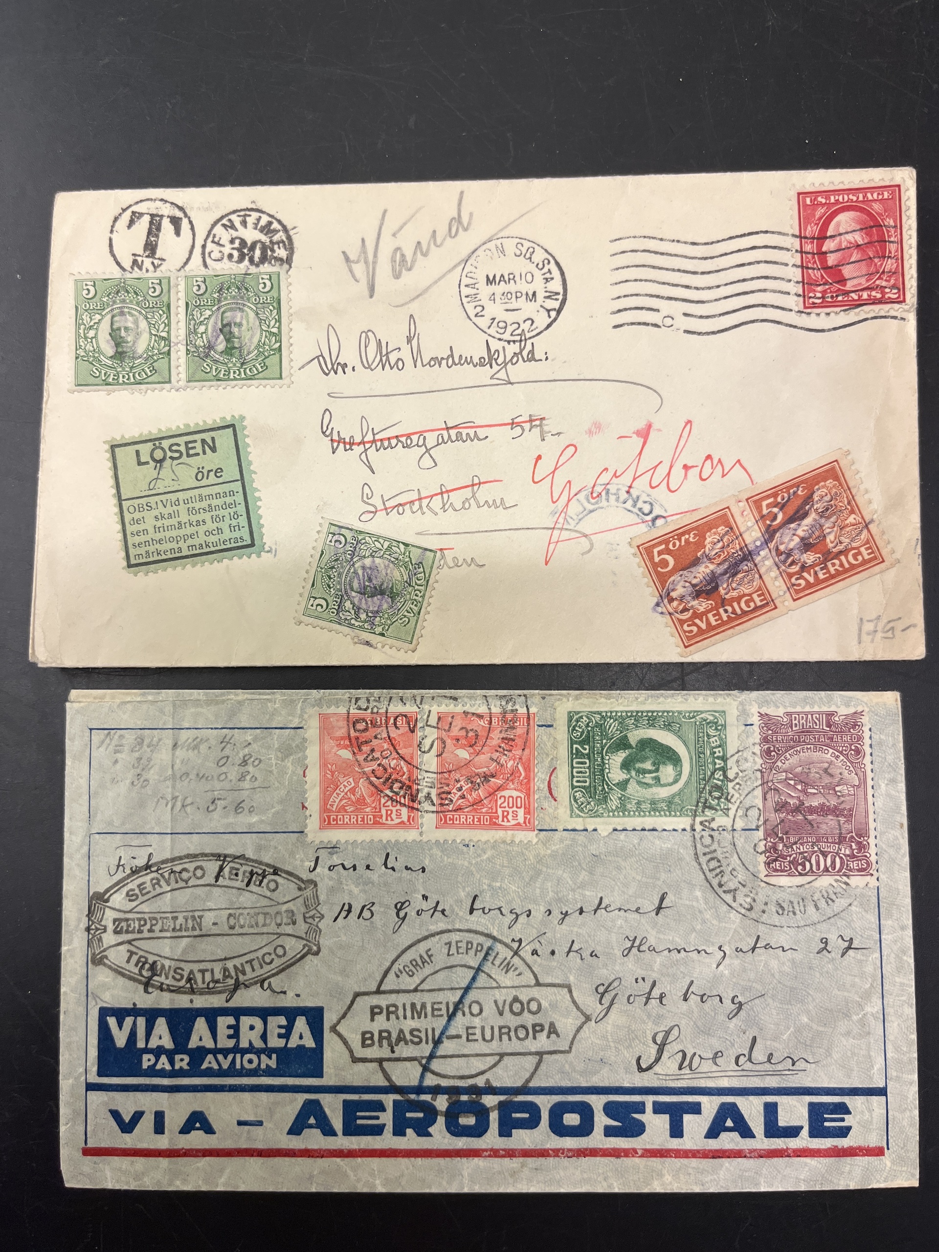 Sweden. Lot covers 1888–1936. with e.g. air mail covers from 1934, 1936 and a cover from Brasil to Sweden by Graf Zeppelin 1931. The entire lot is presented at www.philea.se.