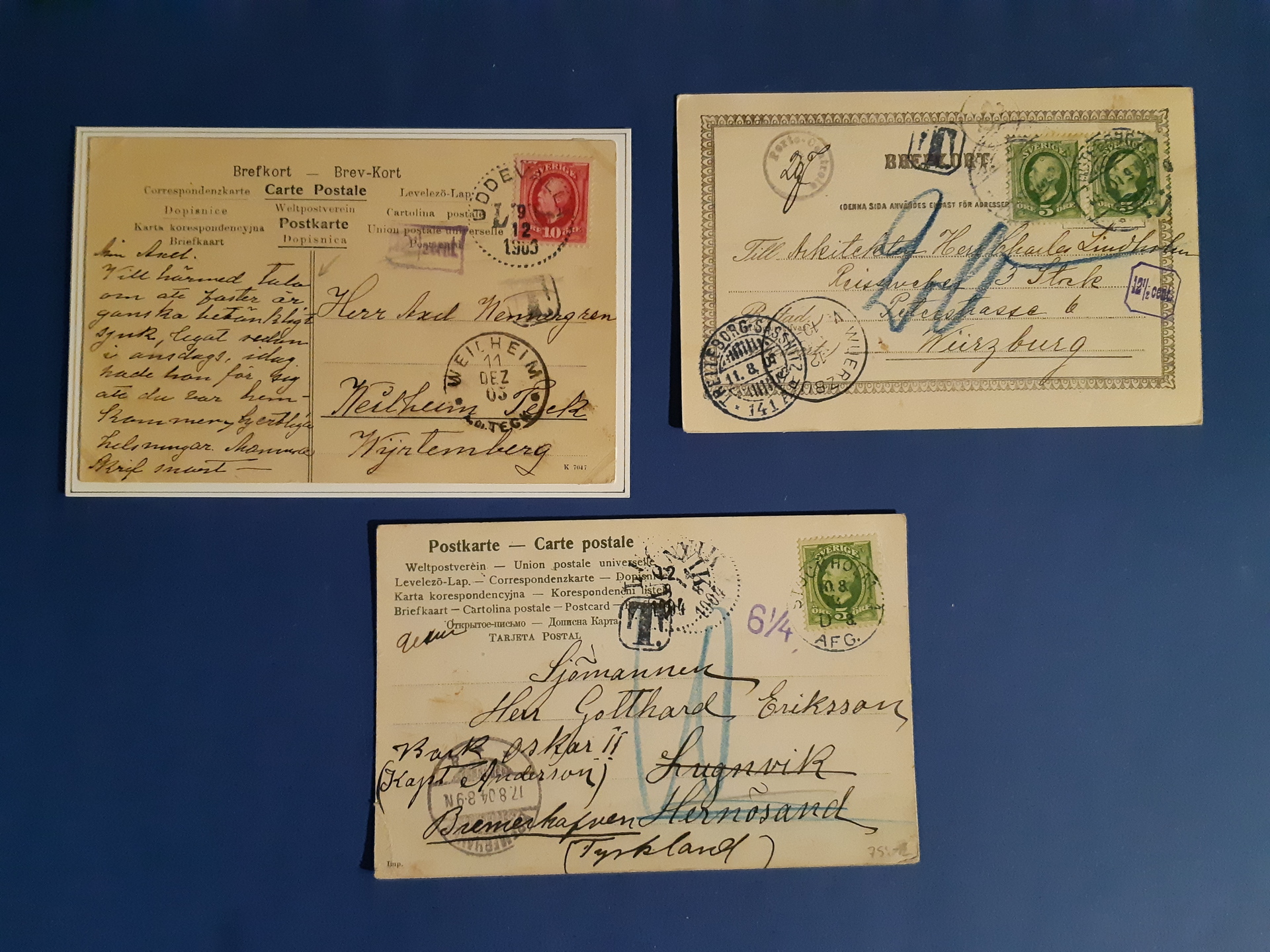 Sweden. Collection covers POSTAGE DUE. Postcards and one cover sent to foreign destinations incl. one with Norweigan postage dues, plus two postcards sent from Norway to Sweden. The entire lot is presented at www.philea.se. (13)