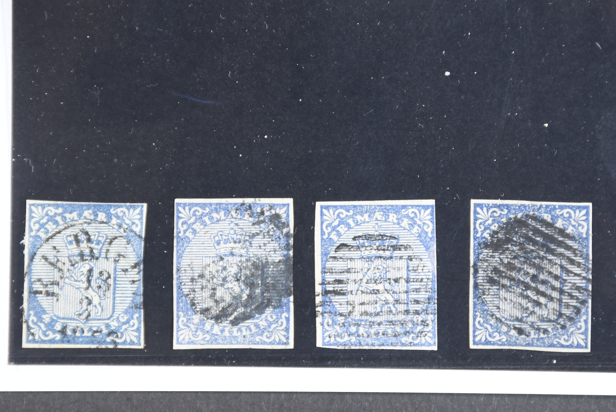 Norway. Facit 1 used, 1902 Surcharge “Í GILDI” 3 aur yellow, small “3”, perf 12¾, black overprint. Four examples with small margins and two somewhat cut into the margin. SEK 8800