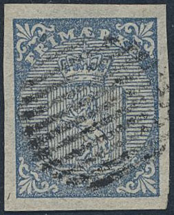 Norway. Facit 1 used, 1855 Coat-of-Arms 4 skilling blue. Nice copy with 11 lines in the cancel.