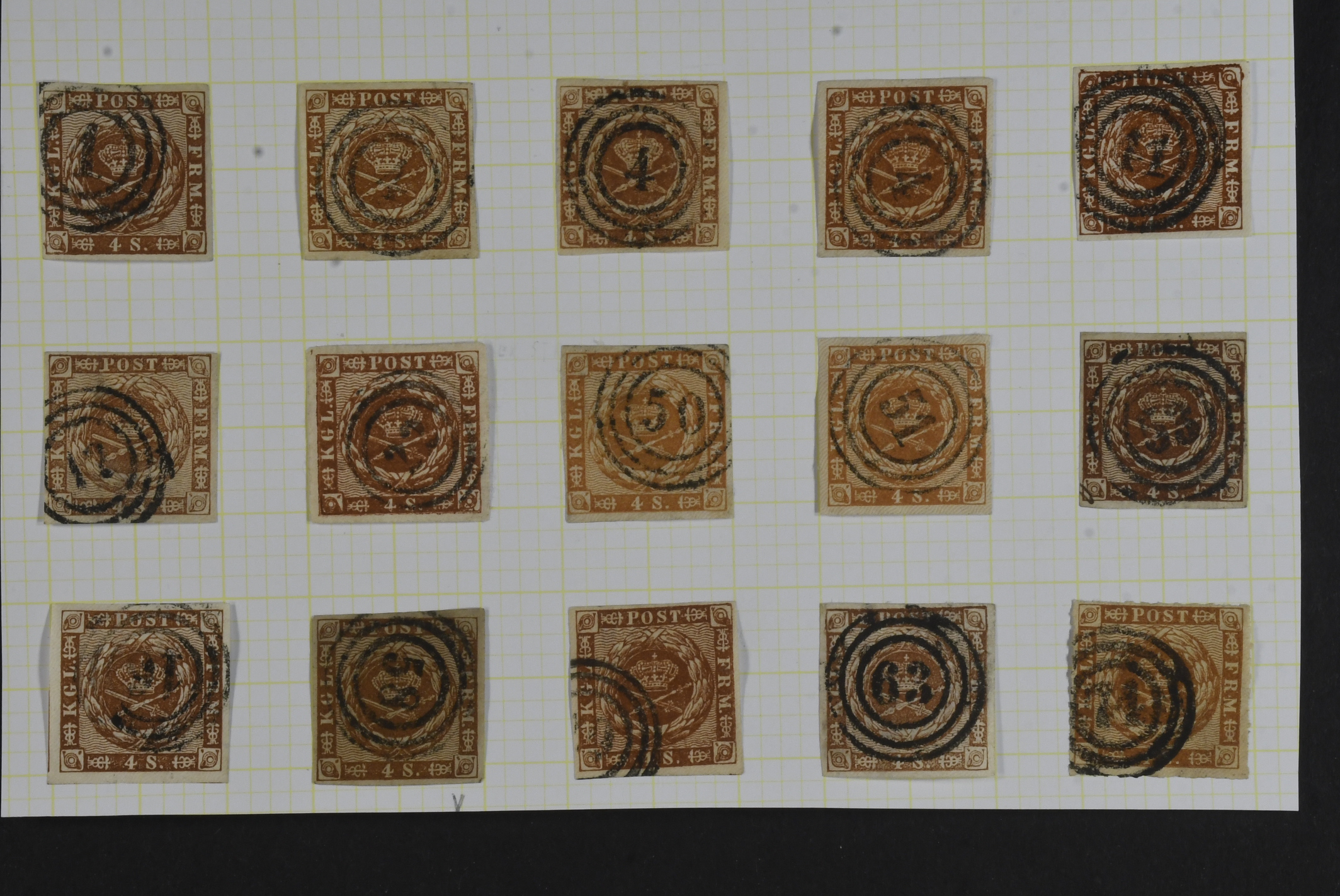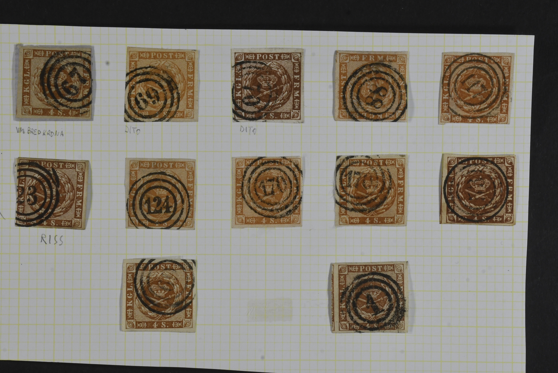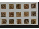 Denmark. Facit 7 used, 1858 Imperforate. Wavy-line spandrels 4S brown. 27 ex. in several shades and several with nice cancels.