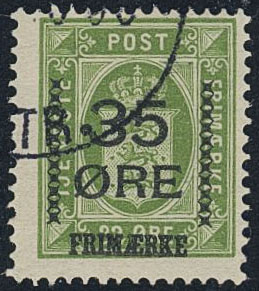 Denmark. Facit 122a used, 1912 Surcharge on Official stamps 35 / 32 øre yellow-green, watermark crown. Fresh copy of this very rare shade. SEK 14000