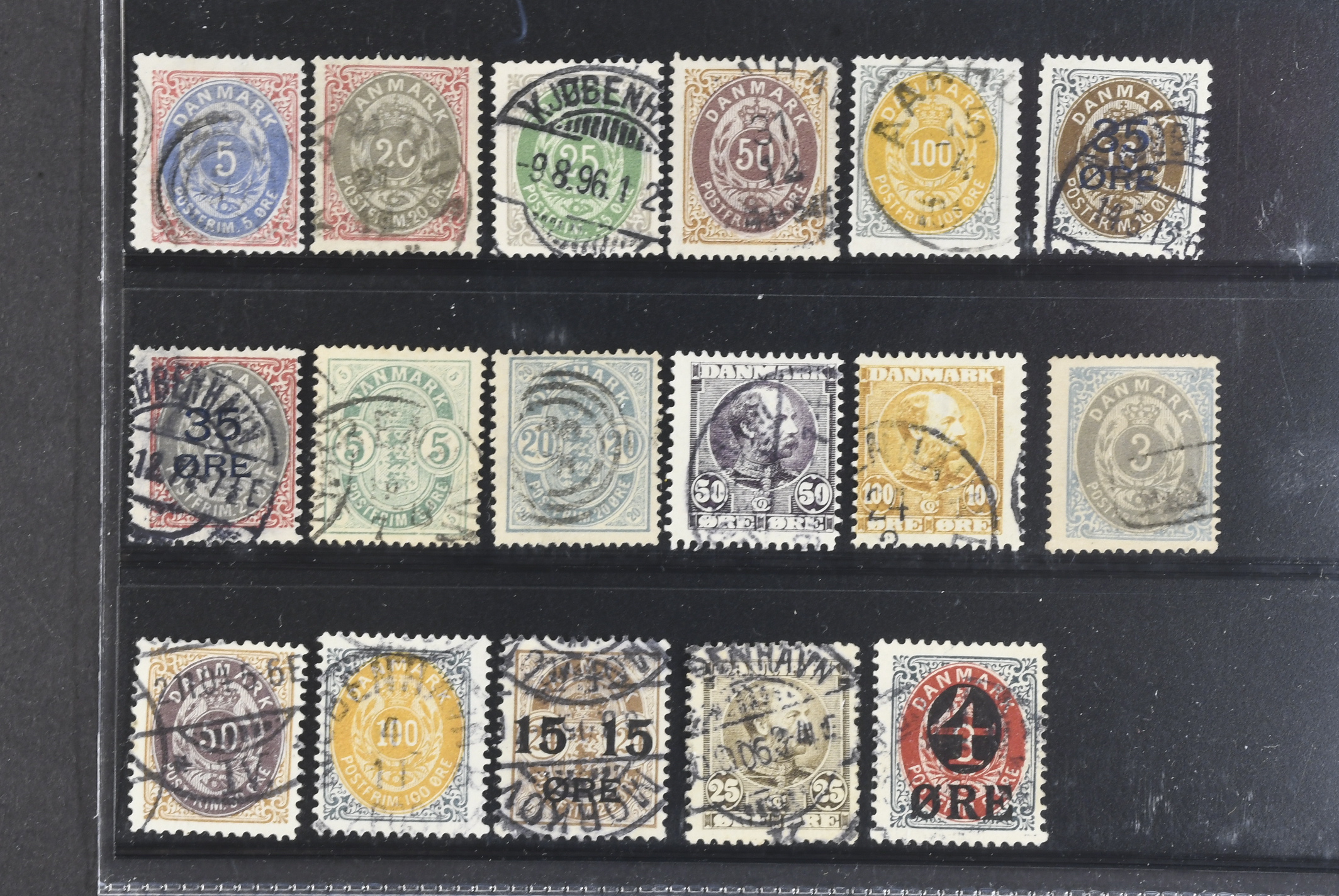 Denmark. Used 1895–1906. All different, e.g. F 30, 34–37, 47–48, 50, 52, 67–68. Mostly good quality. F SEK 7065 (17)