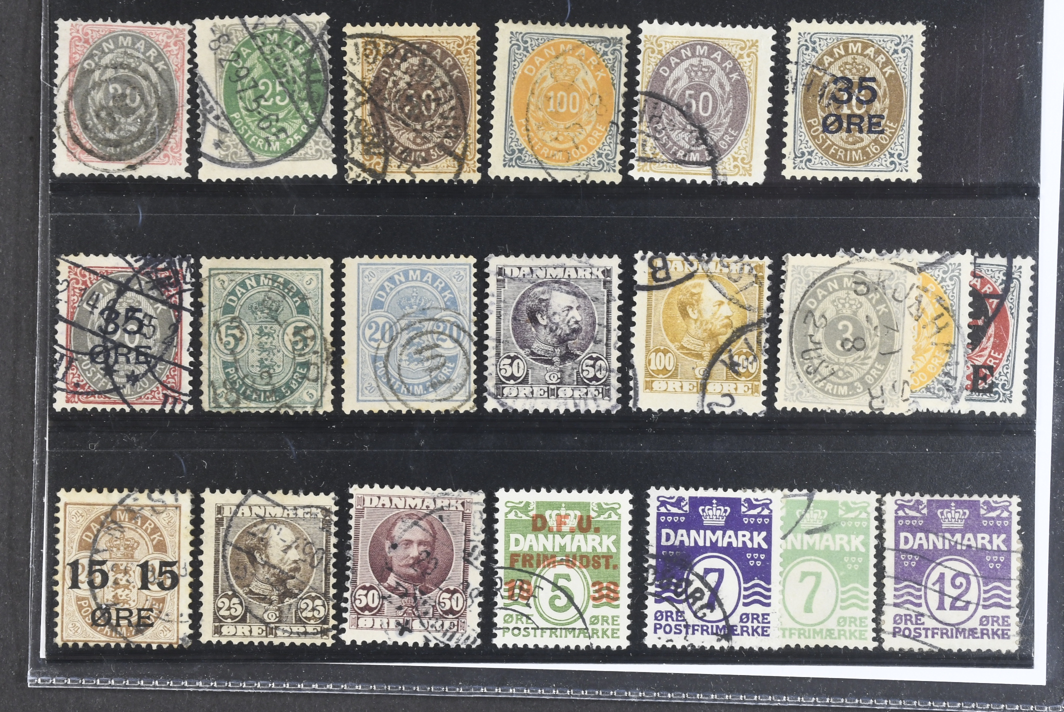 Denmark. Used 1905–1912. All different, e.g. F 34–37, 44, 47–48, 50, 52, 67–68. Mostly good quality. F SEK 6355 (21)