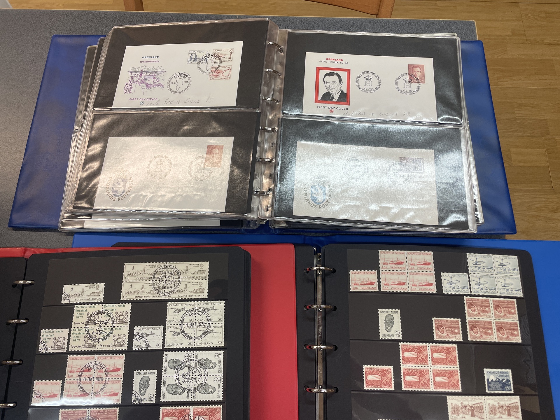 Greenland. Miscellaneous. Coll./accumulation both ** and used 1939–2000s in two visir binders + FDCs and some Maximi cards, etc. in five binders 1958–98 + 2009. Also 13 year sets 1987–2000, binder with ** Christmas stamps/sheets + various used dupl. Approx. 16 kg.