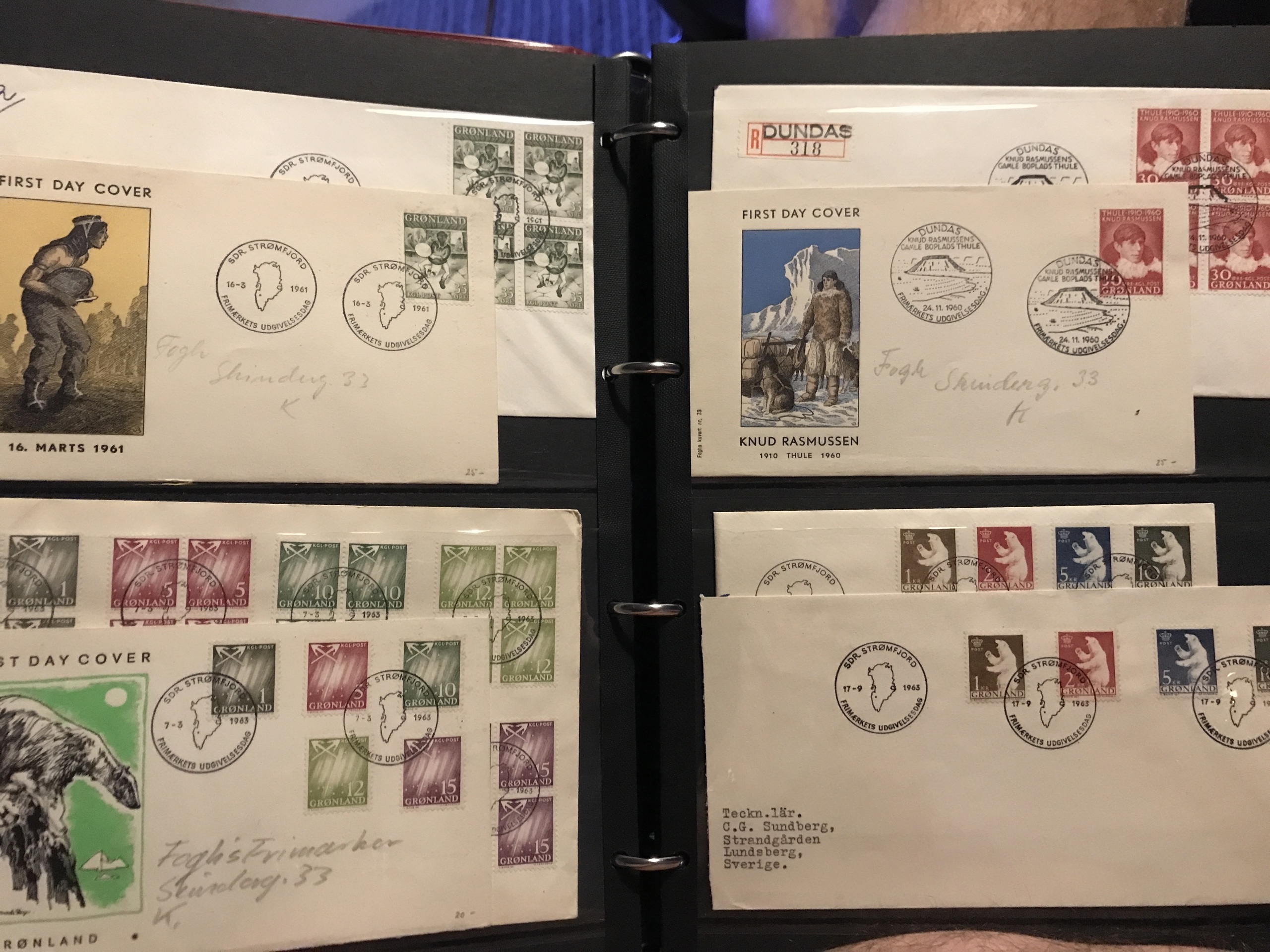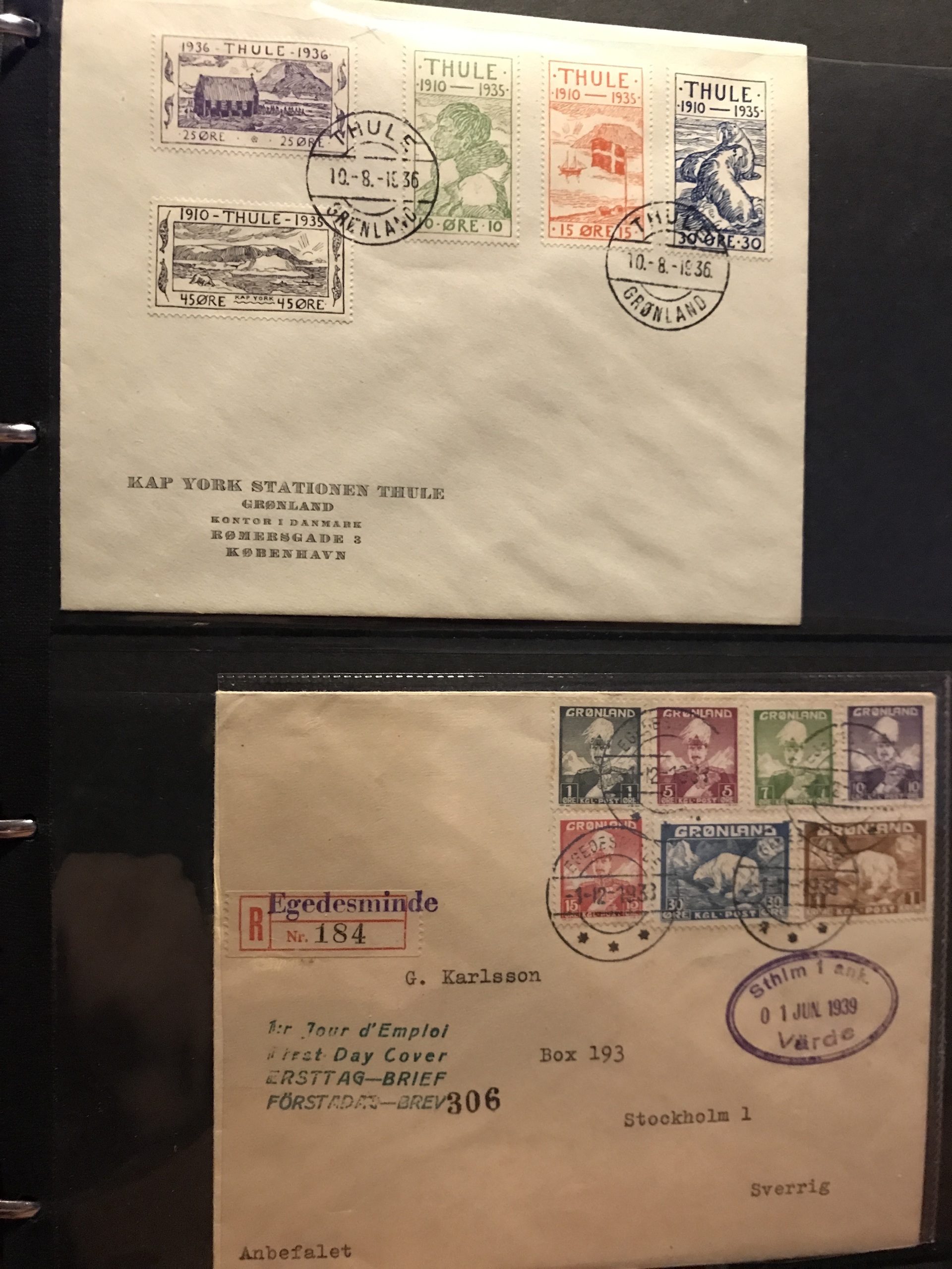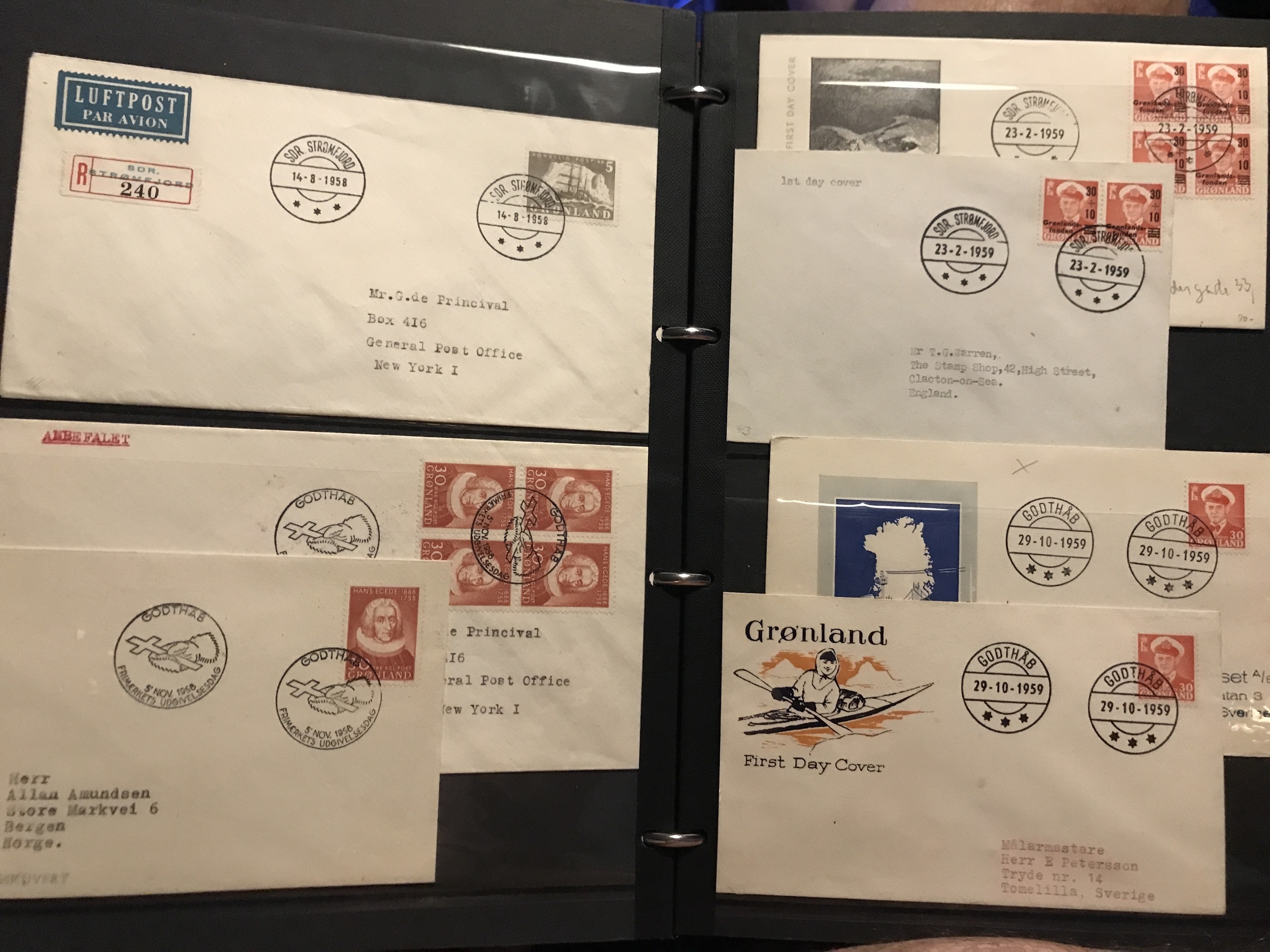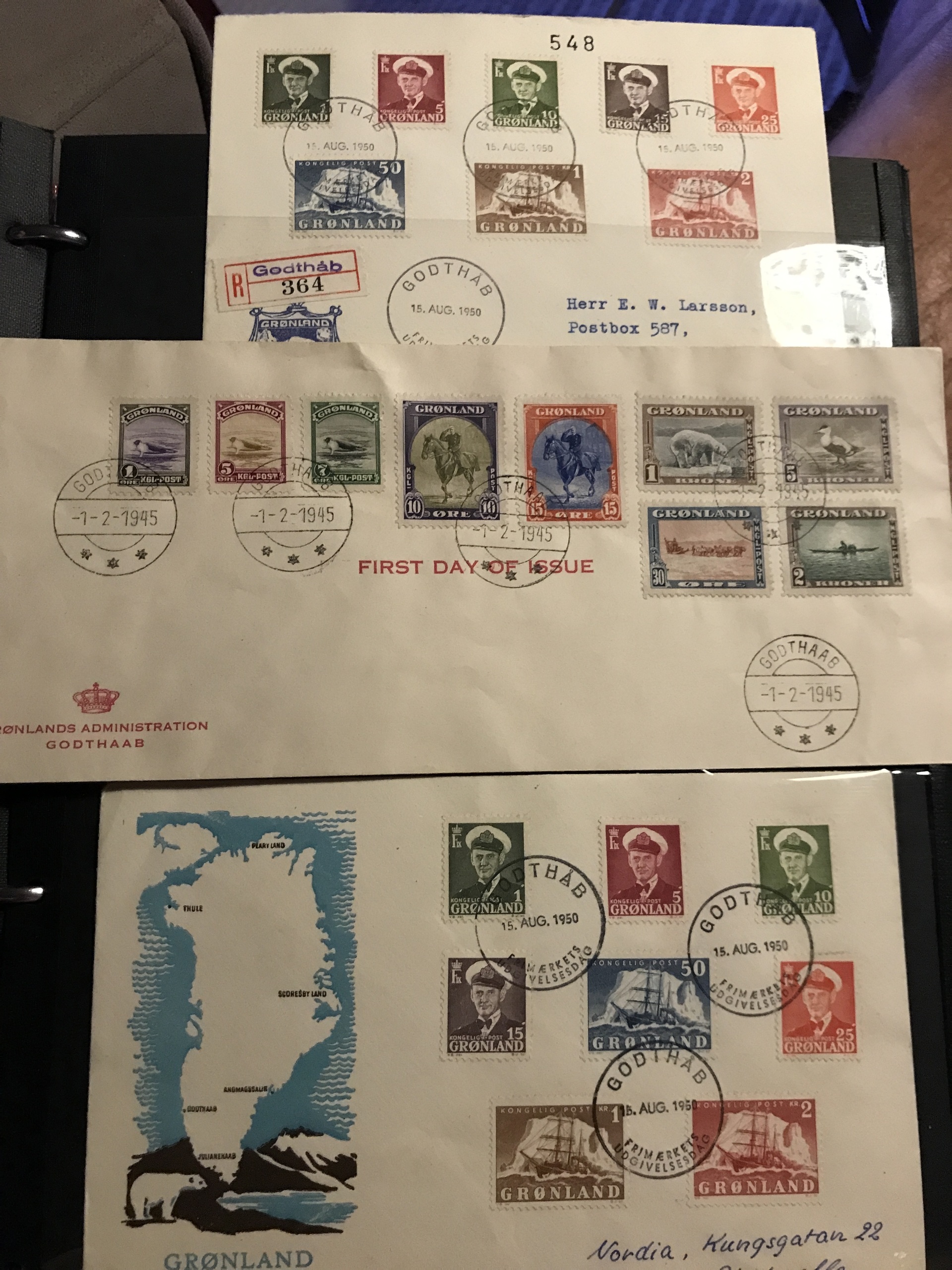 Greenland. FDCs. Collection 1938–82 incl. dupl. E.g. 1.12.38, 1.2.45, 15.8.50, 14.5.58, 17.9.63, 27.11.69, Thule 10.8.36, many vignettes and blocks-of-four, etc. Please see a selection of scans at www.philea.se.