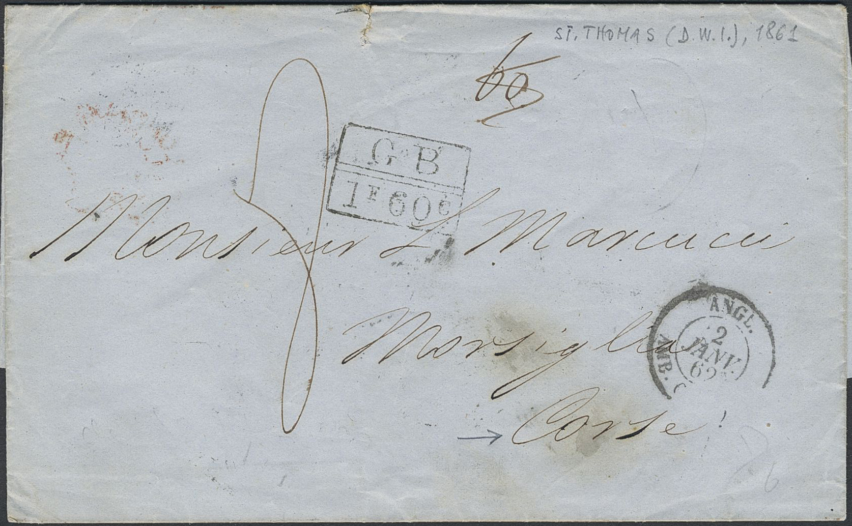 Danish West Indies. Prephilately, Letter sent from ST THOMAS 13.DE.1861 via LONDON 1.JA.62 to Corsica, France. Accountancy mark GB 1F60c.