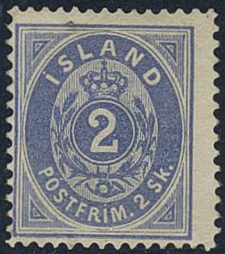 Iceland. Facit 1 (★), 1873 Skilding values 2 sk blue, perf 14 × 13½. Regummed. SEK 9500 if *