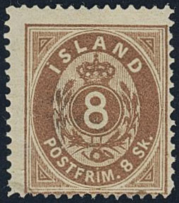 Iceland. Facit 3 ★, 1873 Skilding values 8 sk brown, perf 14 × 13½. Off-centered and thin corner. SEK 3000