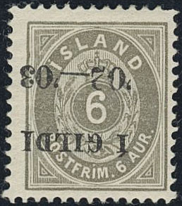 Iceland. Facit 52v1 ★, 1902 Surcharge “Í GILDI” 6 aur grey perf 12¾, black inverted overprint.