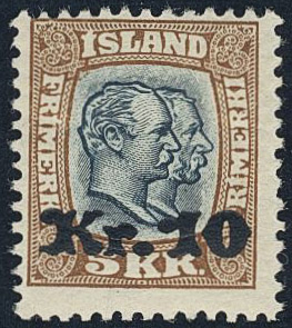 Iceland. Facit 107 ★, 1930 Surcharge on Two kings 10/5 Kr blue-grey/brown. Almost off-centered. SEK 4000