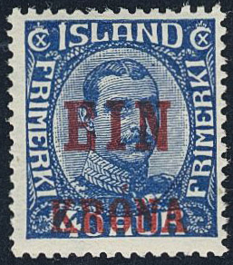 Iceland. Facit 159 ★★, 1926 New value overprint EIN KRONA / 40 aur blue. SEK 5000