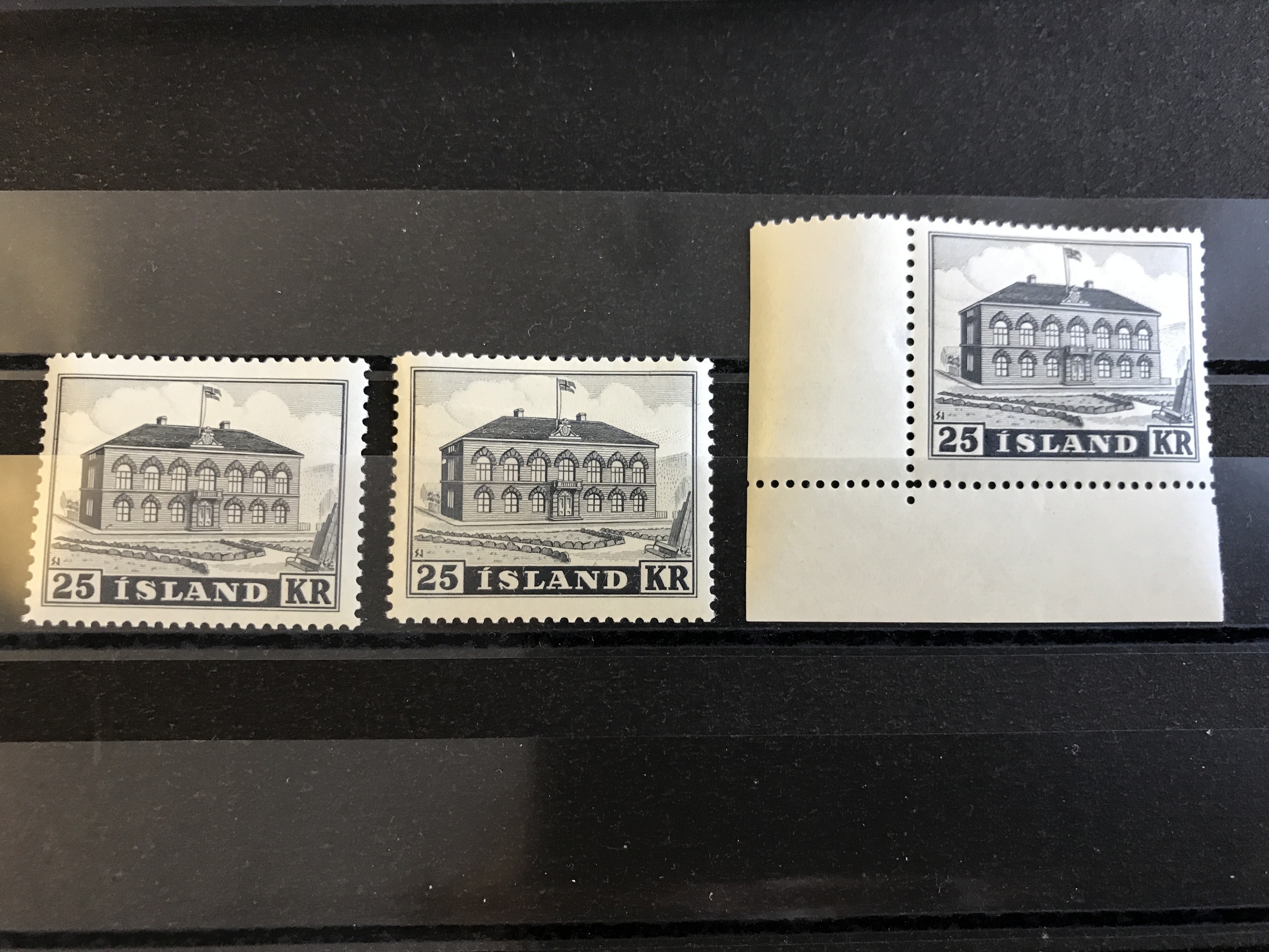 Iceland. Facit 311 ★★, 1952 The Parliament Building 25 Kr grey. Three very fine copies incl. some with corner margin. SEK 4800