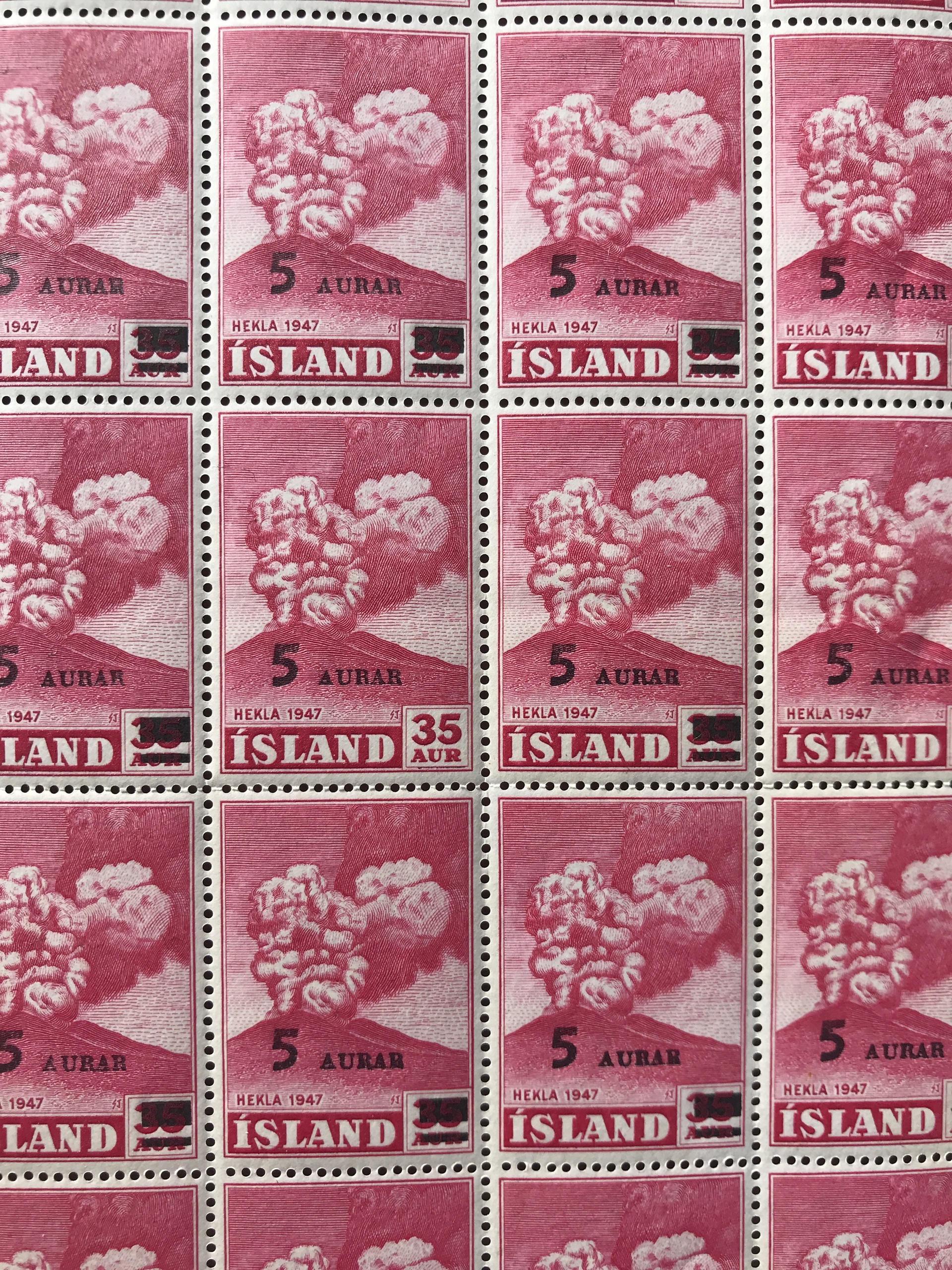 Iceland. Facit 326v2 ★★, 1954 Surcharge on Hekla 5/35 aur carmine bars missing (pos. 28) in a block with 40 stamps.