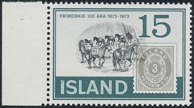 Iceland. Facit 511v1 ★★, 1973 The Stamp Jubilee 15 Kr with the horses displaced into the 3-sk stamp.