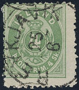 Iceland. Official Facit Tj3 used, 1873 Number in frame 4 sk green, perf 12½. Cancelled to order. SEK 3800